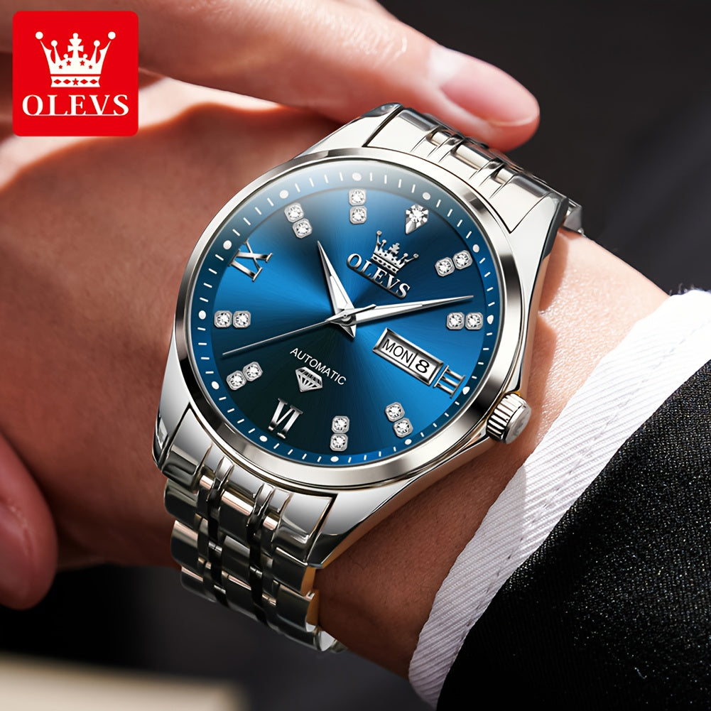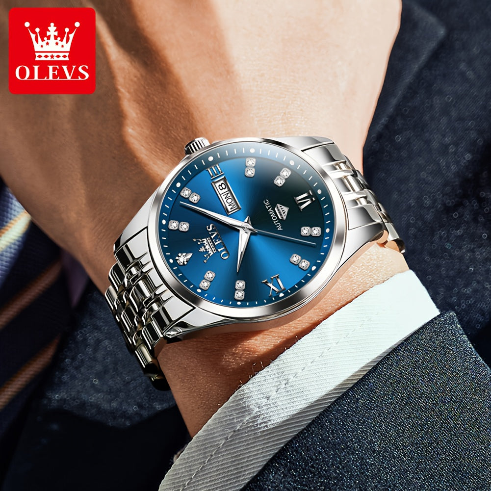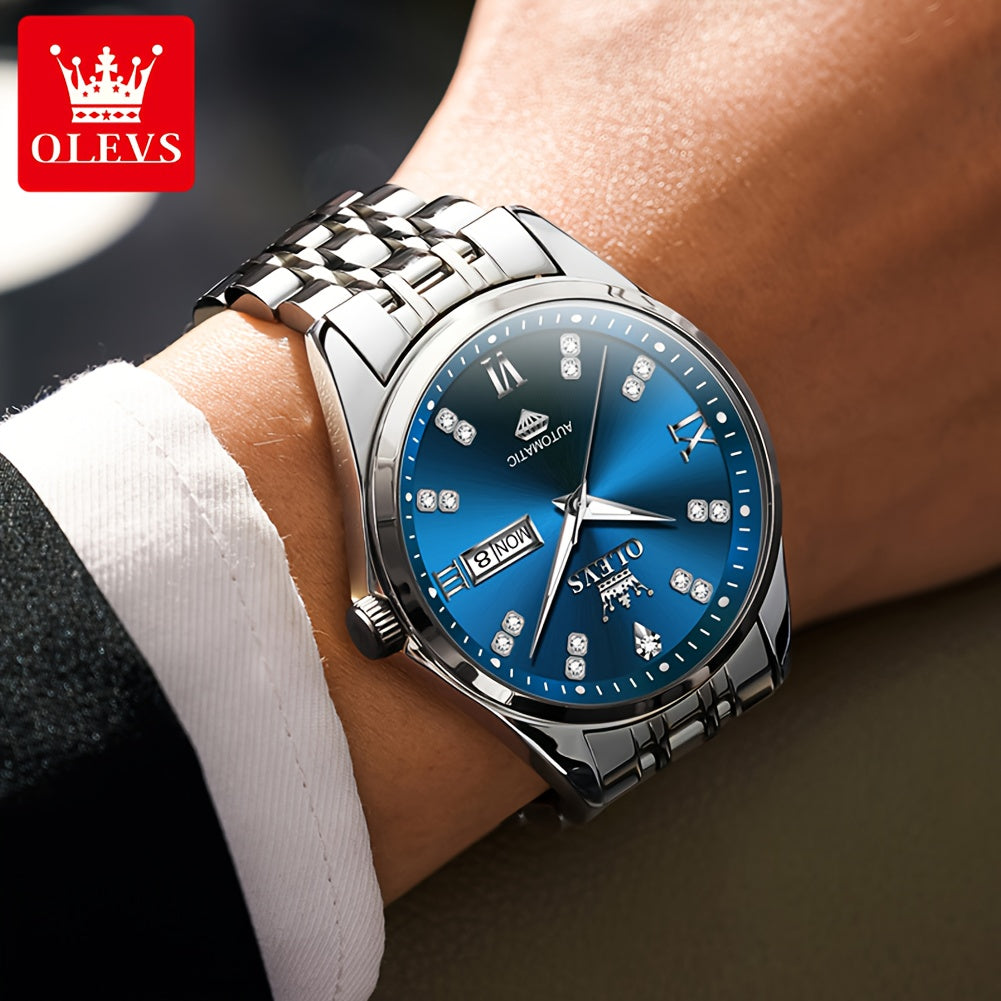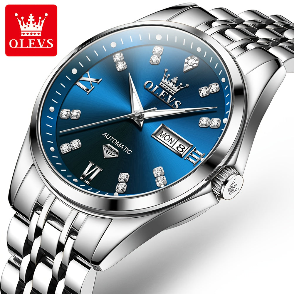 OLEVS Men'S Stainless Steel Automatic Mechanical Watch - Dual Calendar, Luminous Blue Dial with Date Display, Business Casual Style, Round Case & Bracelet, Battery-Powered, Business Casual Watch|Luminous Dial|Durable Watch, Without Battery