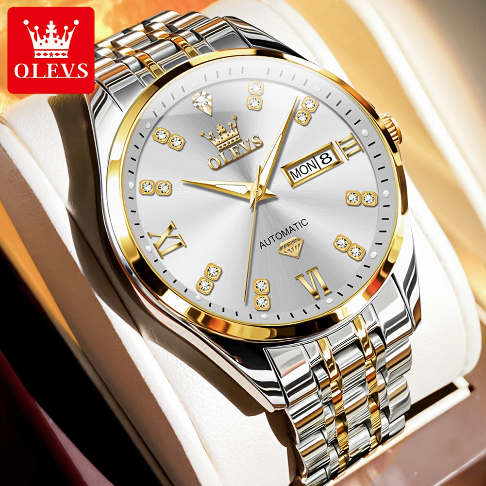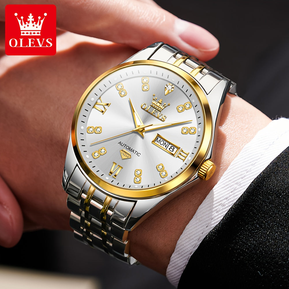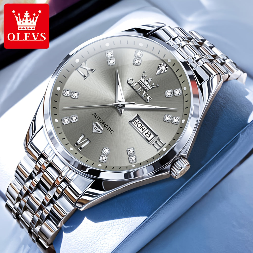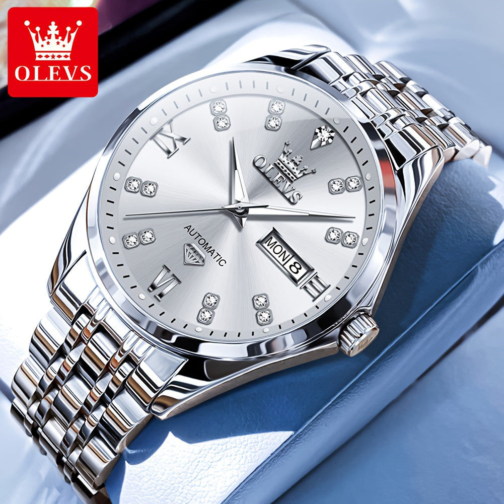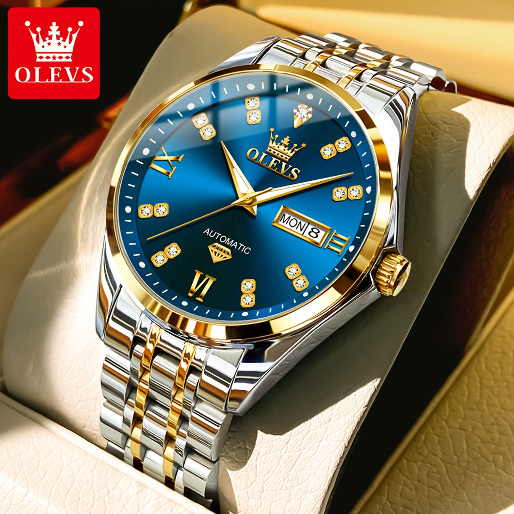 OLEVS Men'S Stainless Steel Automatic Mechanical Watch - Dual Calendar, Luminous Blue Dial with Date Display, Business Casual Style, Round Case & Bracelet, Battery-Powered, Business Casual Watch|Luminous Dial|Durable Watch, Without Battery