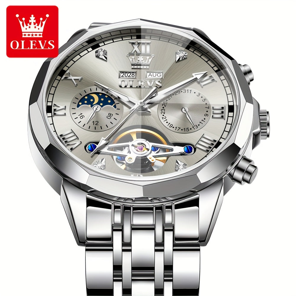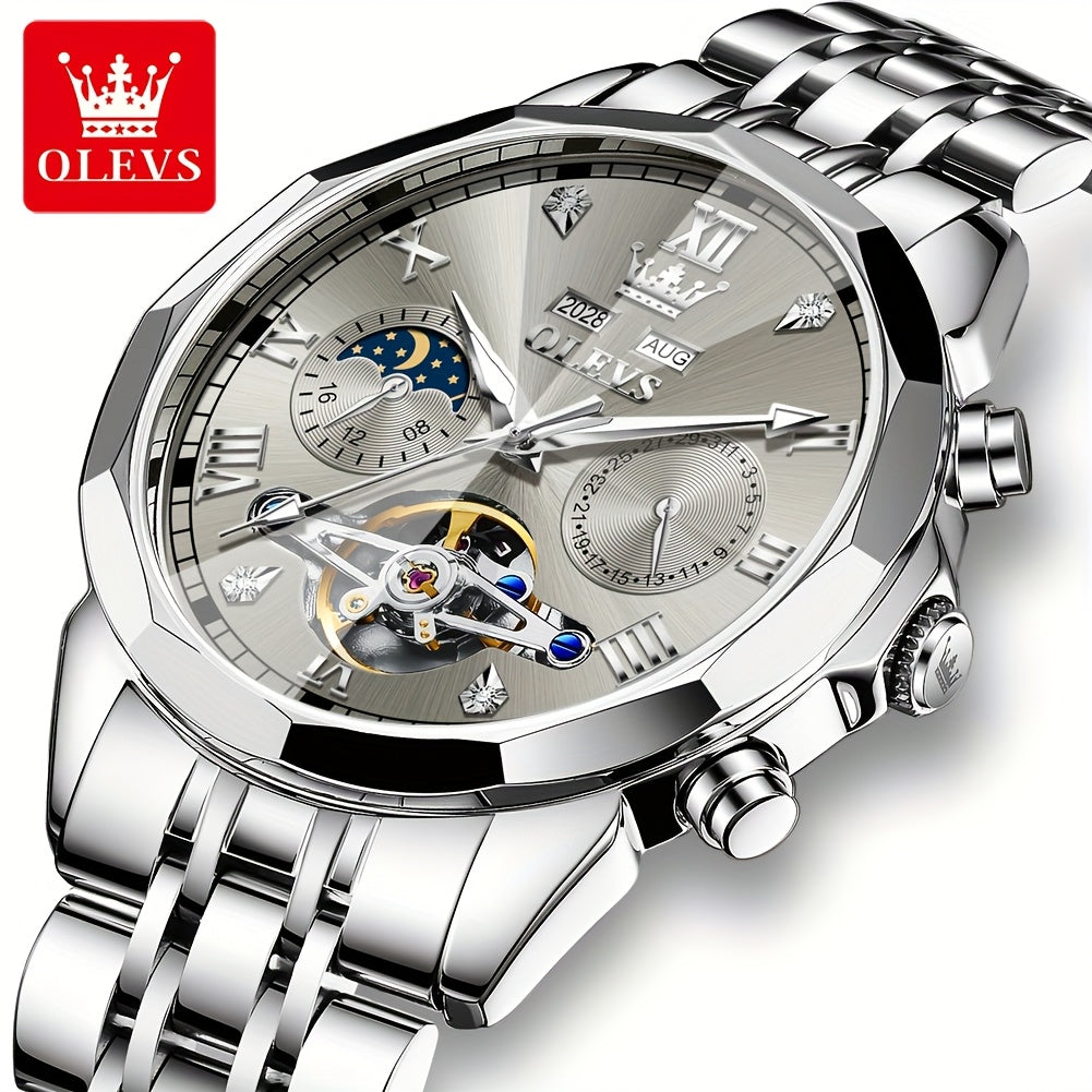 OLEVS Stainless Steel Luminous Automatic Mechanical Men's Watch with Date & Day Display, Moon Phase Indicator, Roman Numerals & Wave Pattern Dial - Business Luxury Watch for Formal Events, Mechanical Automatic Watch, Office Accessory, Classic Design, Prec