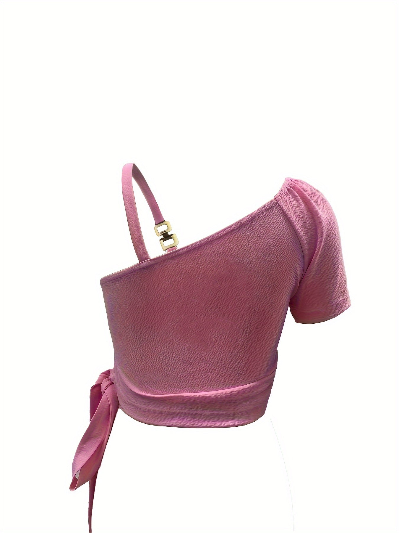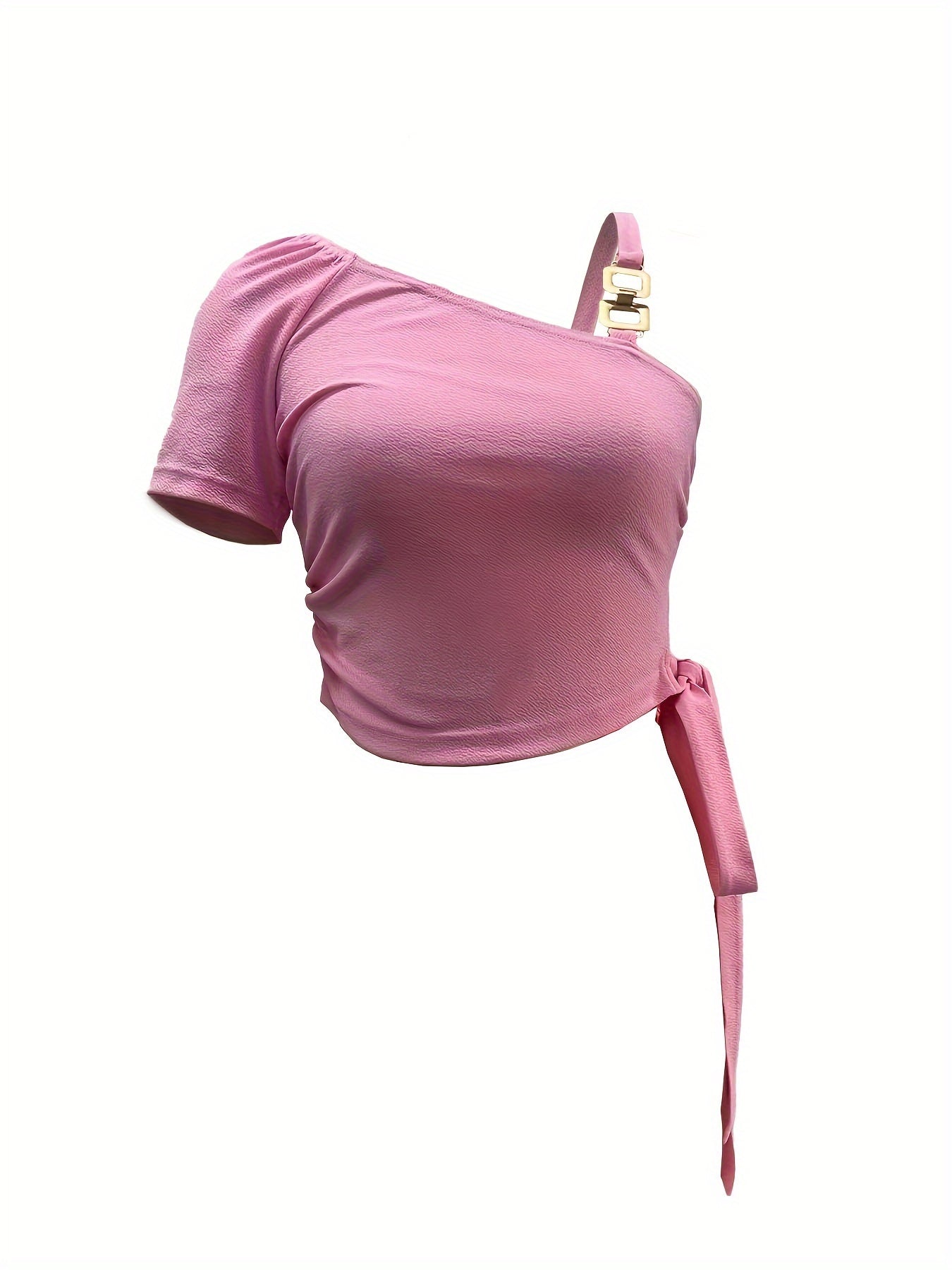 One Shoulder Crop T-Shirt, Chic Solid Color Short Sleeve with Chain Detail for Spring & Summer, Women's Clothing