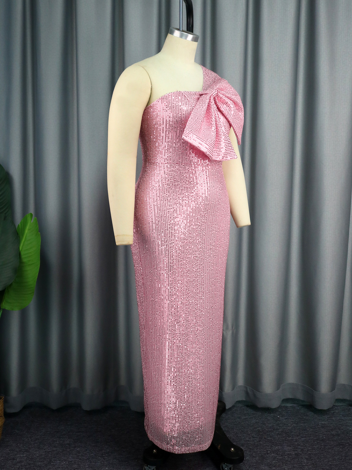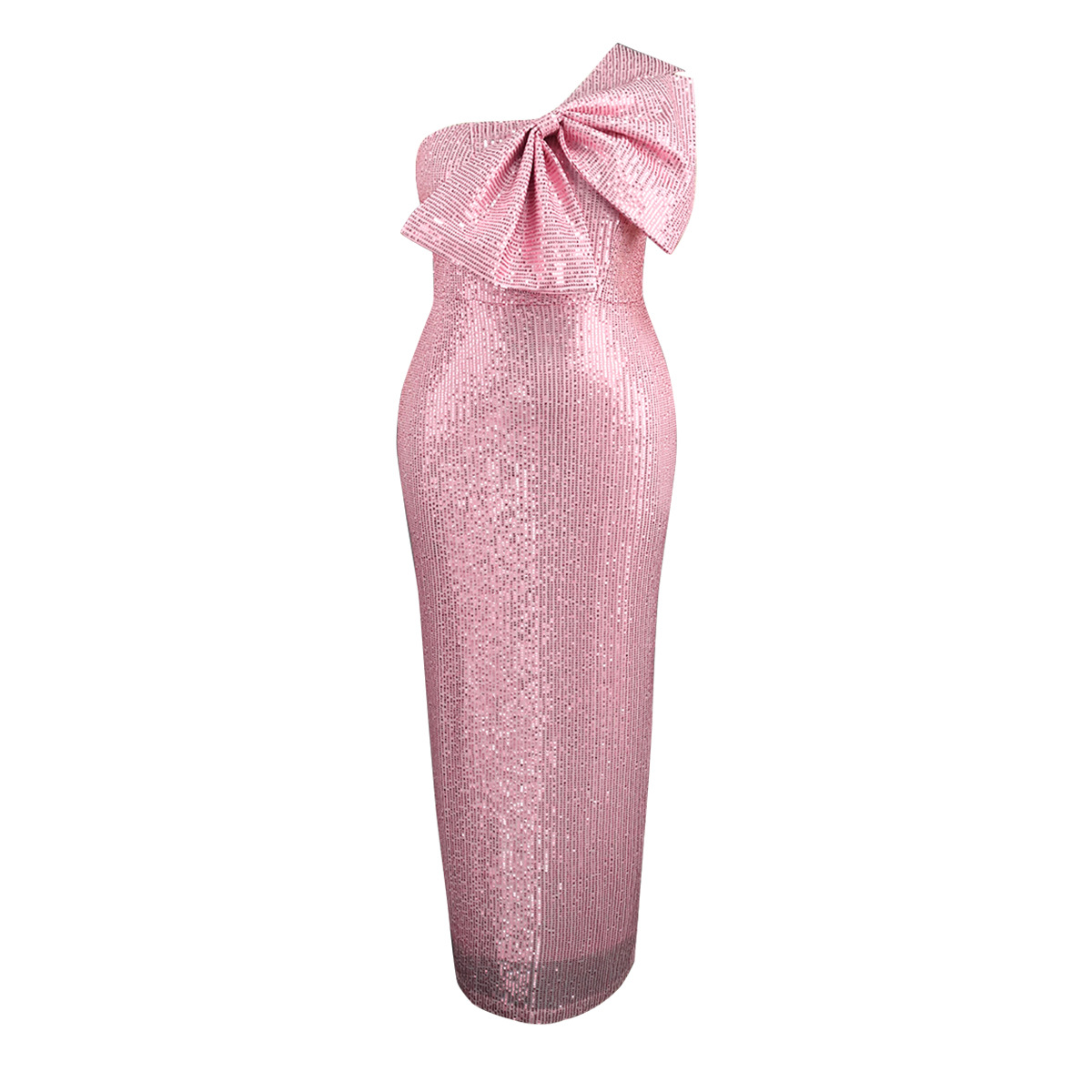 One Shoulder Diagonal Collar Sequ Dress Party Event Bow Wedding Bridesmaid Dress
