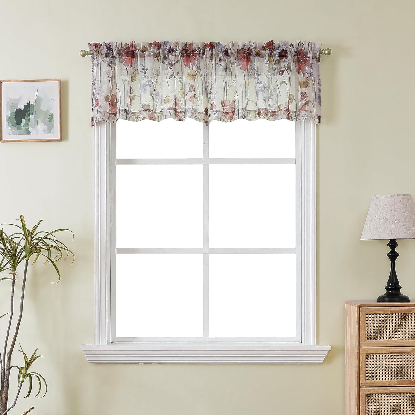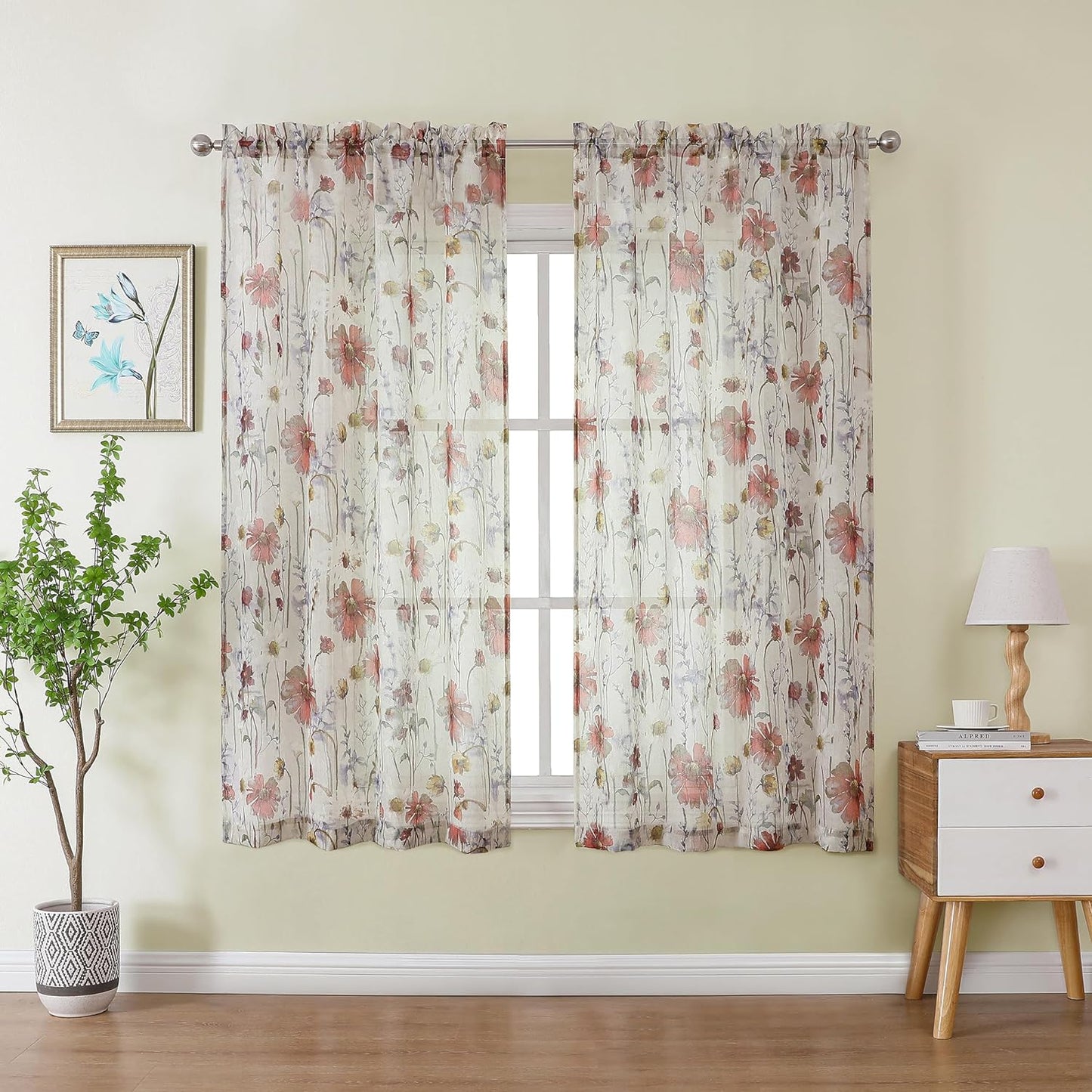 OWENIE Crushed Sheer Curtains 84 Inch Length 2 Panels Set, Sheer Floral Curtains Printed Drapes on Sheers for Living Room, Rod Pocket Light Filtering Window Sheers (2 Panels, 42" x 84")