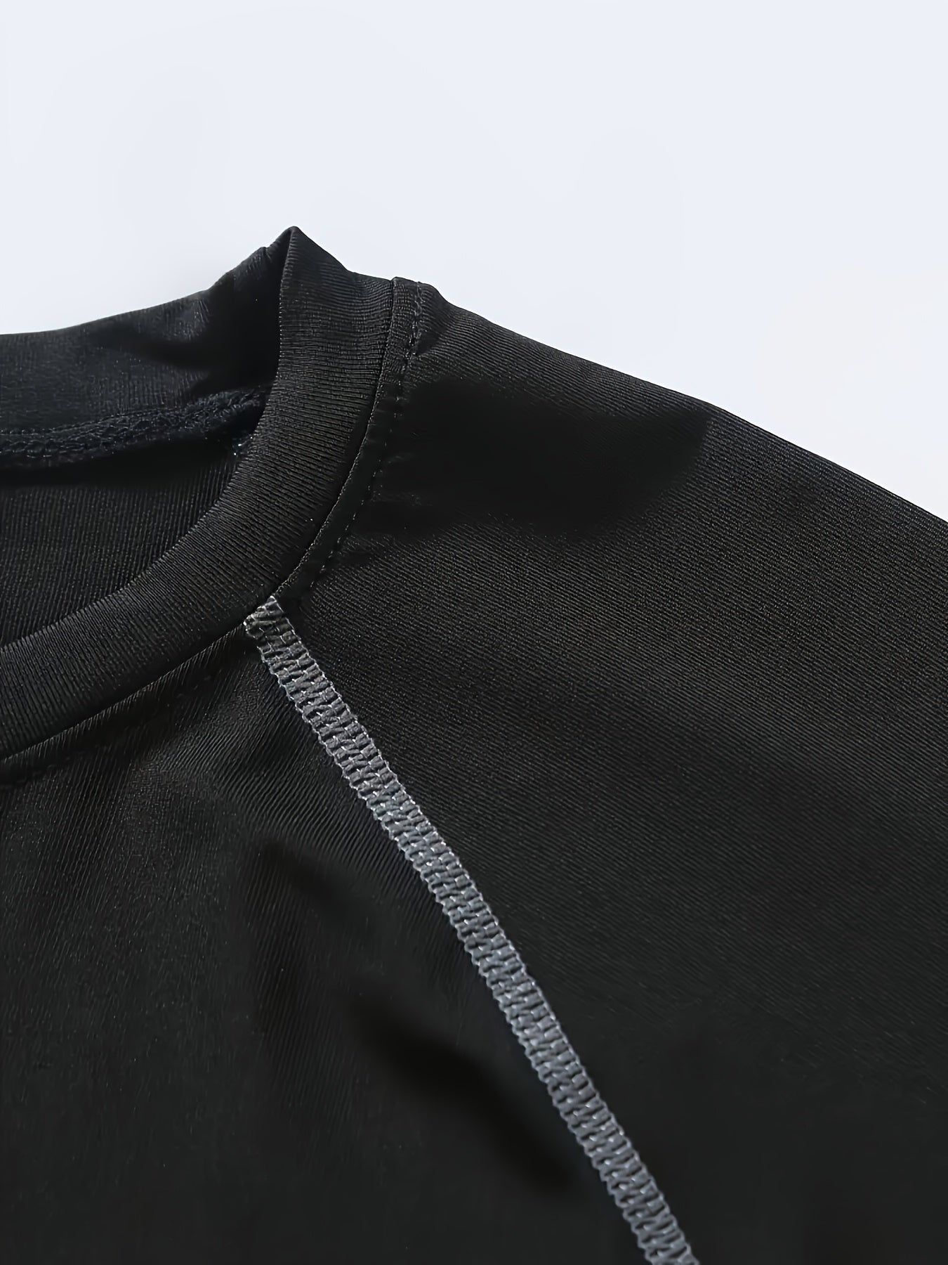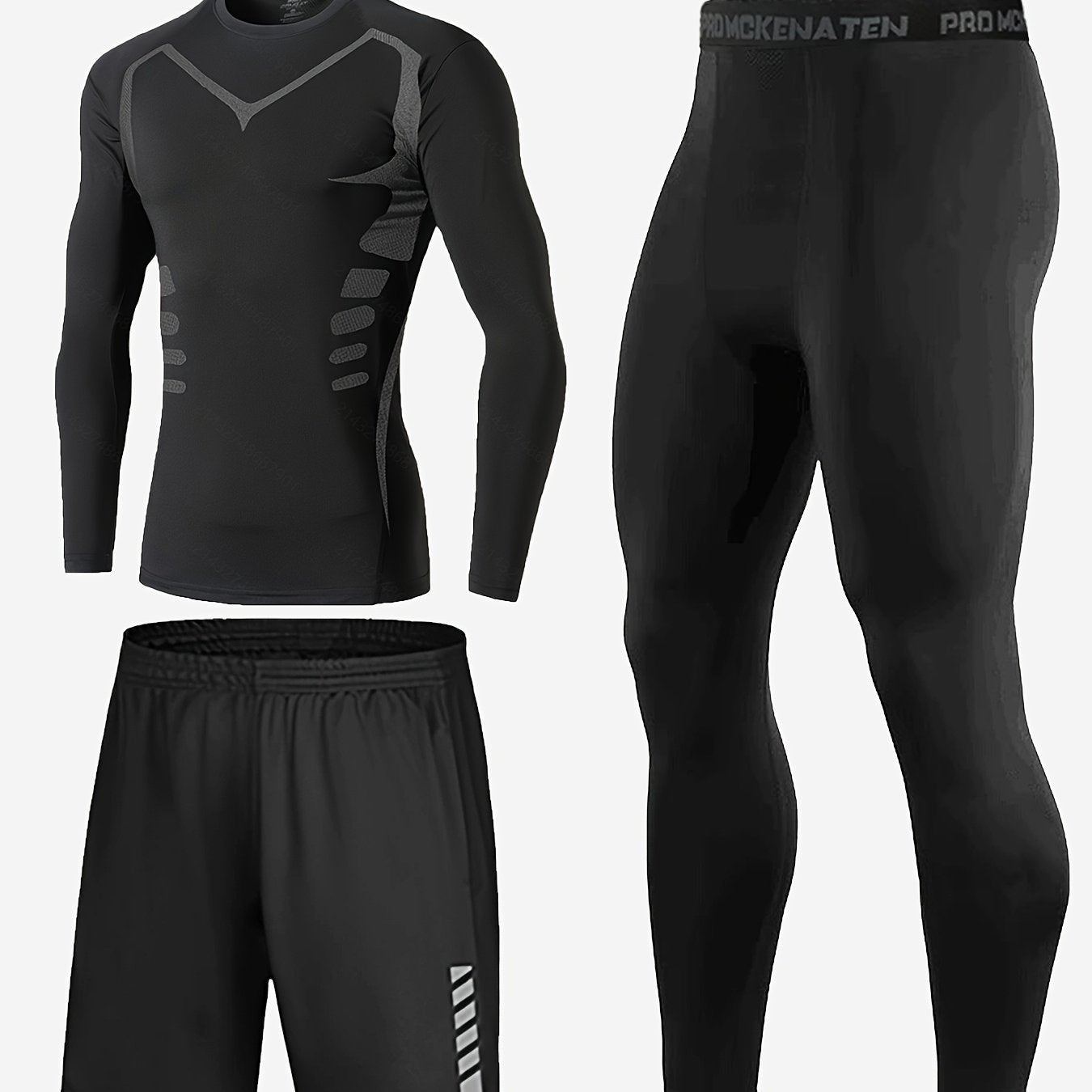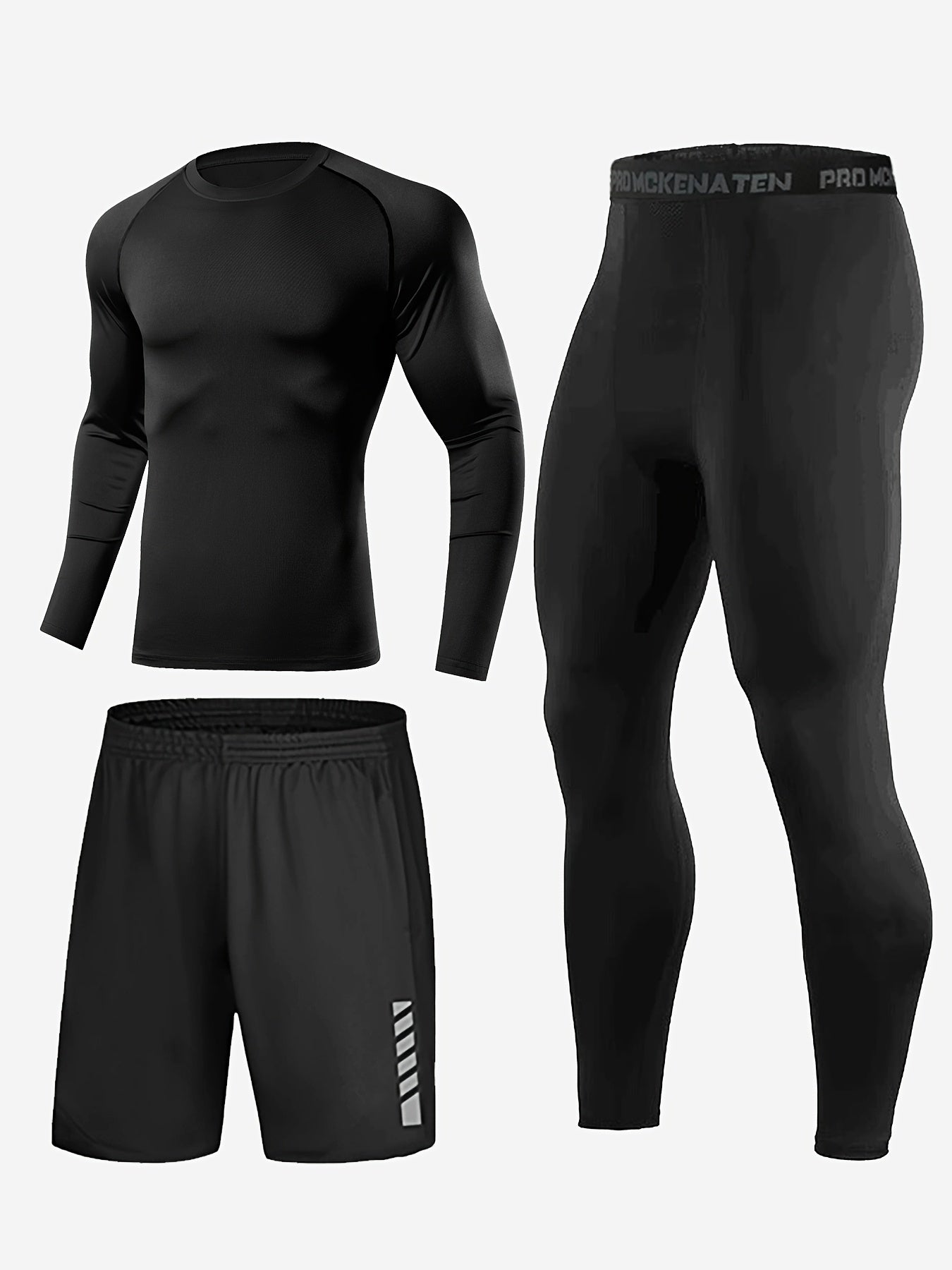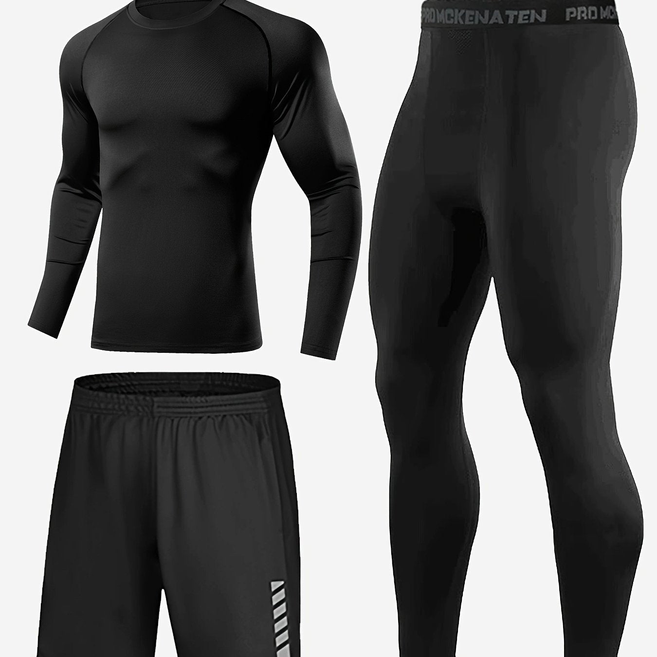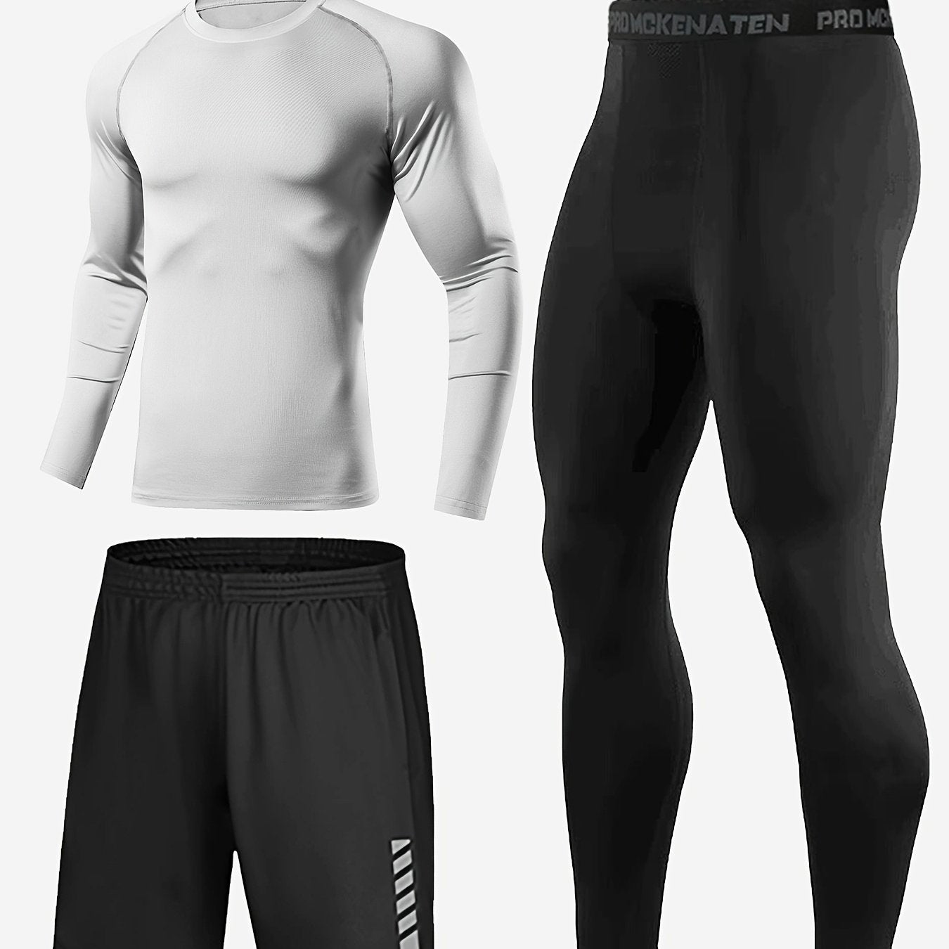 Pack of 3, including 1 long-sleeved shirt + 1 large shorts + 1 pair of trousers for Men's long-sleeve sweatshirt with solid muscle fit and high elasticity round neck, quick drying, sun protection, fast drying, suitable for running, fishing, cycling, sport