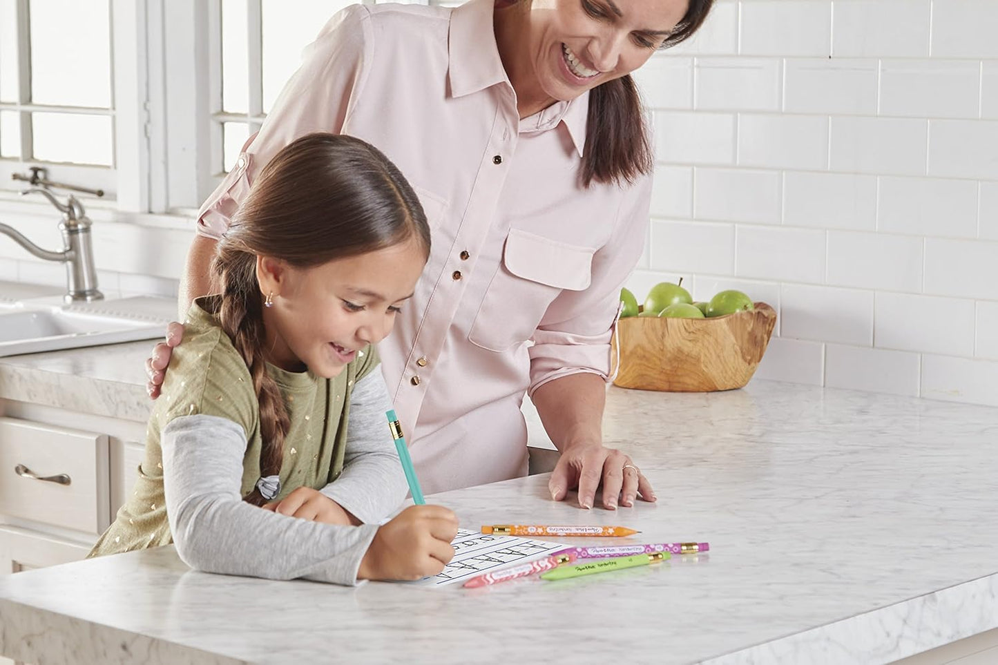 Includes 5 triangle pencils for kids in fun barrel colors, 1 lead refill set, and 2 erasers