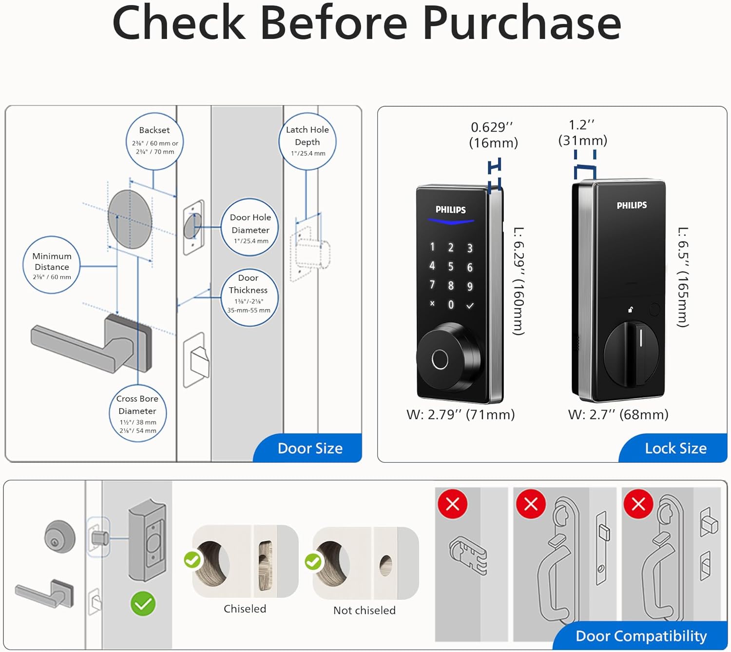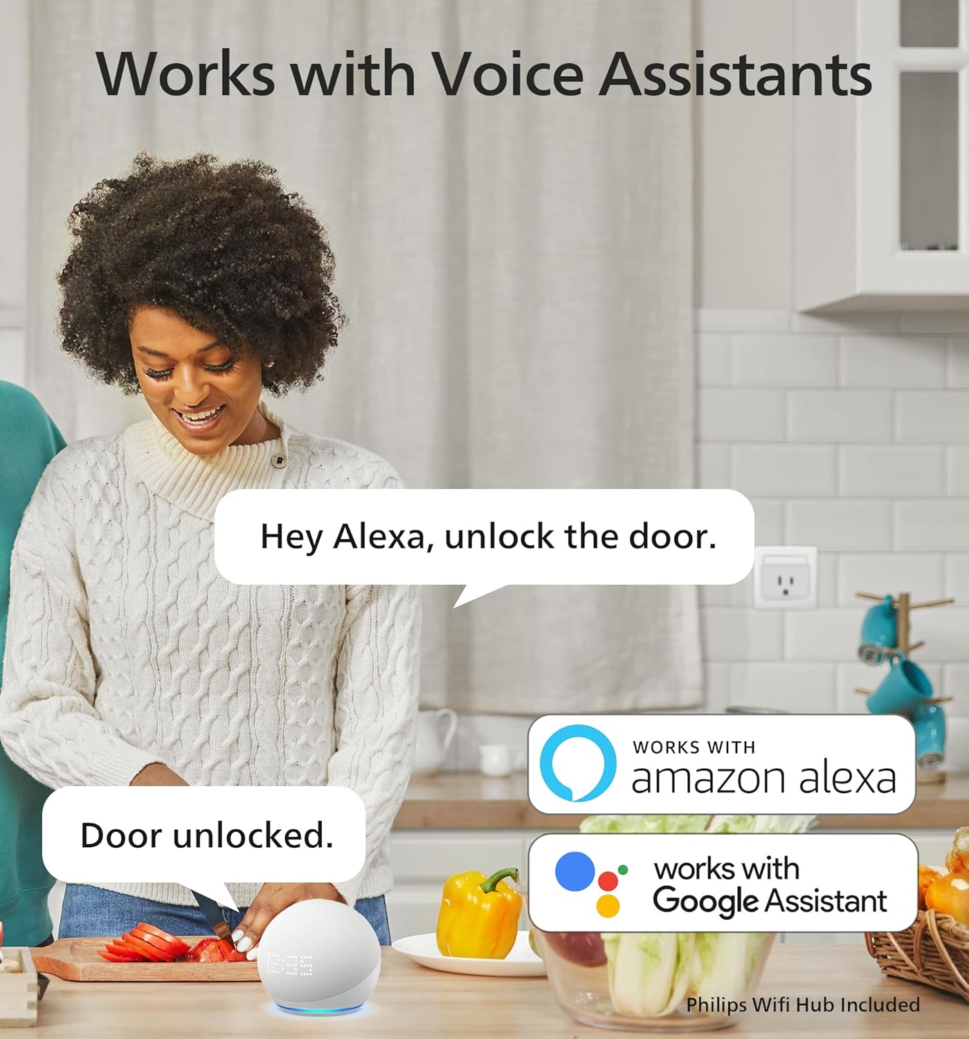 Multiple Ways to Unlock:Unlock with a touch for less than 0.3s with fingerprint lock.You can also open your front door lock via Philips Home Access app, using a PIN code or physical key, or use your voice with Alexa/Google Voice Assistant.Choose the method that suits your lifestyle and enjoy the convenience every time you come home.
