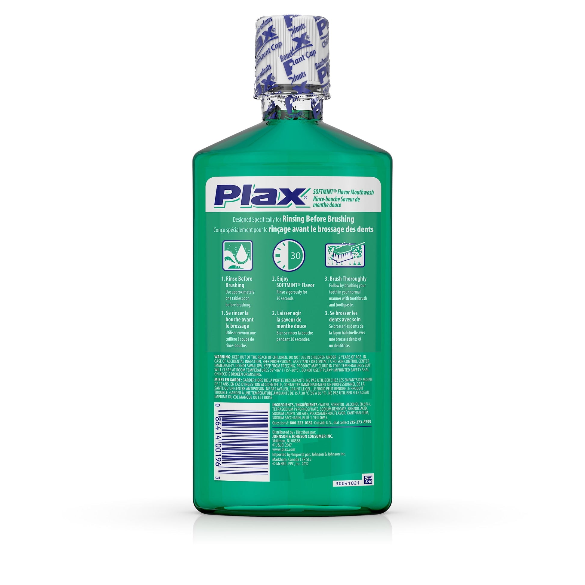 - Plax Oral Rinse in a refreshing and pleasant-tasting Soft Mint flavor