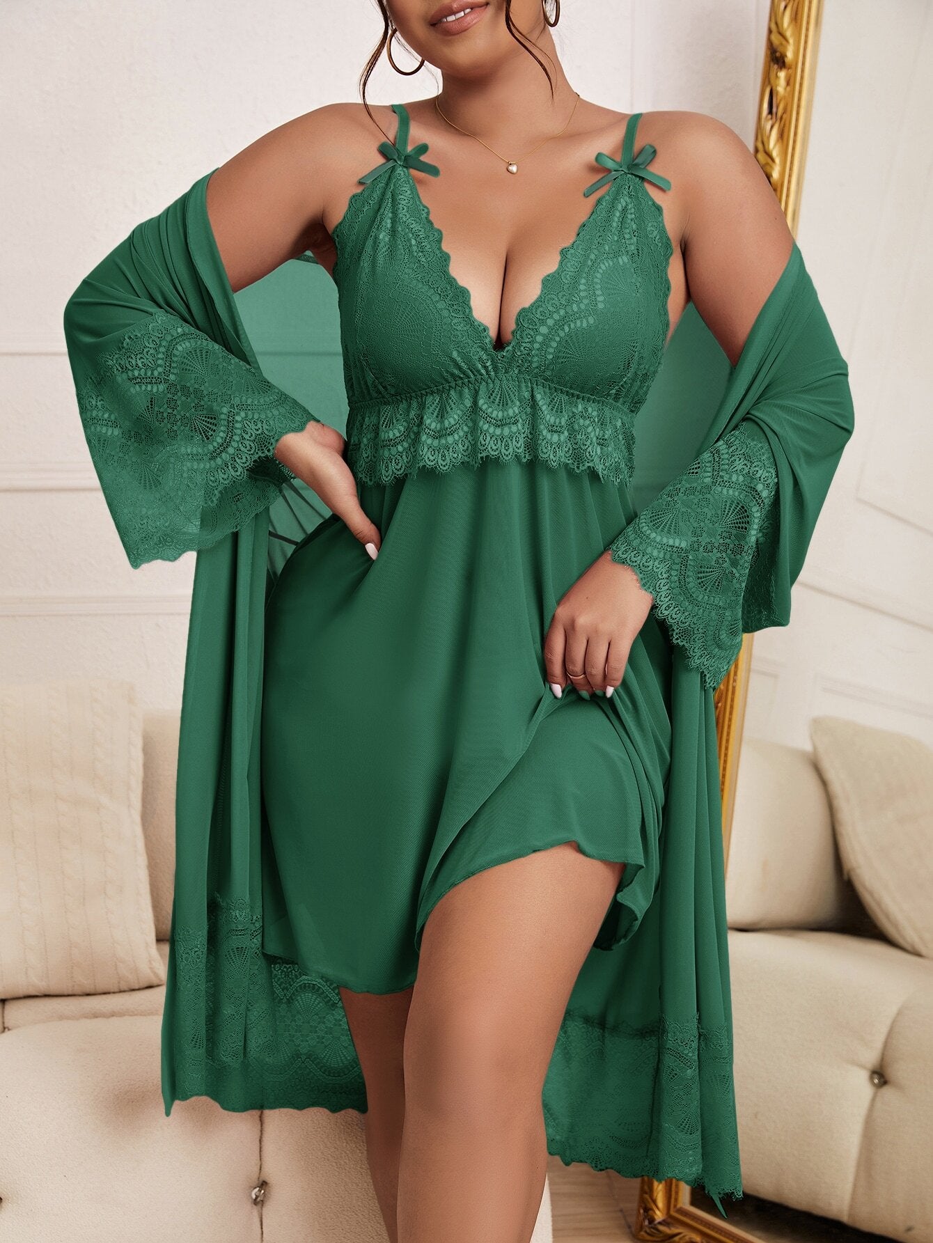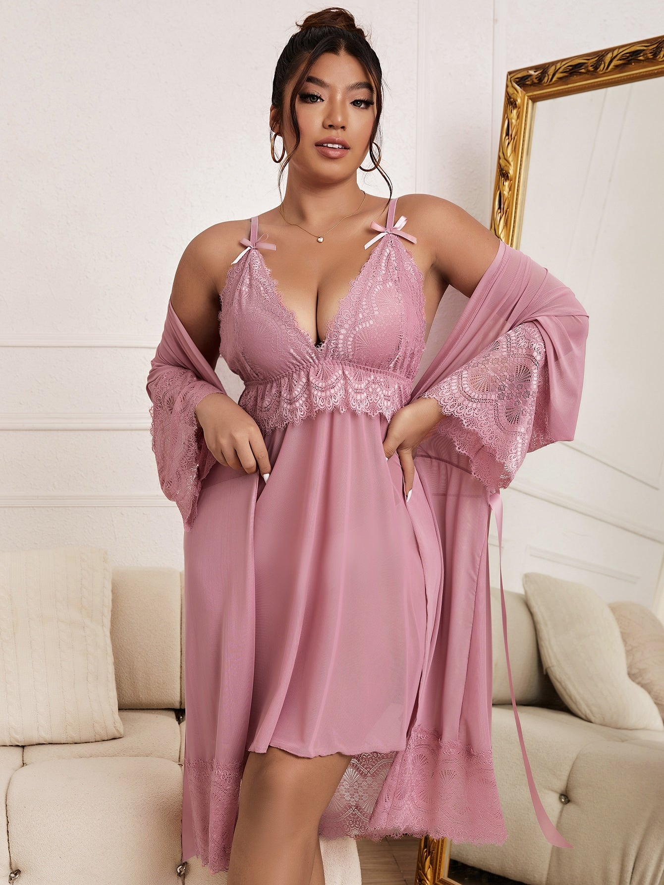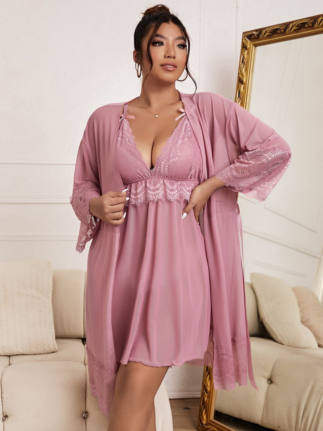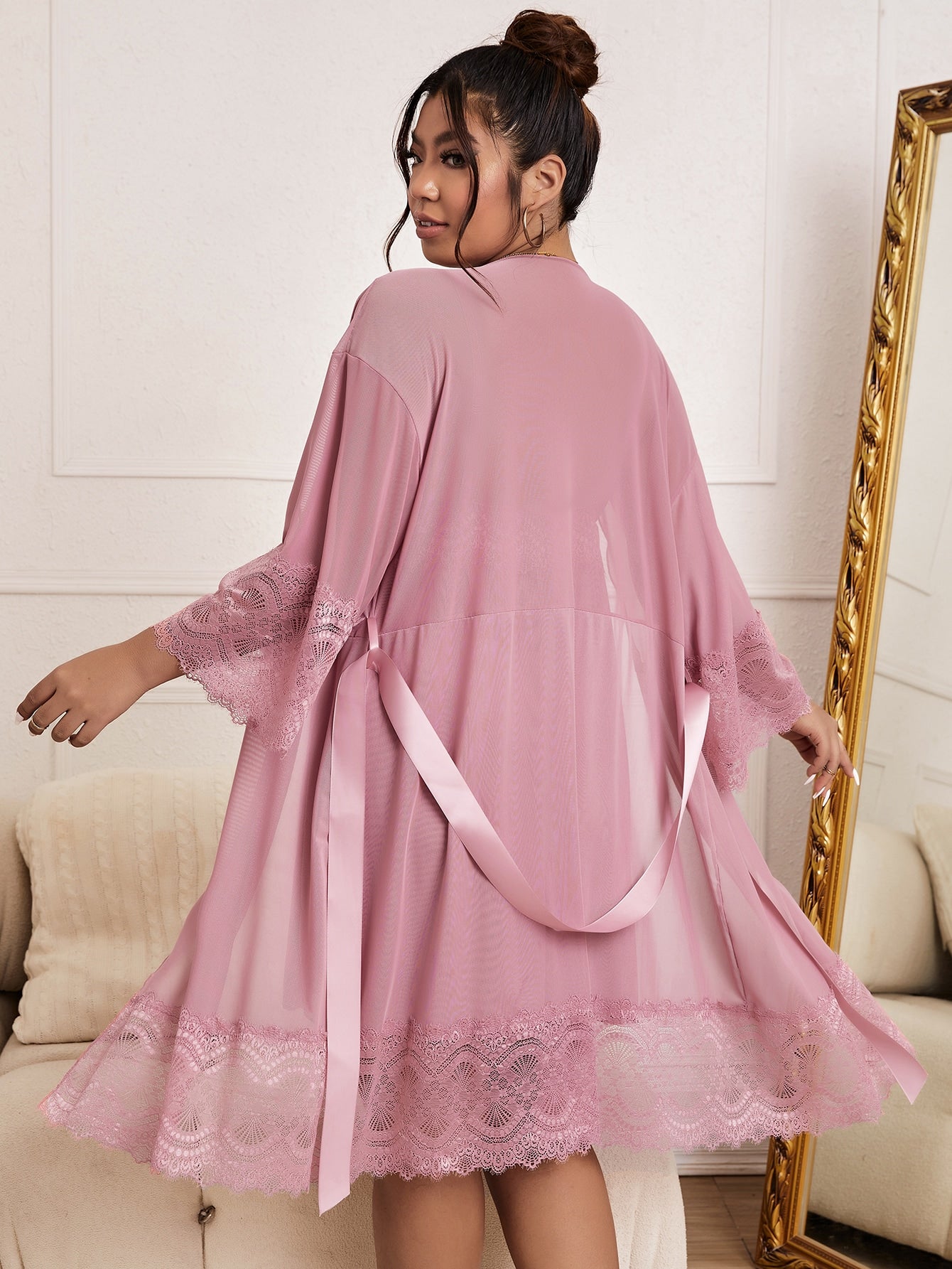 Plus Contrast Lace Mesh Robe & Cami Dress PJ Set / Pajama Set
