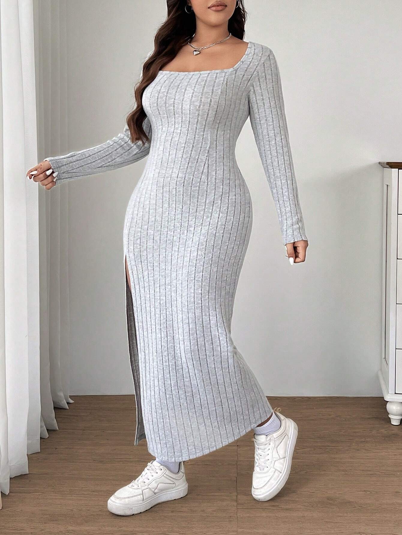 Plus Size Autumn Winter Women Simple Casual Dress Slim Fit Slit Midi Dress