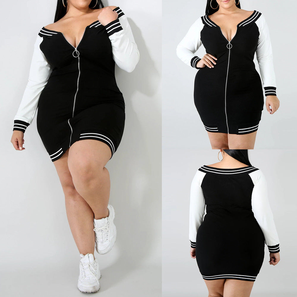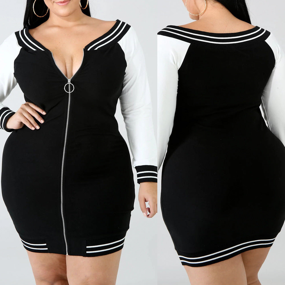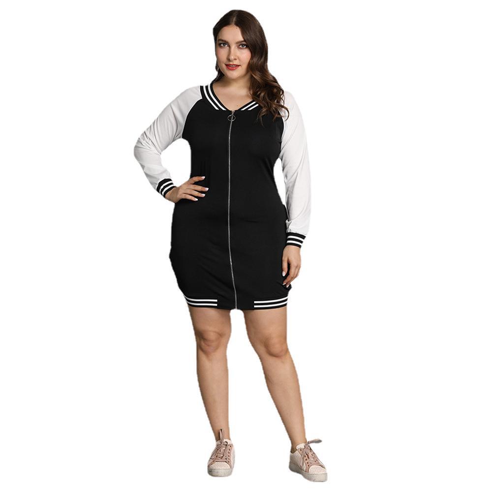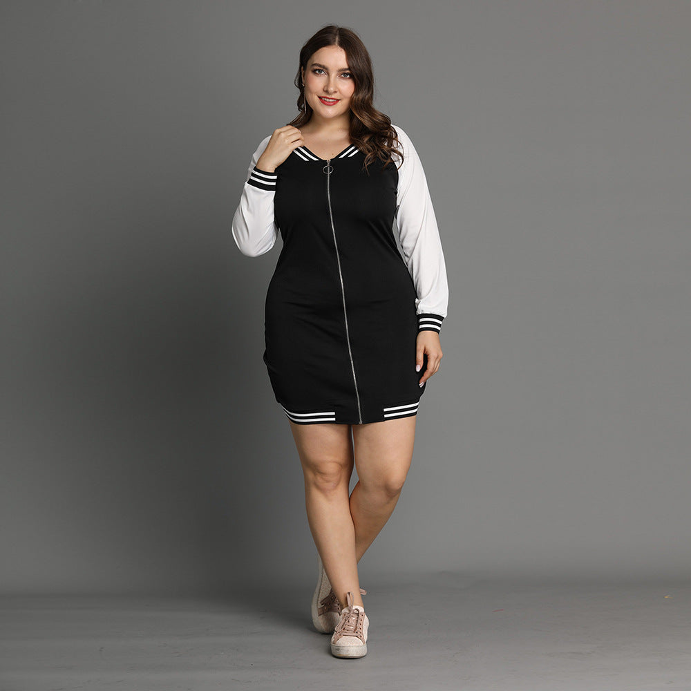 Plus Size Autumn Women Long Sleeve Color Zipper Dress Mid-Length