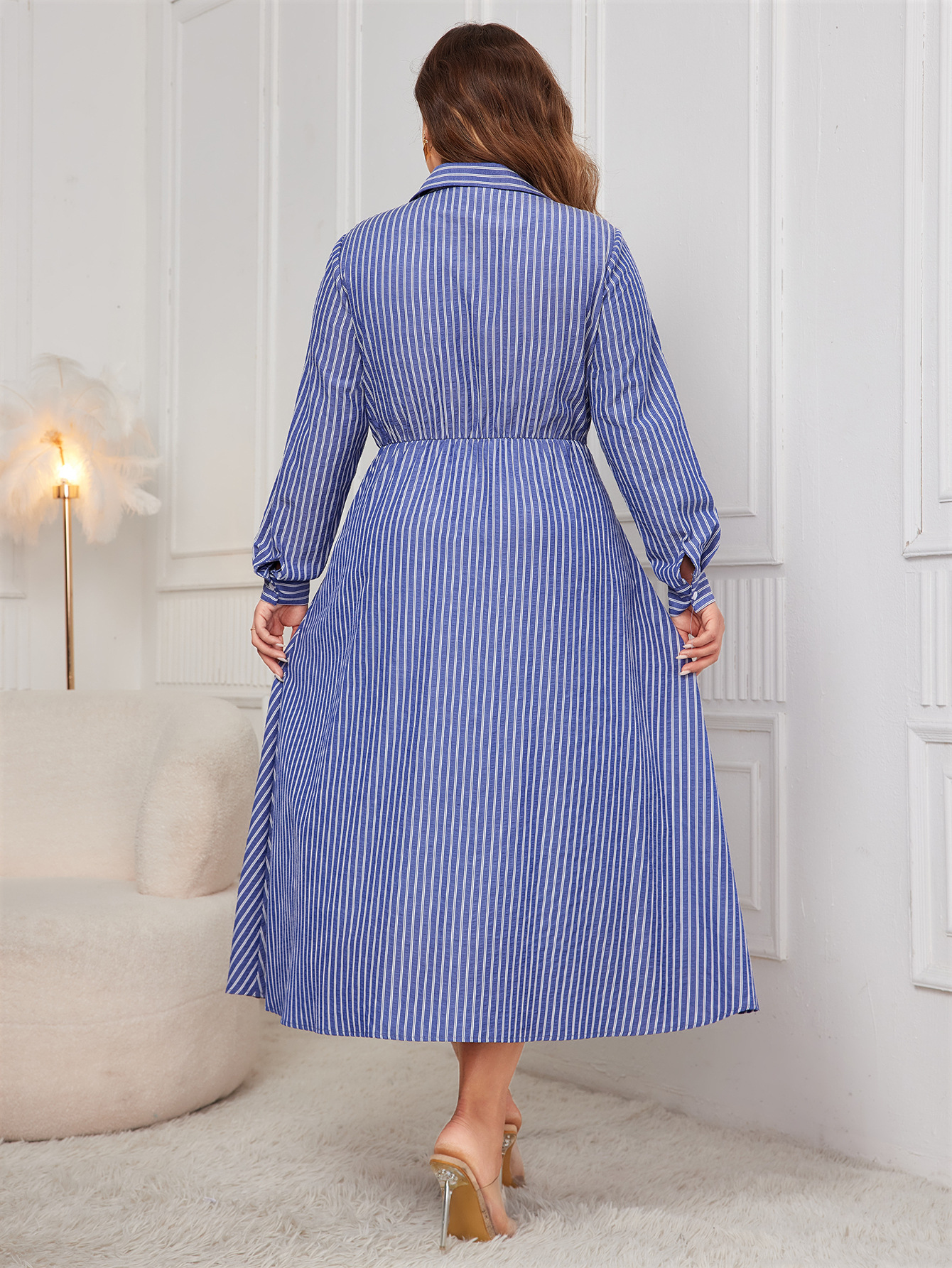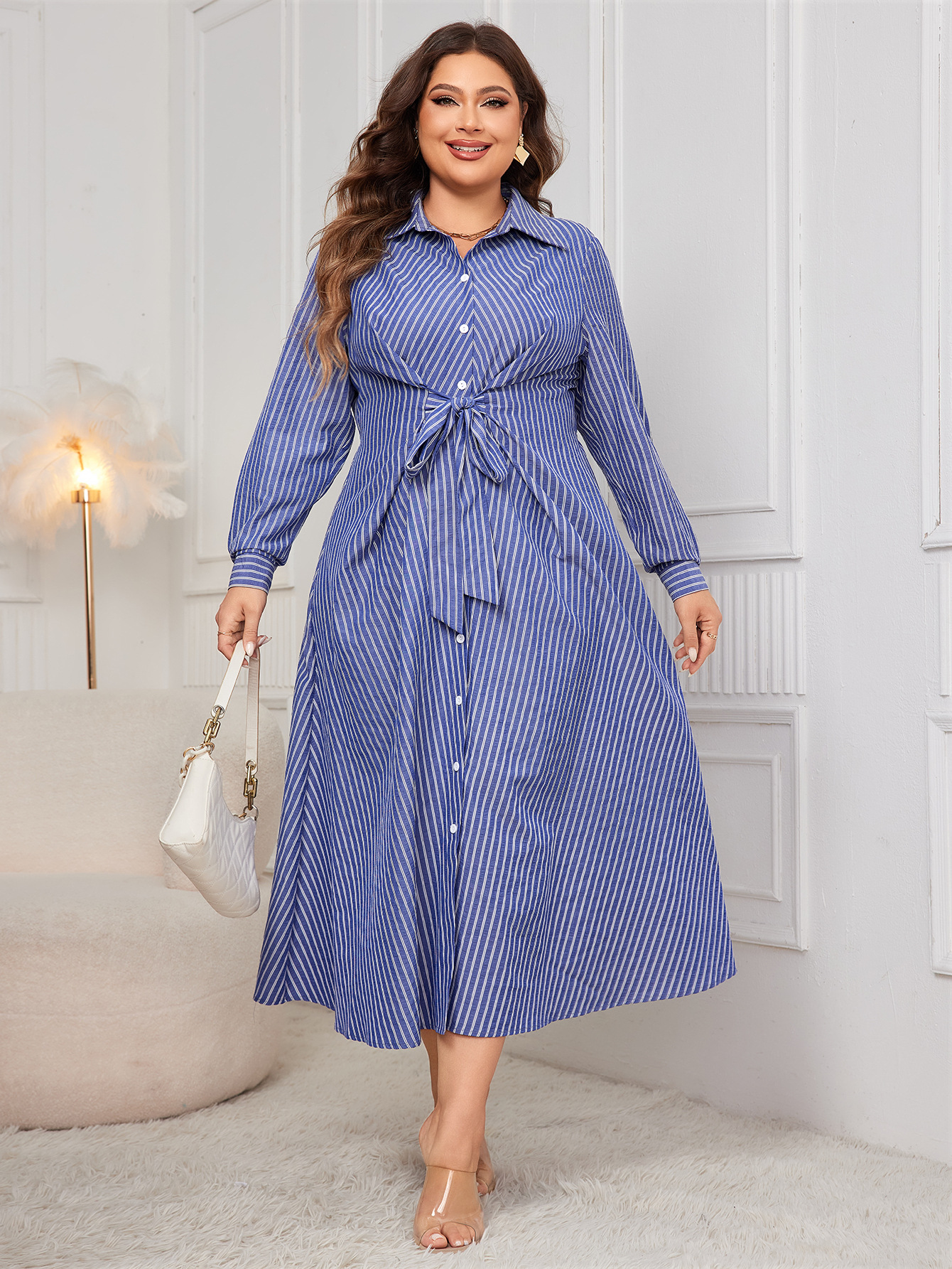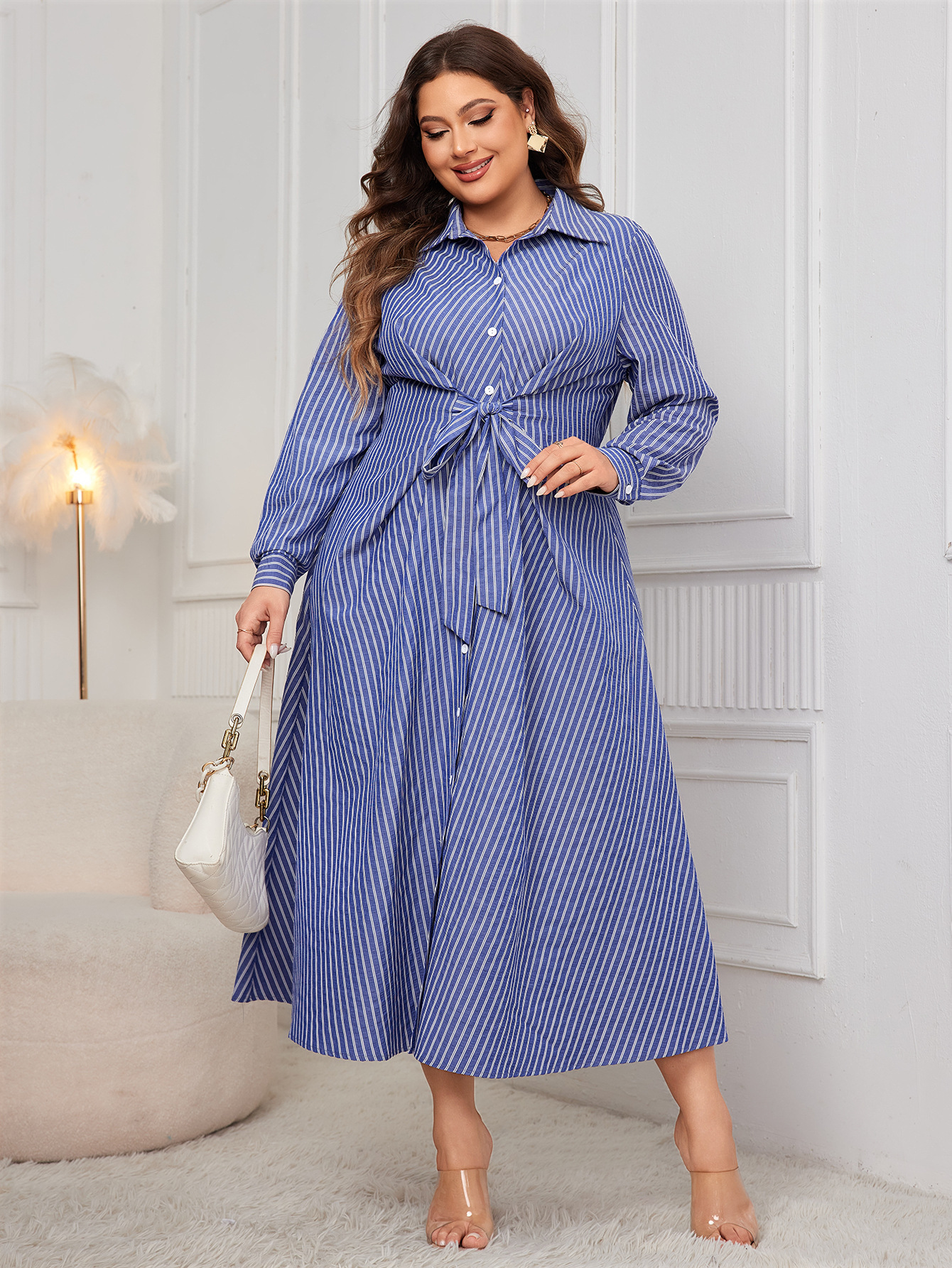 Plus Size Striped Lace up Slimming Dress Striped Long Sleeves Women Clothing Dress Women