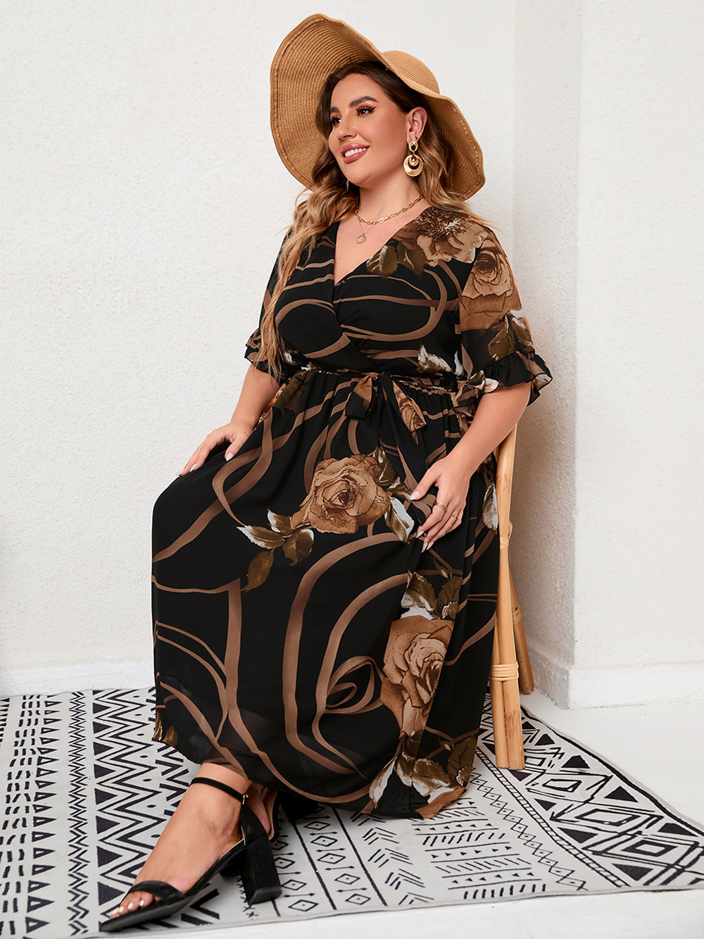 Plus Size Summer Ladies Printed V neck Bell Sleeve Large Swing Casual Vacation Dress