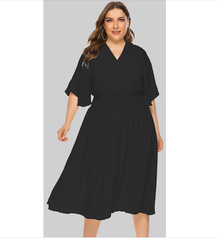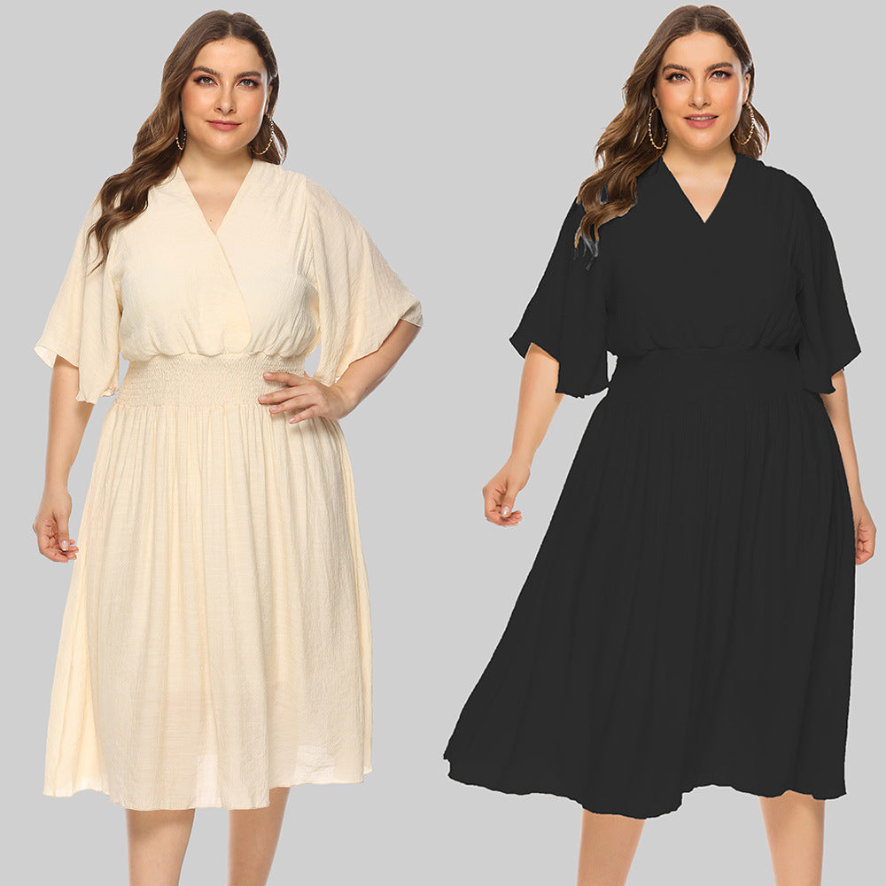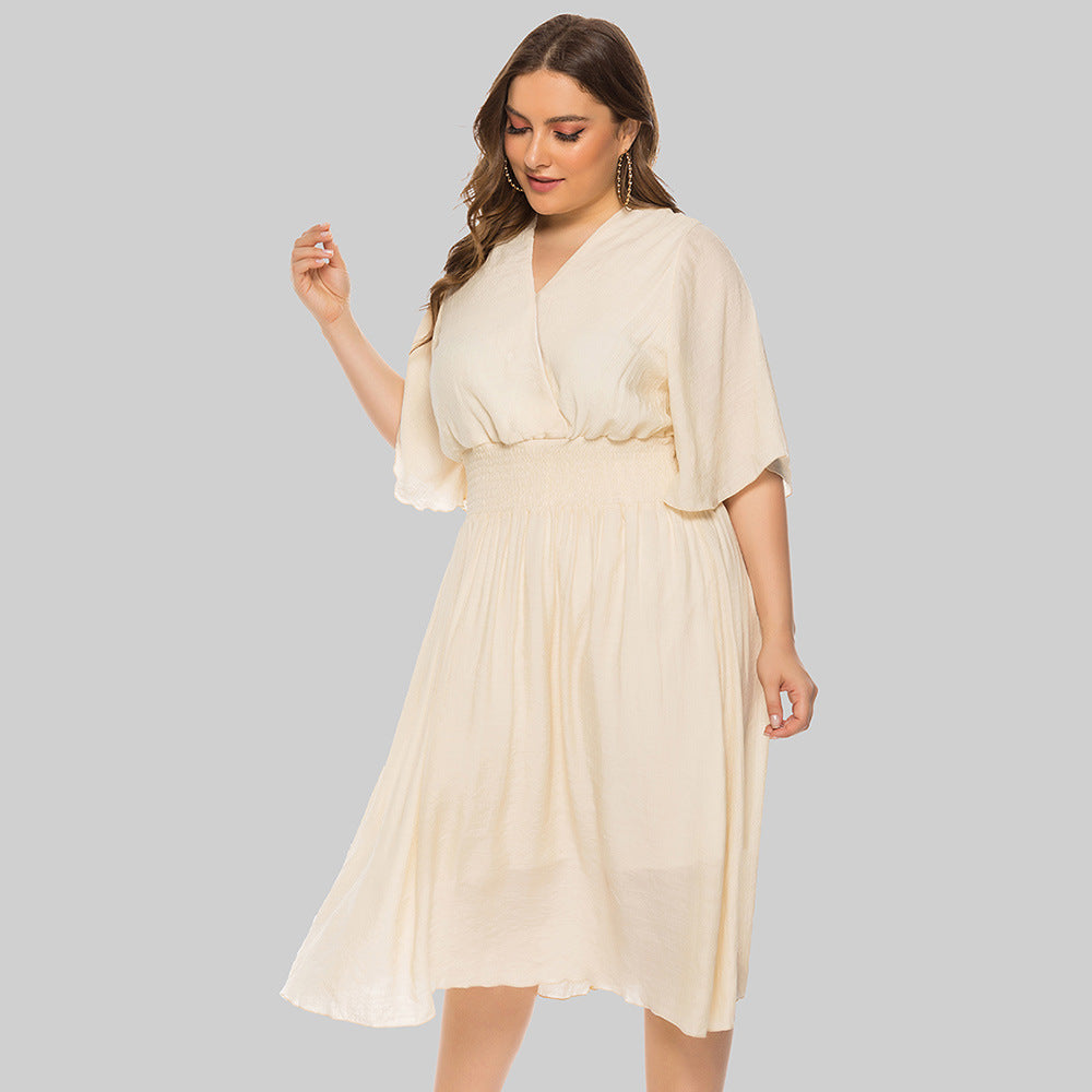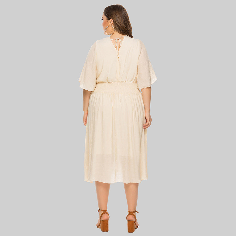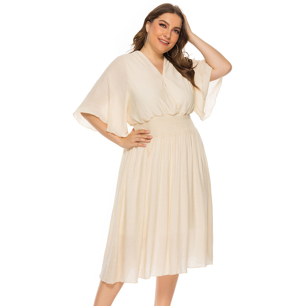 Plus Size Summer Women Clothing Solid Color V-neck Waist-Controlled Flying Sleeves Dress