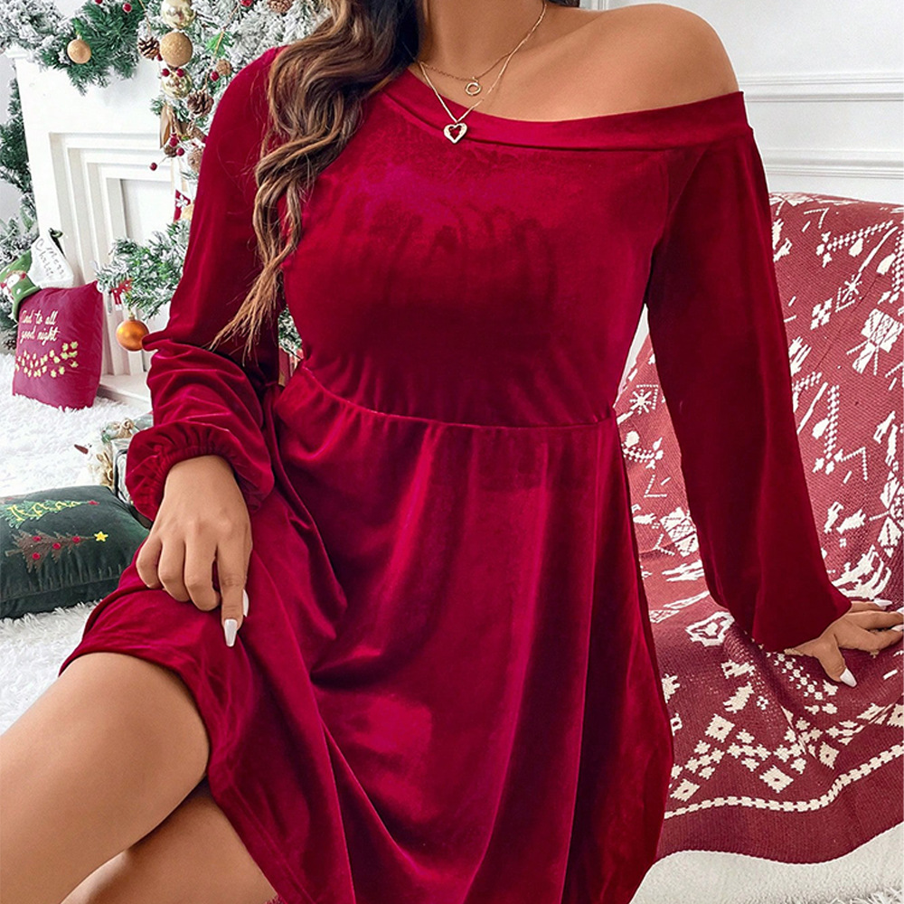 Plus Size Women Clothes Sexy Waist Trimming A Line Short Evening Dress Off Shoulder Long Sleeve Velvet Dress