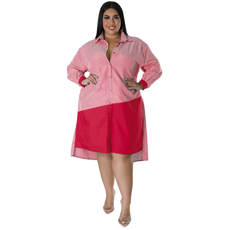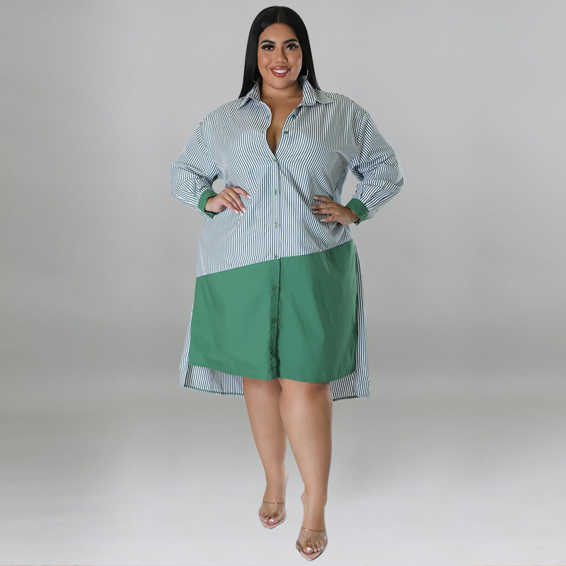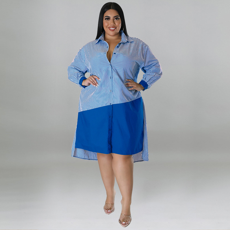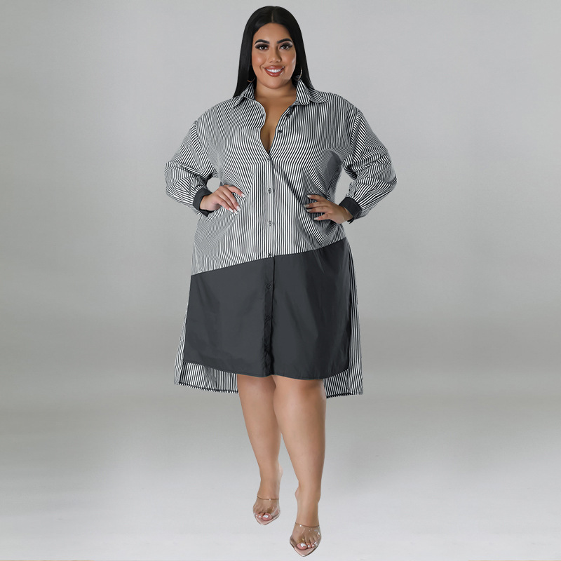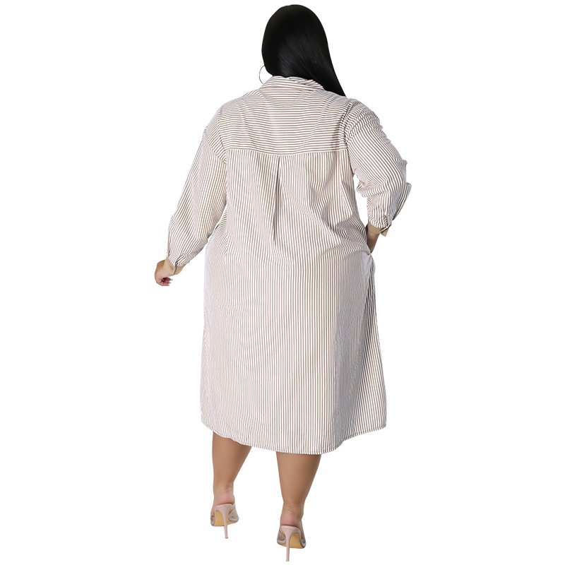 Plus Size Women Clothing Striped Long Sleeved Shirt Dresses