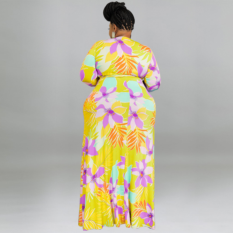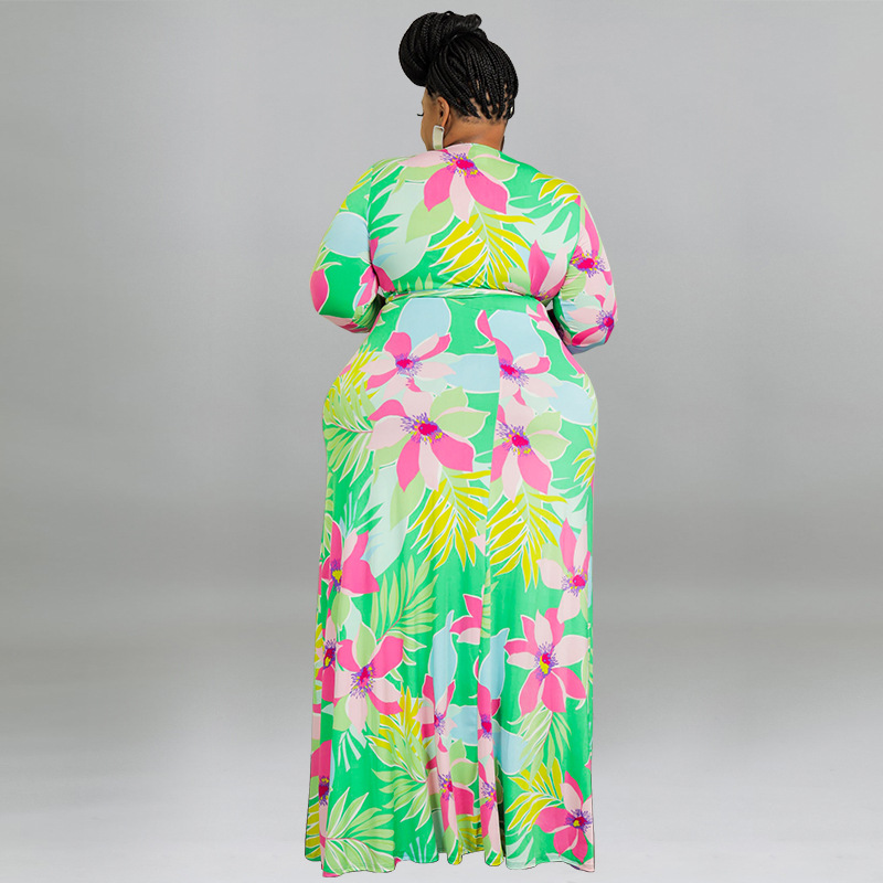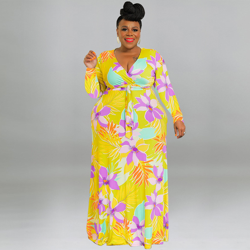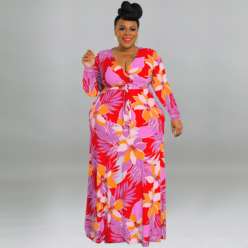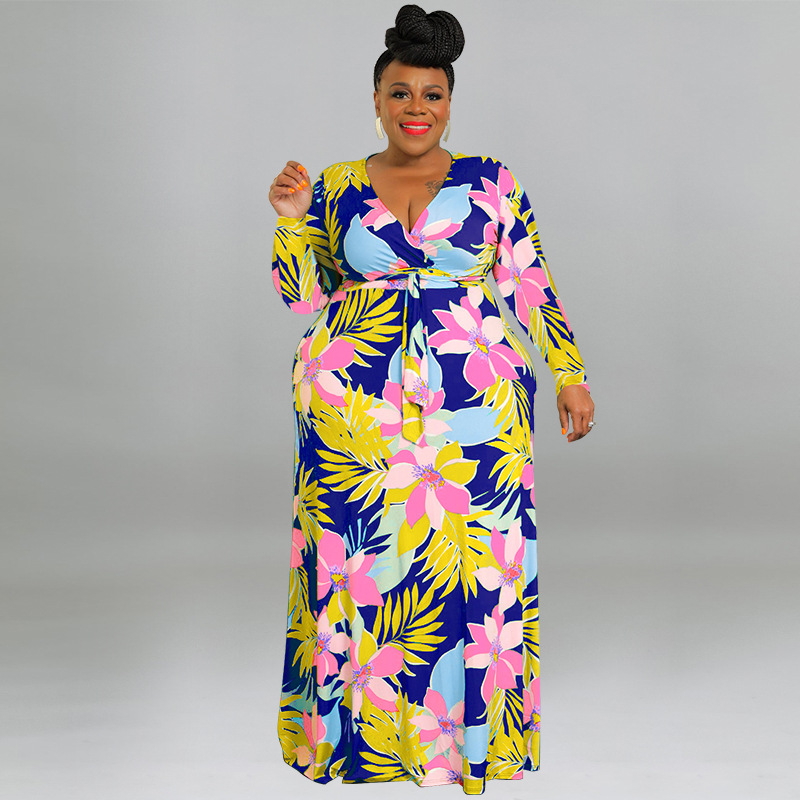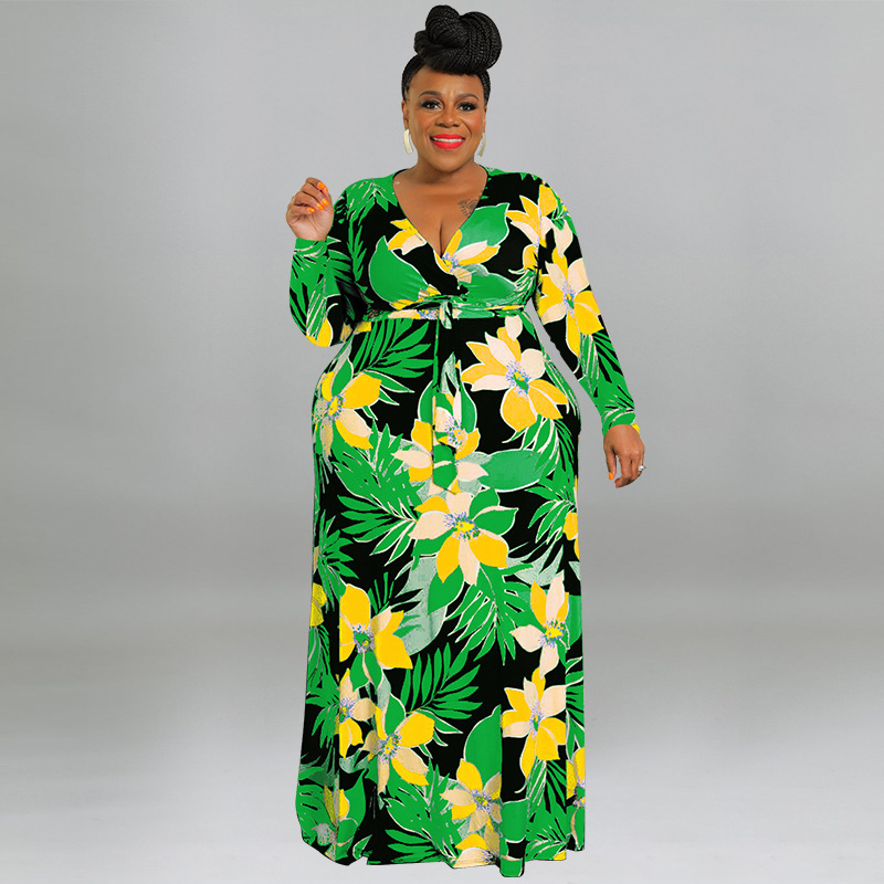 plus Size Women Printed Sexy V neck Lace up Waist Tight Dress
