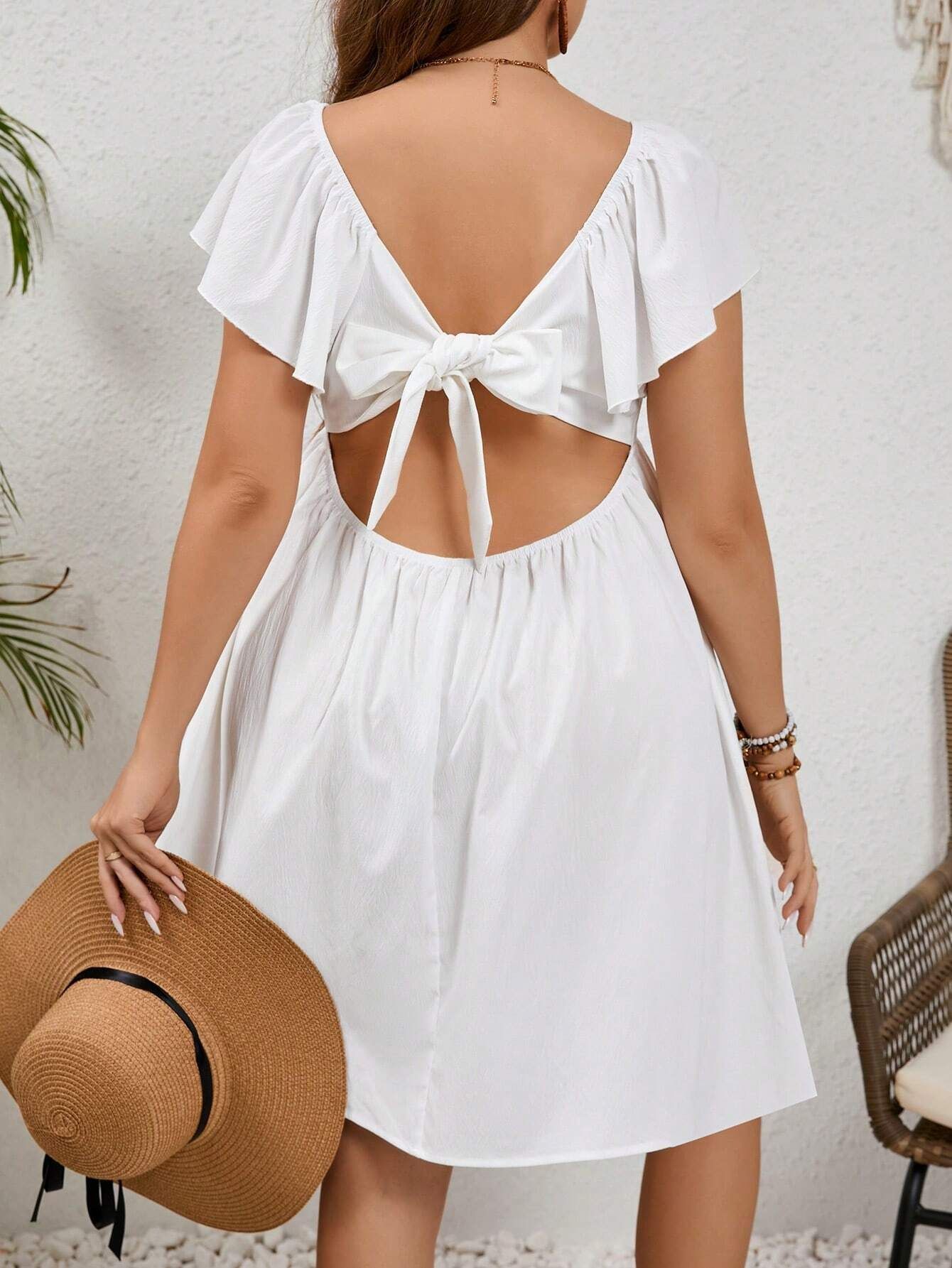 Plus Size Women Square Collar Ruffle Sleeve Backless Strap Casual Holiday Solid Color Dress
