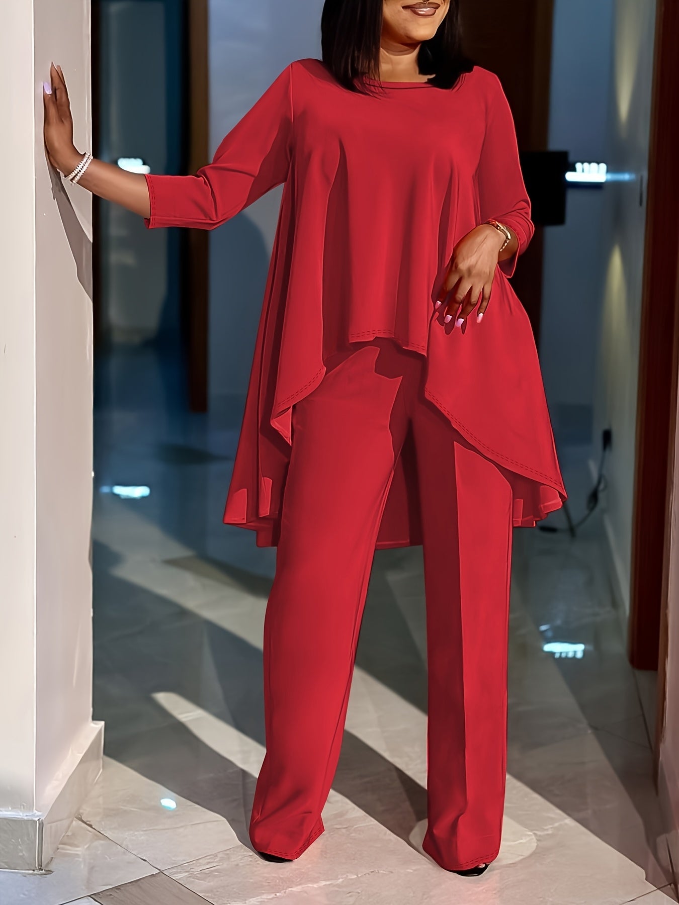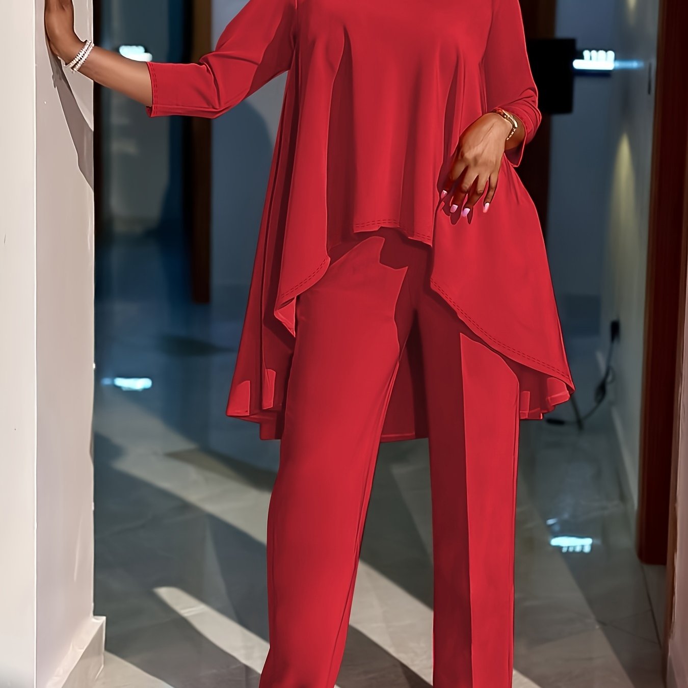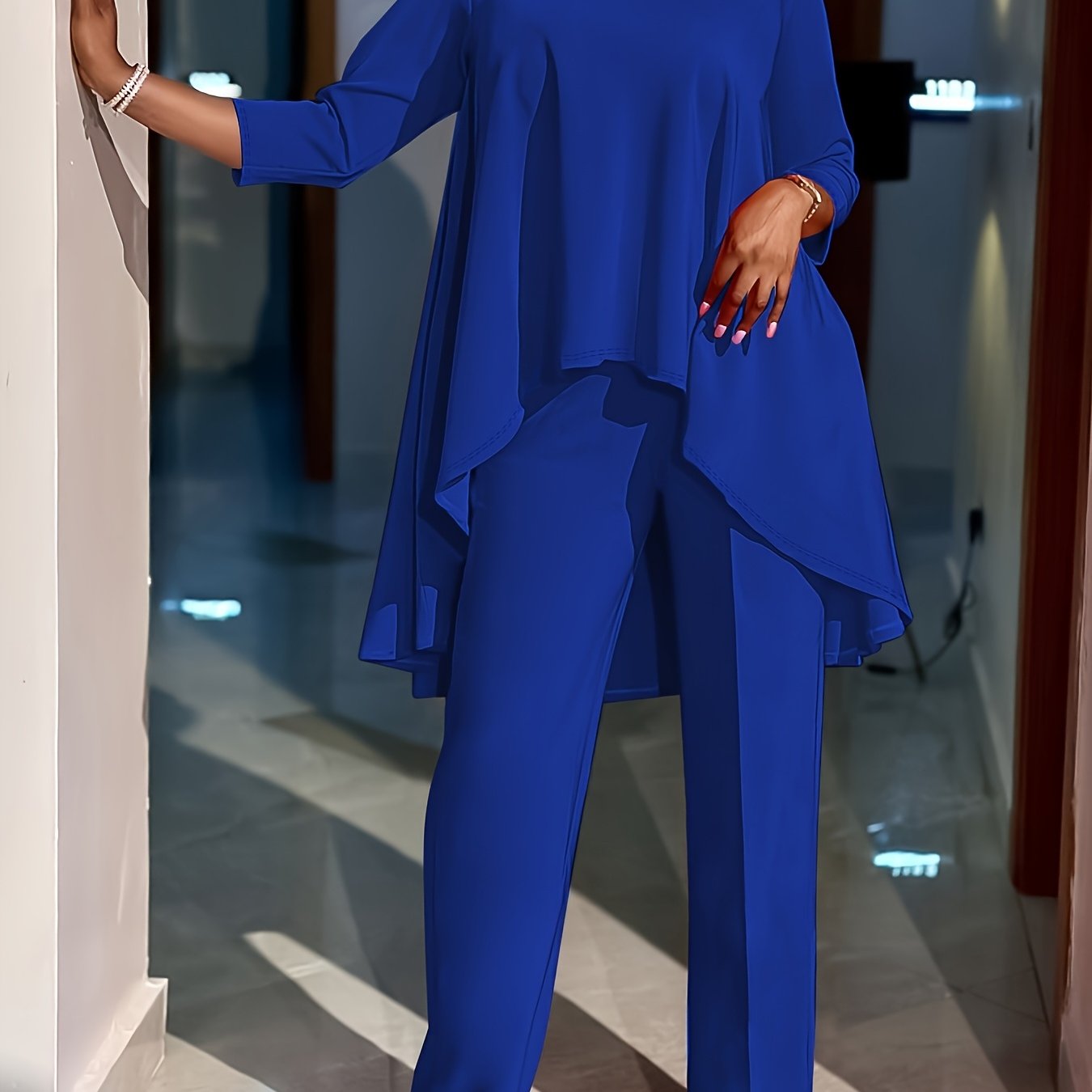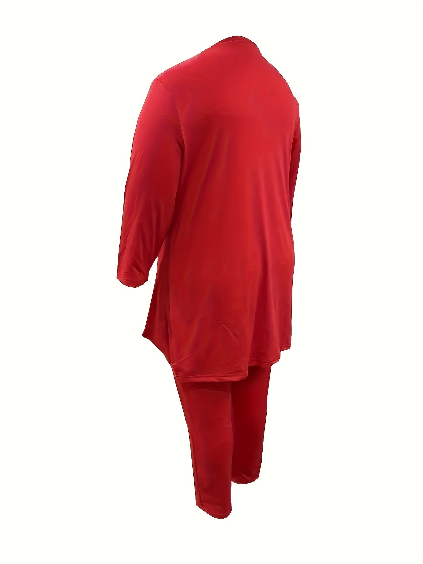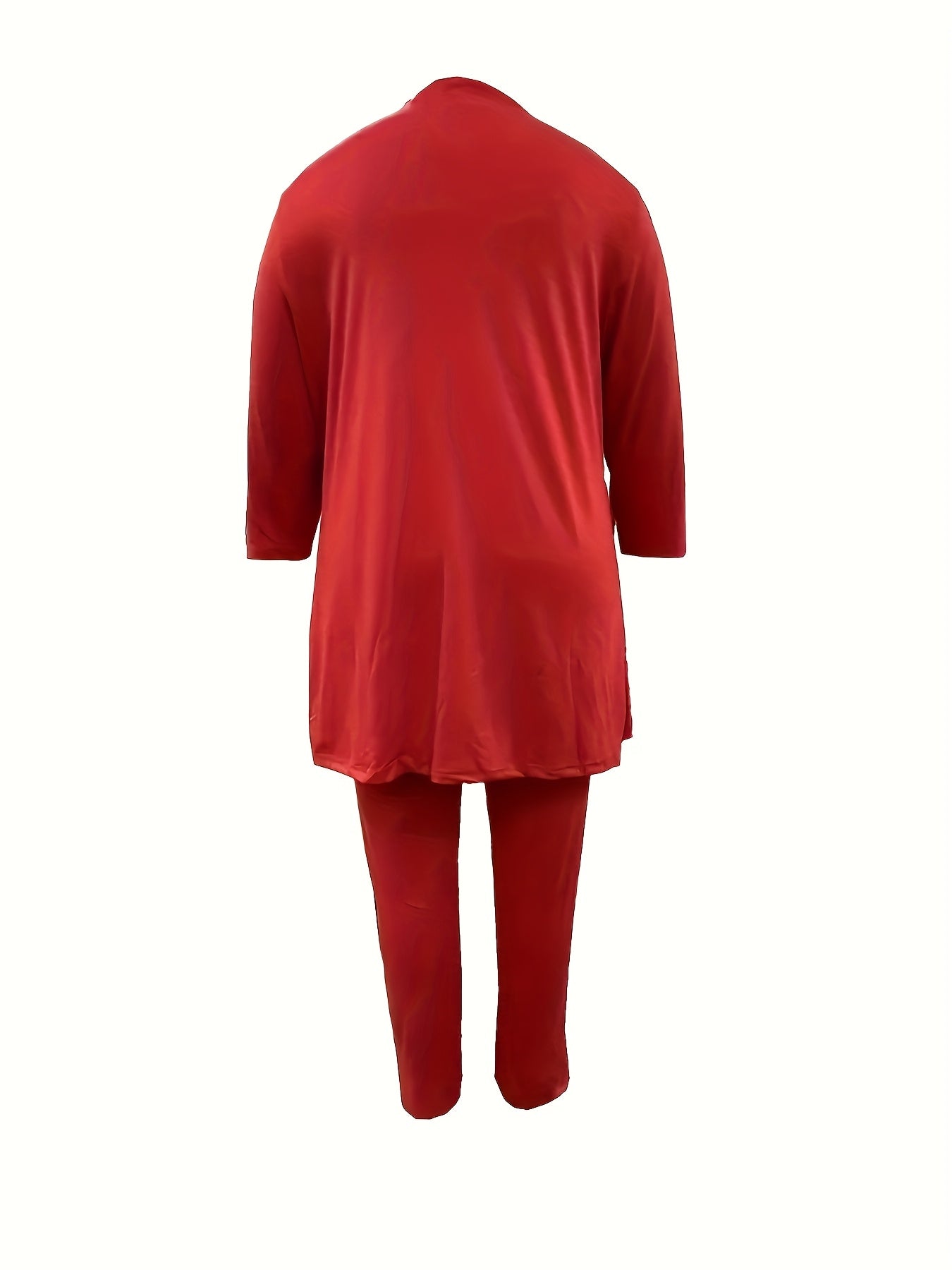 Plus Size Women'S Casual Solid Color Two-piece Set, With Elastic Loose-fitting Three-quarter Sleeve Top And Long Pants.
