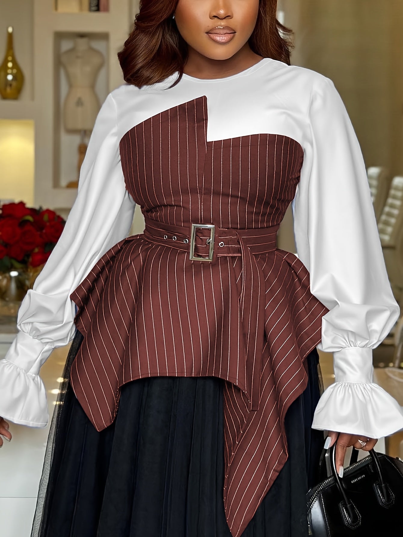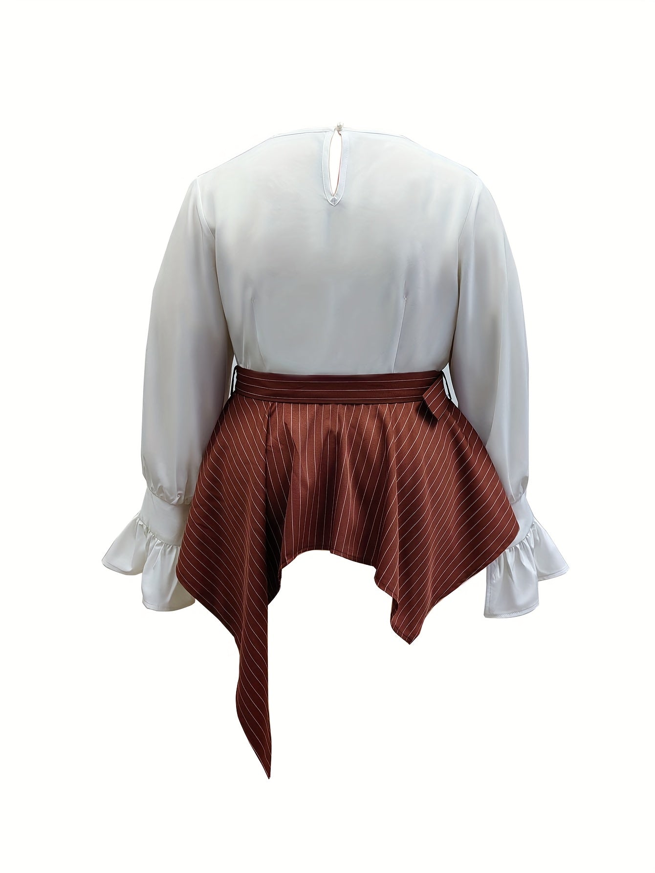 Plus Size Women's Elegant Striped Panel Asymmetrical Hem Blouse with Belt - Long Sleeve, Green & White Vertical Stripes, Round Neck, Polyester, Ruffled Cuffs, Layered Skirt Design, Perfect for Office or Casual Outfits