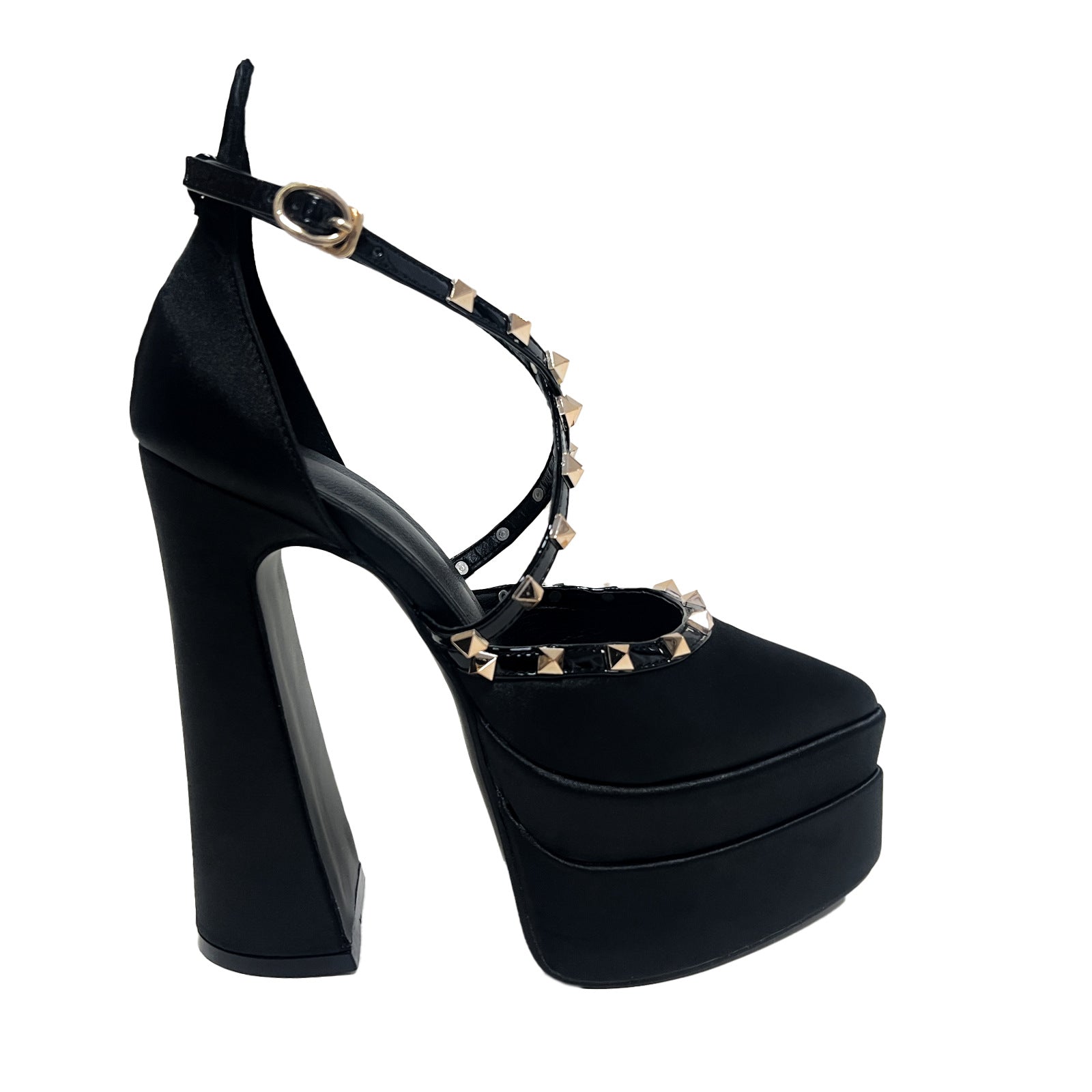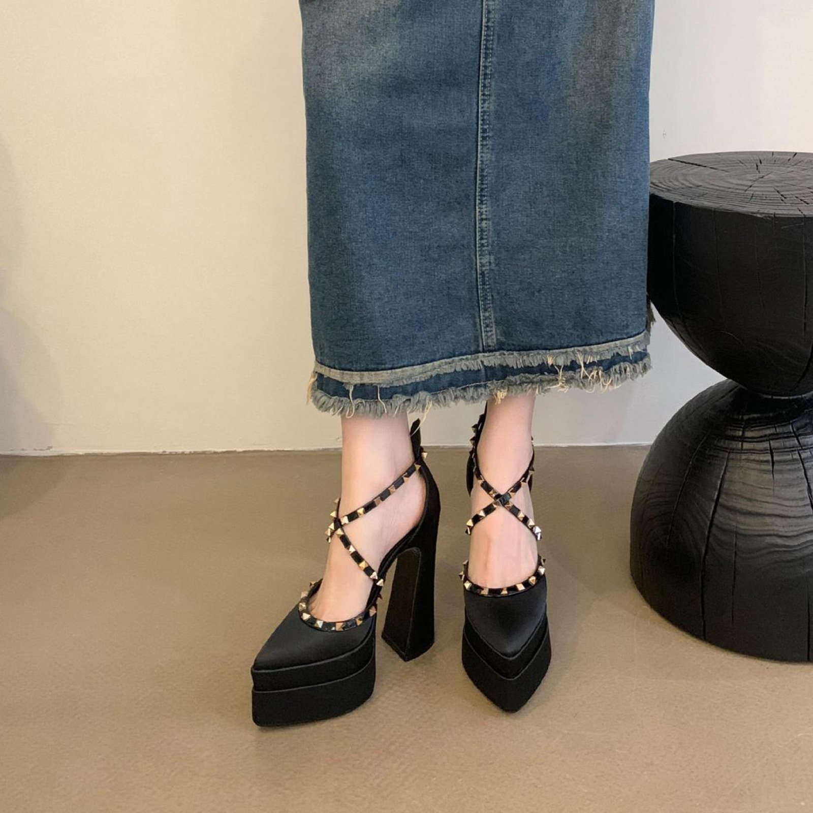 Pointed Rivets Chunky Heel Satin Wedding Cocktail 15cm Double Waterproof Platform with Women Shoes Heels