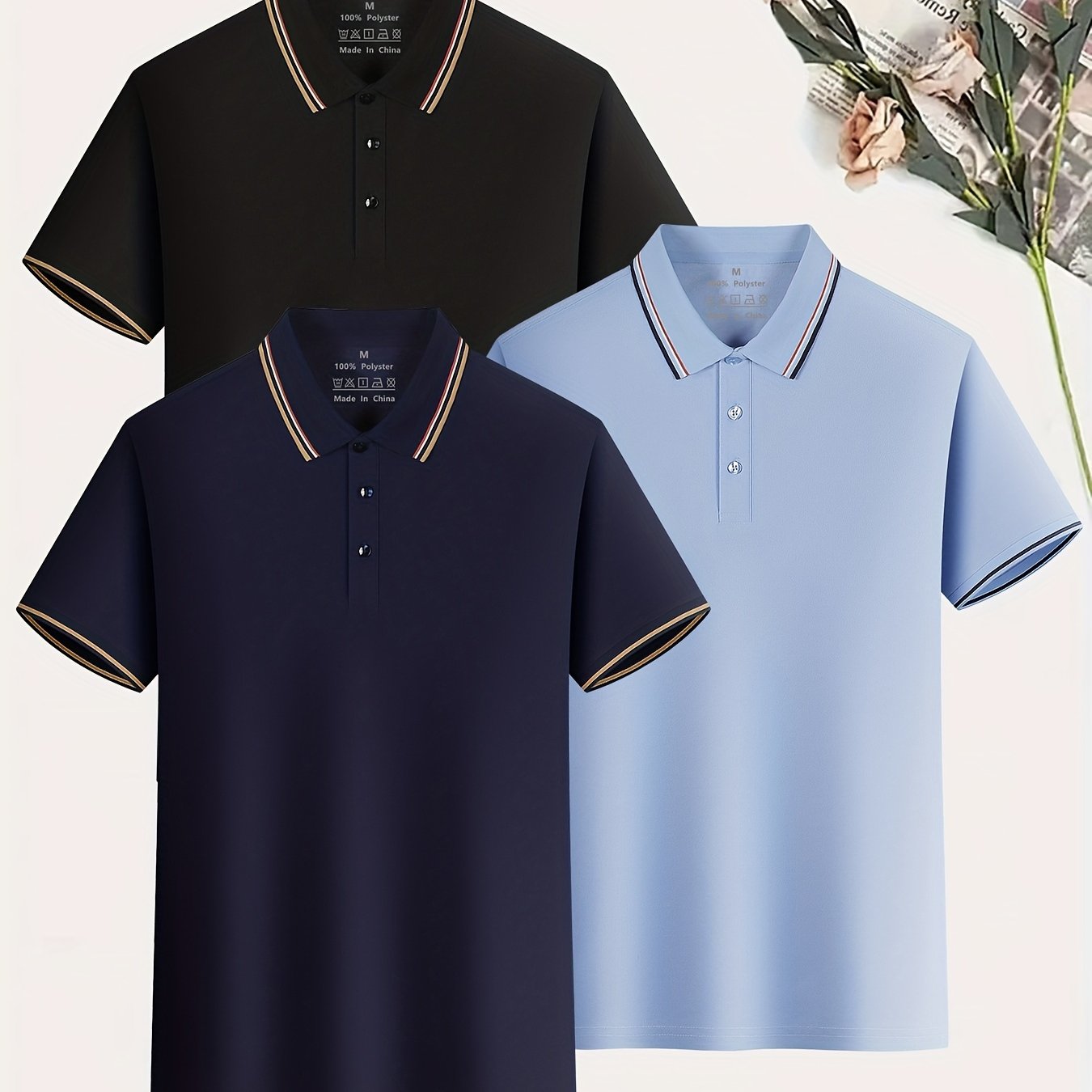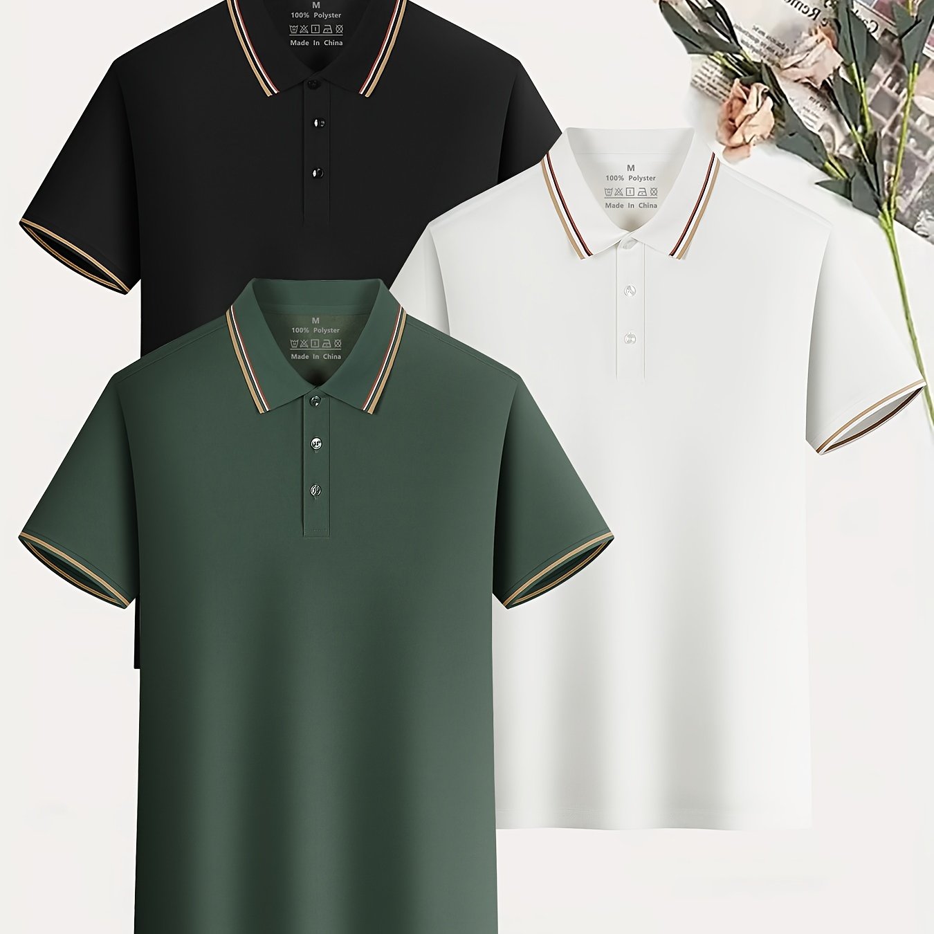 [Polyester Polo-Style Shirts] Set of 3 Men's Casual Short Sleeve Polo-Style Shirts - Regular Fit, Polyester Fabric with Slight Stretch, Alphabet Pattern, Summer Collection