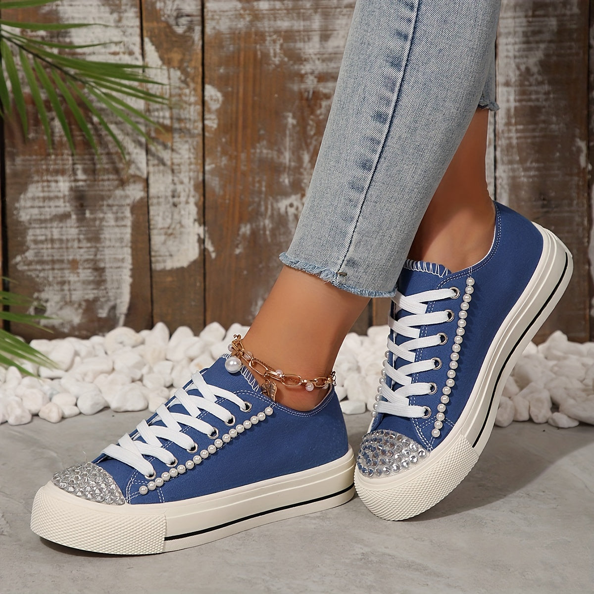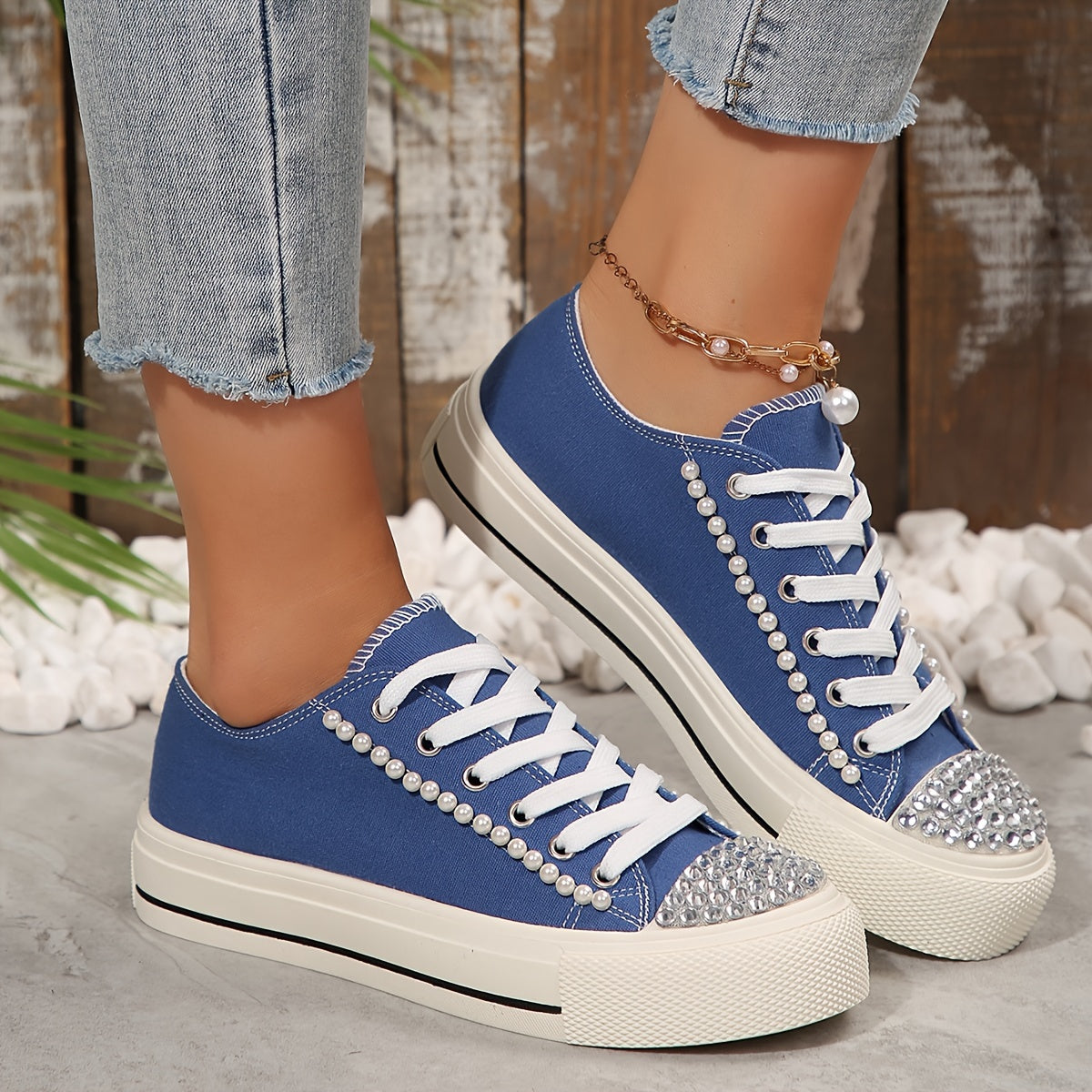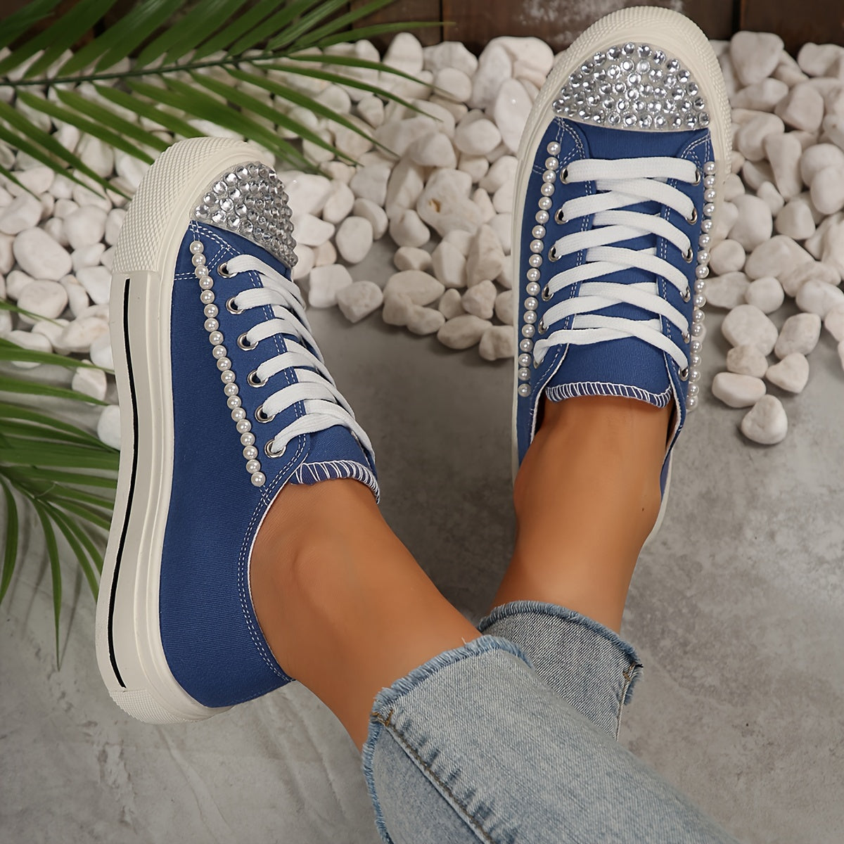 Popular Round Head Thick Sole Rhinestone Sparkling Pearl Strap Casual Shoes