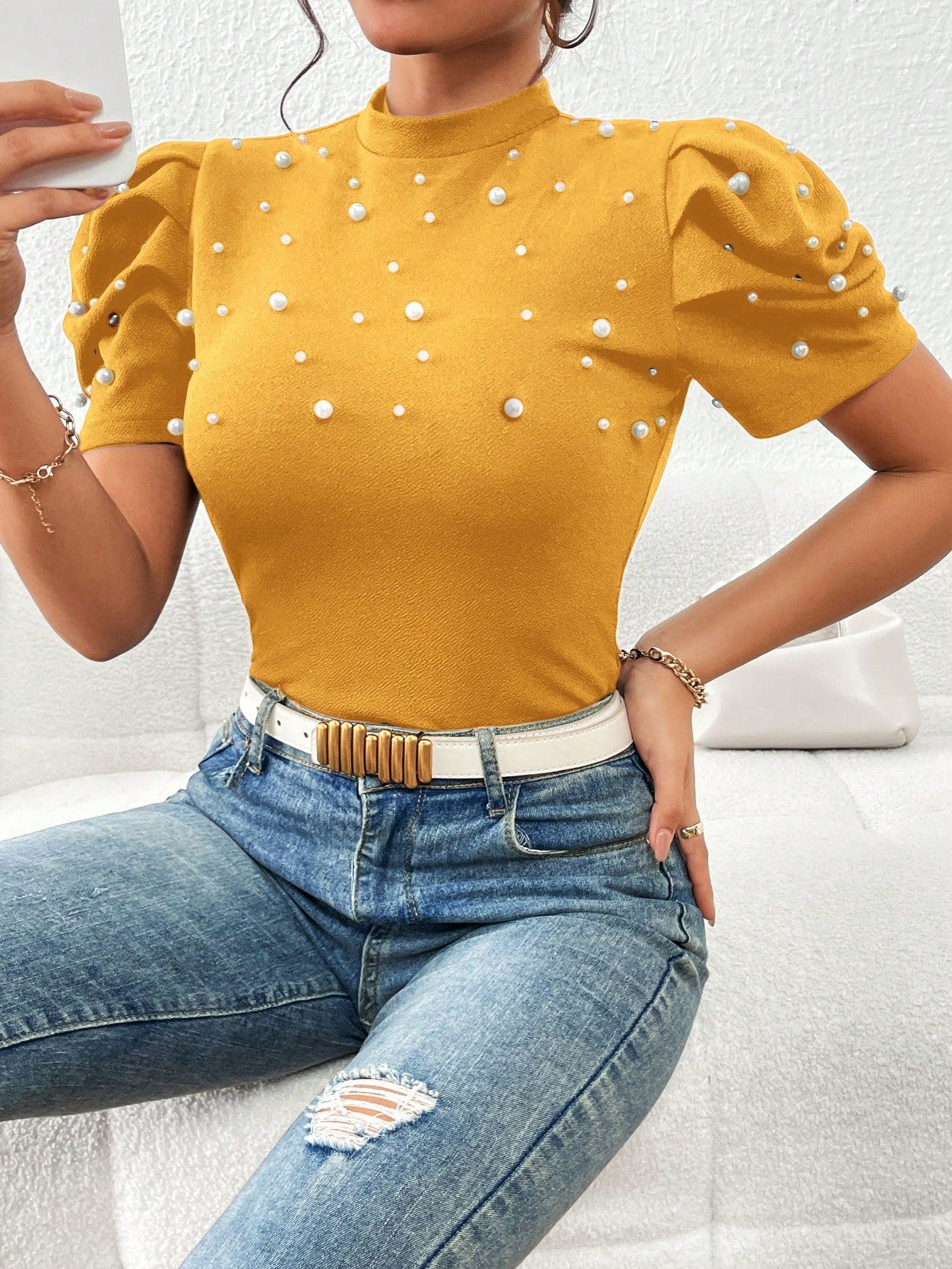 Privé Pearls Beaded Puff Sleeve Mock Neck Tee