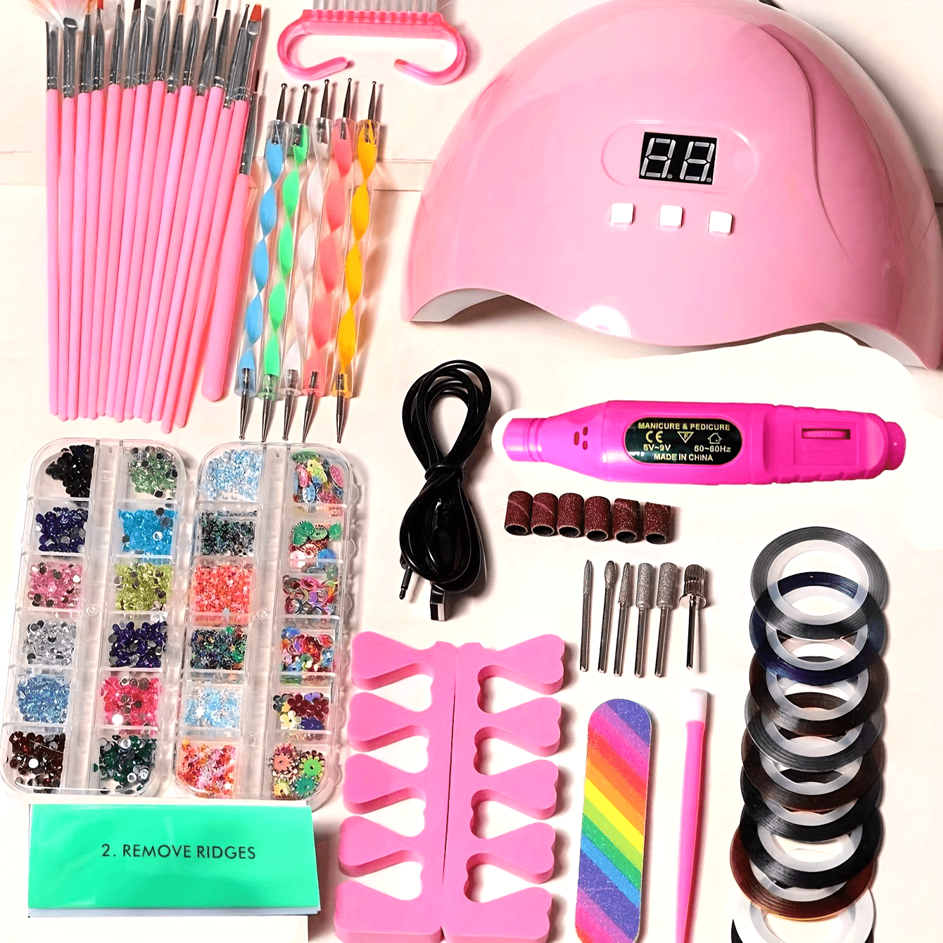 Professional 15-in-1 Stainless Steel Nail Art Tool Set - USB Powered, Hypoallergenic, DIY Kit with UV Nail Lamp, Dead Skin Remover, Finger Divider - No Gel or Powder Included, Weight >300g