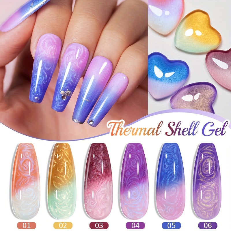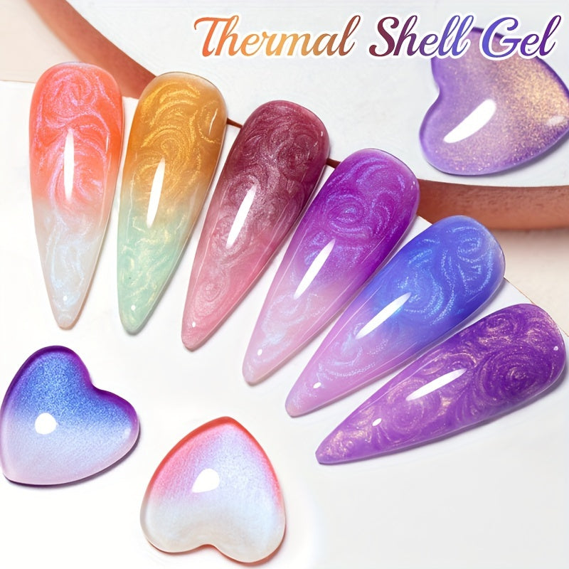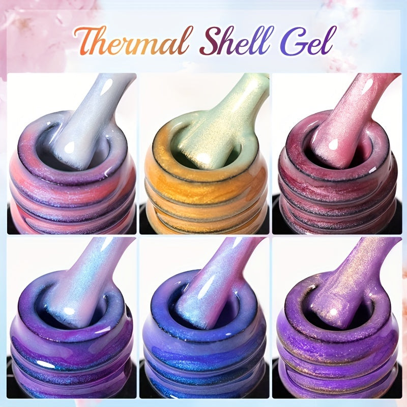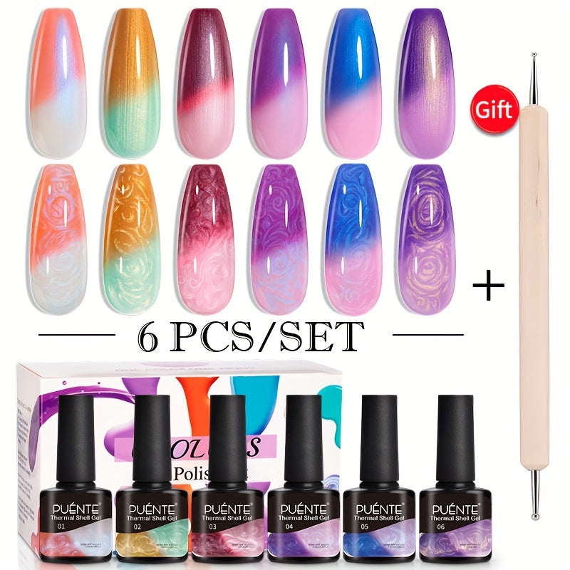 PUENTE 6pcs Thermal Shell Gel Polish Set With Dotting Pen Pearl Shell Thread Temperature Color Changing UV Nail Art Varnish Kit For Home Nail Salon