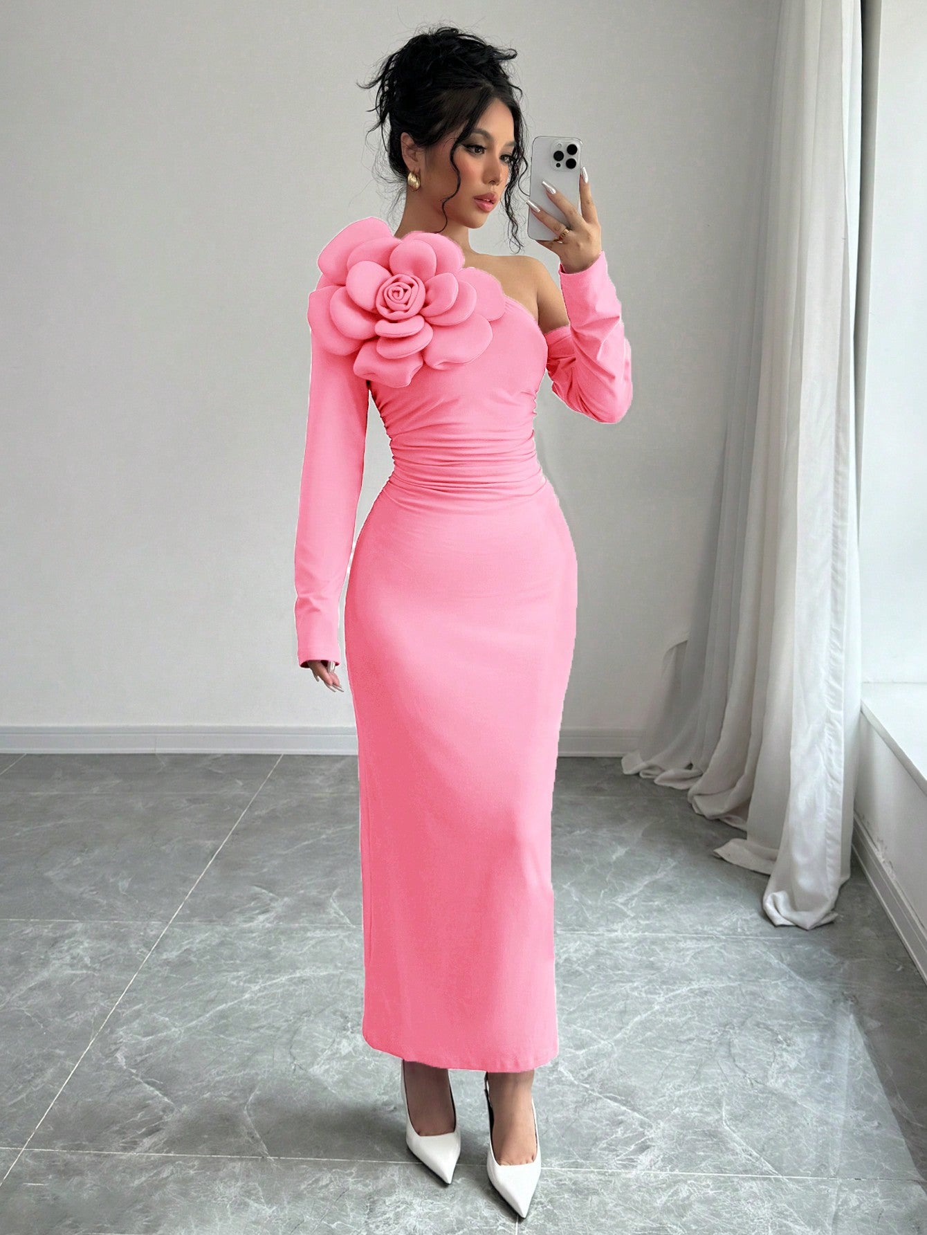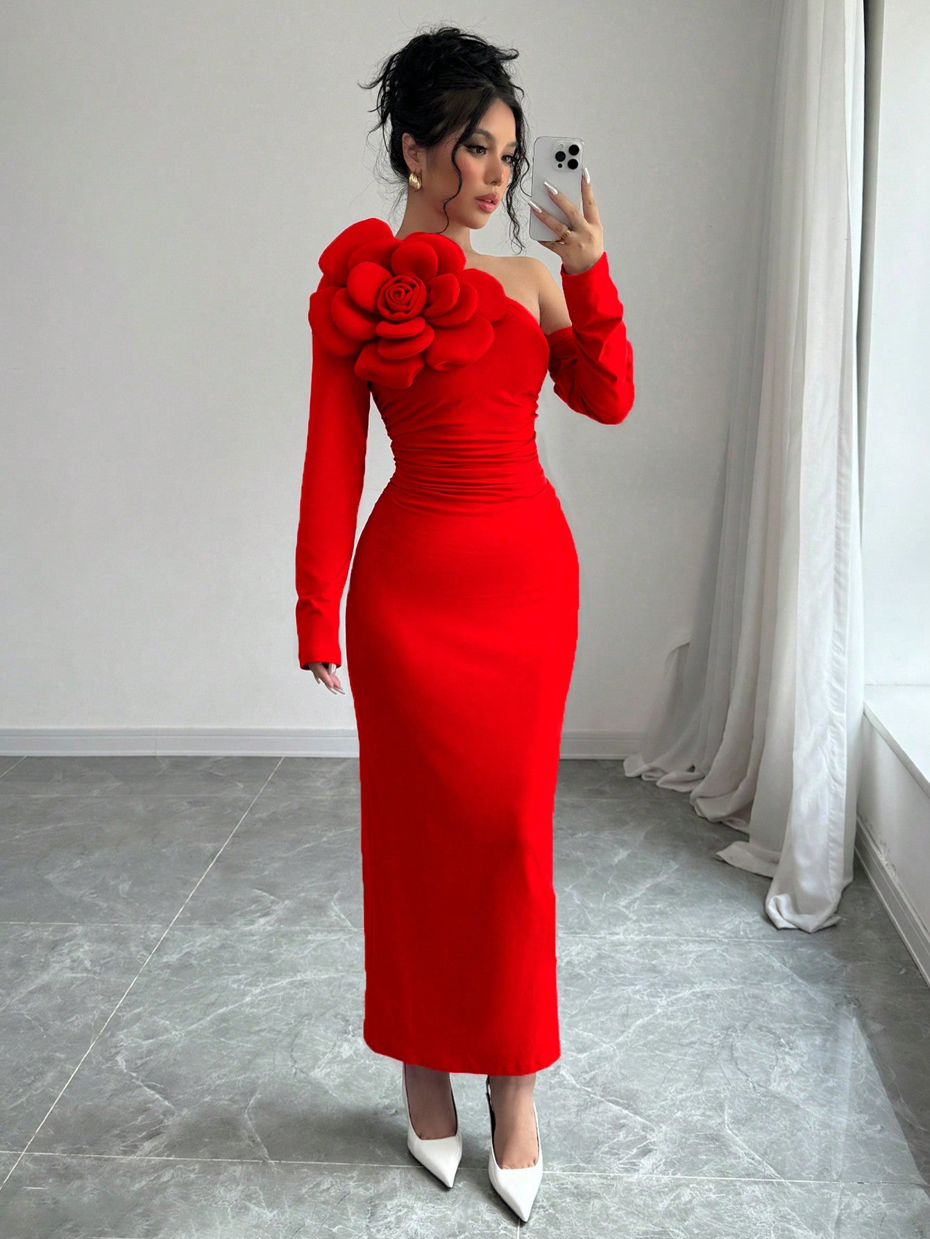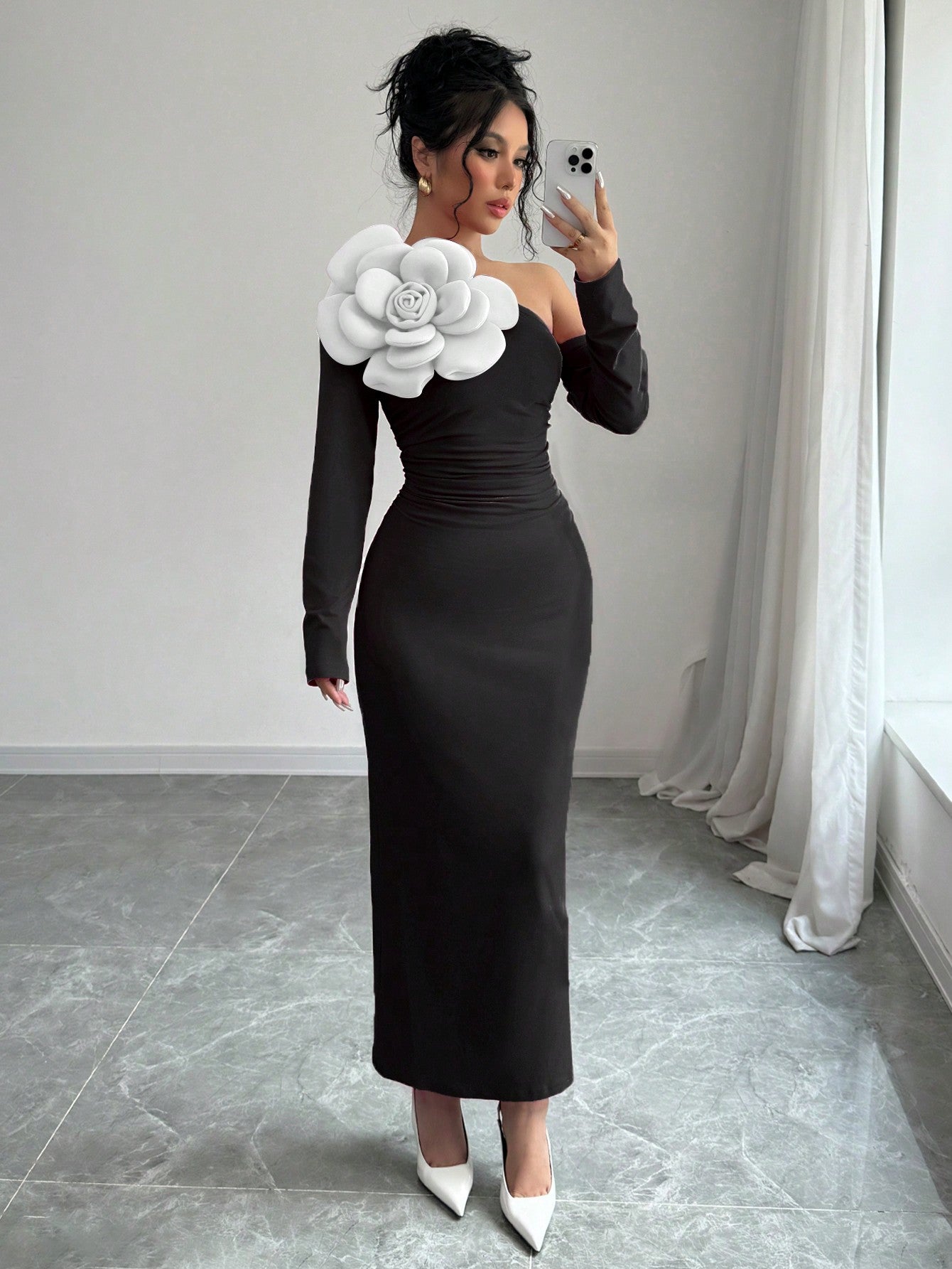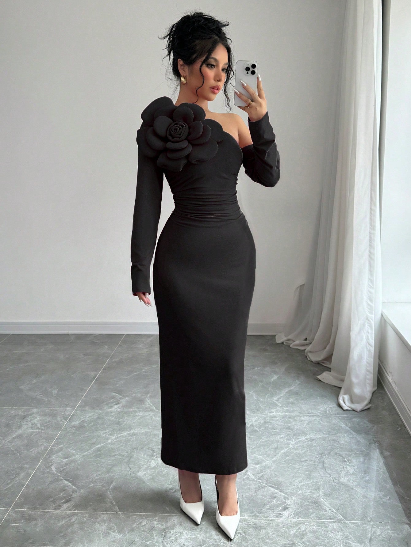 Raffinéa 1pc Women's Oblique Shoulder Patchwork 3D Floral, Waist Ruched Slim Fit Long Sleeve Elegant Dress Maxi Women Outfit