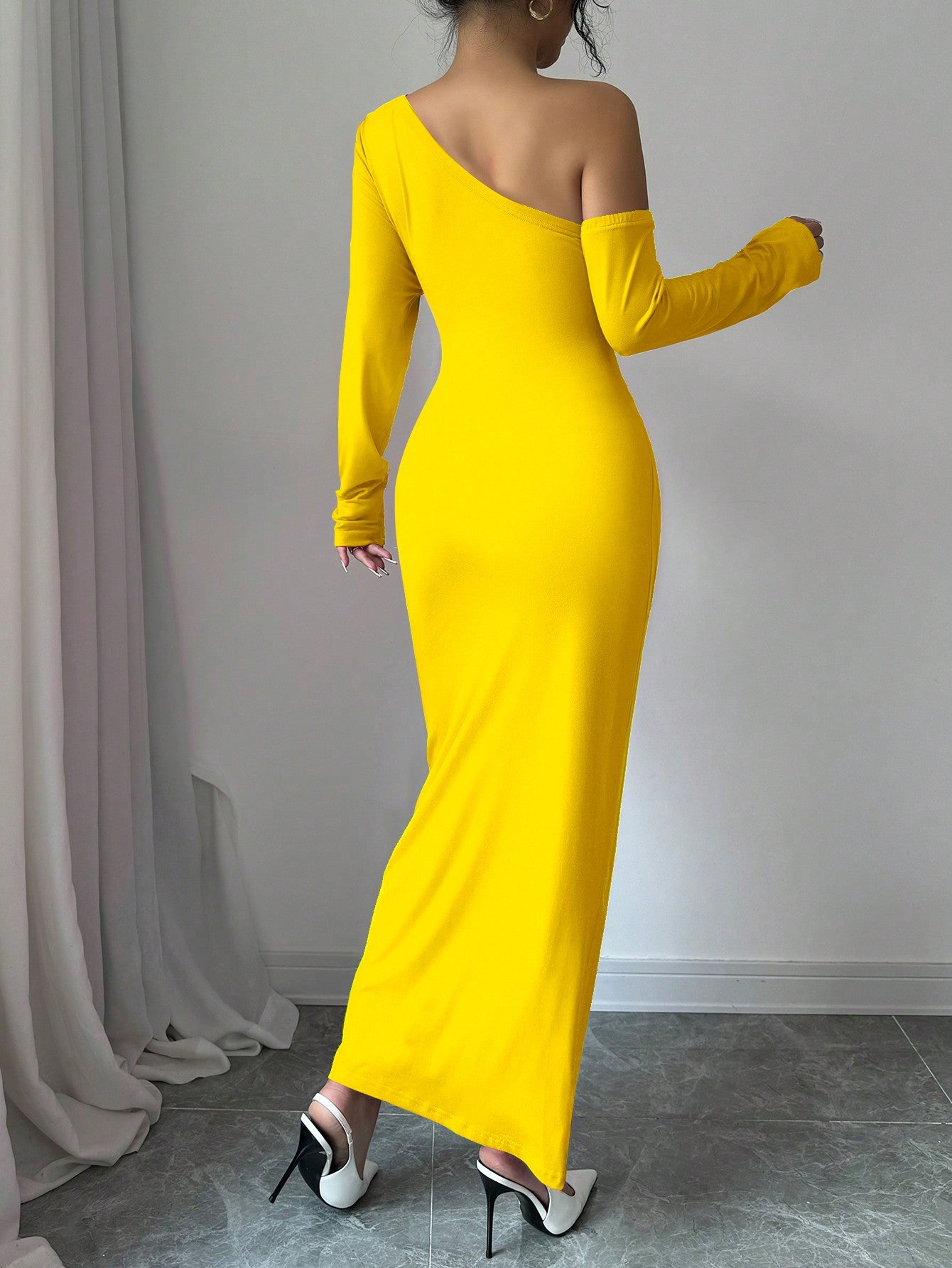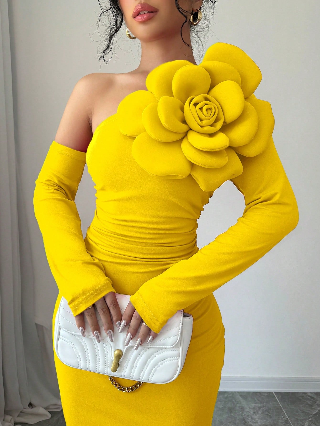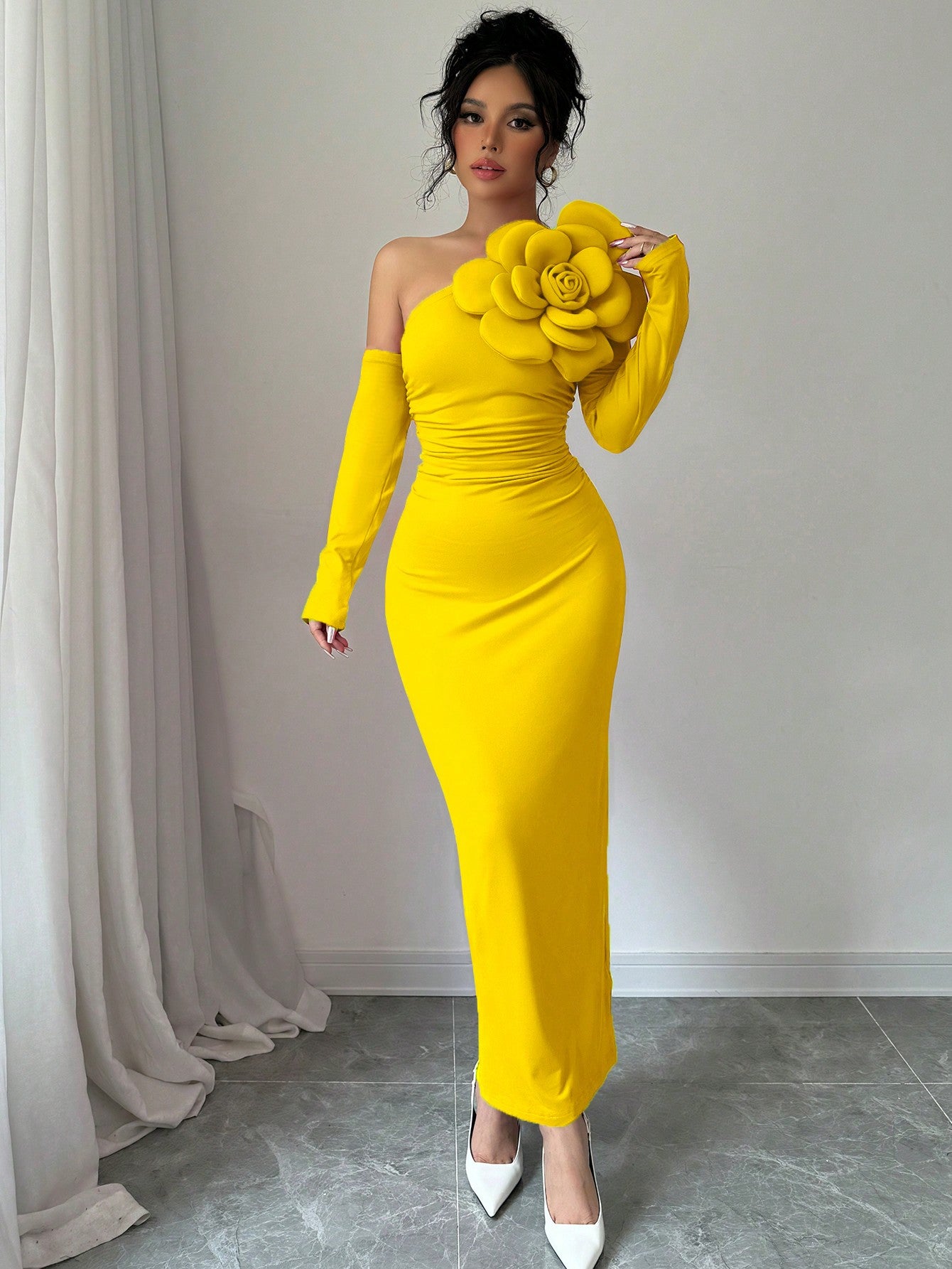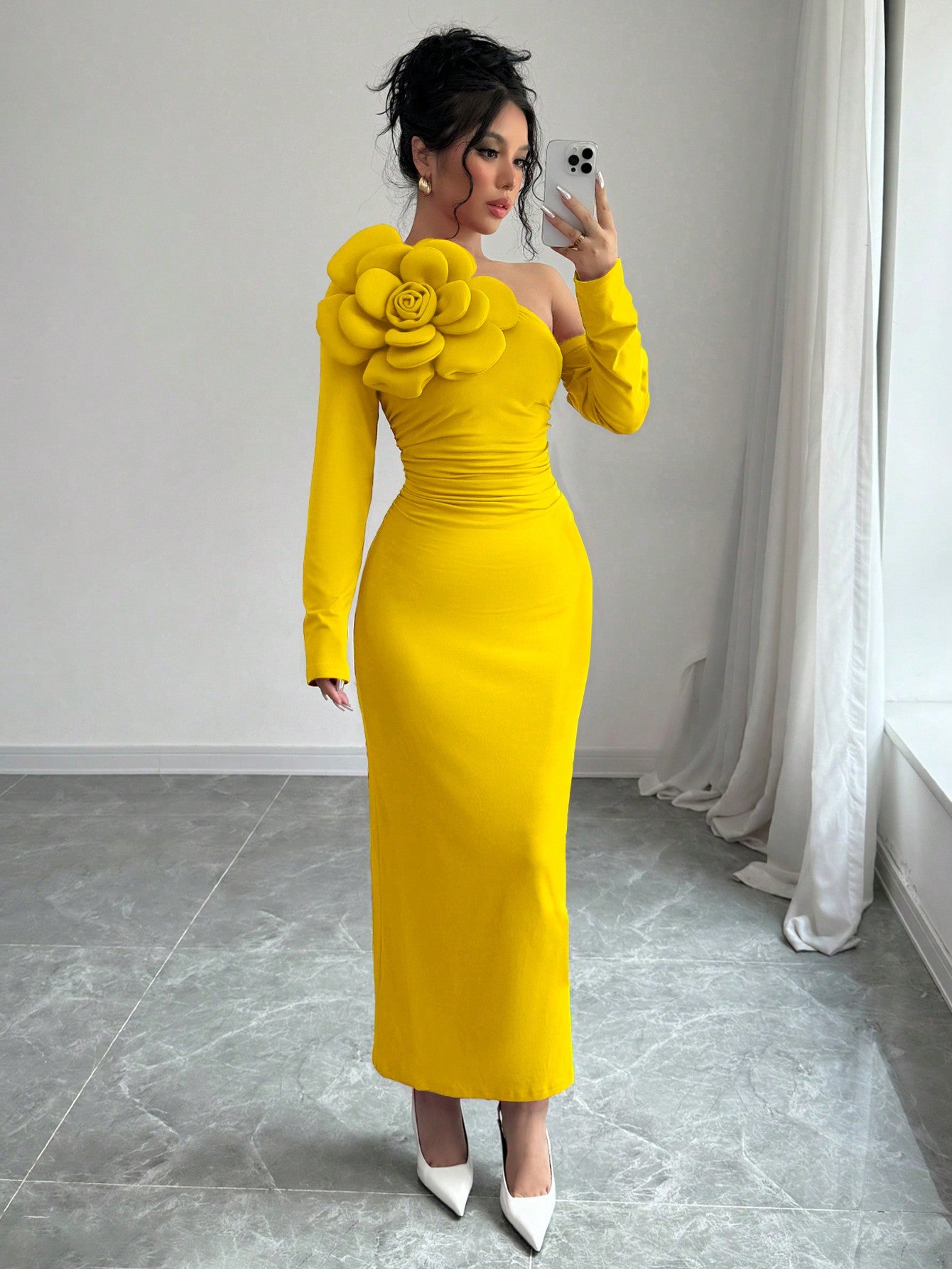 Raffinéa 1pc Women's Oblique Shoulder Patchwork 3D Floral, Waist Ruched Slim Fit Long Sleeve Elegant Dress Maxi Women Outfit