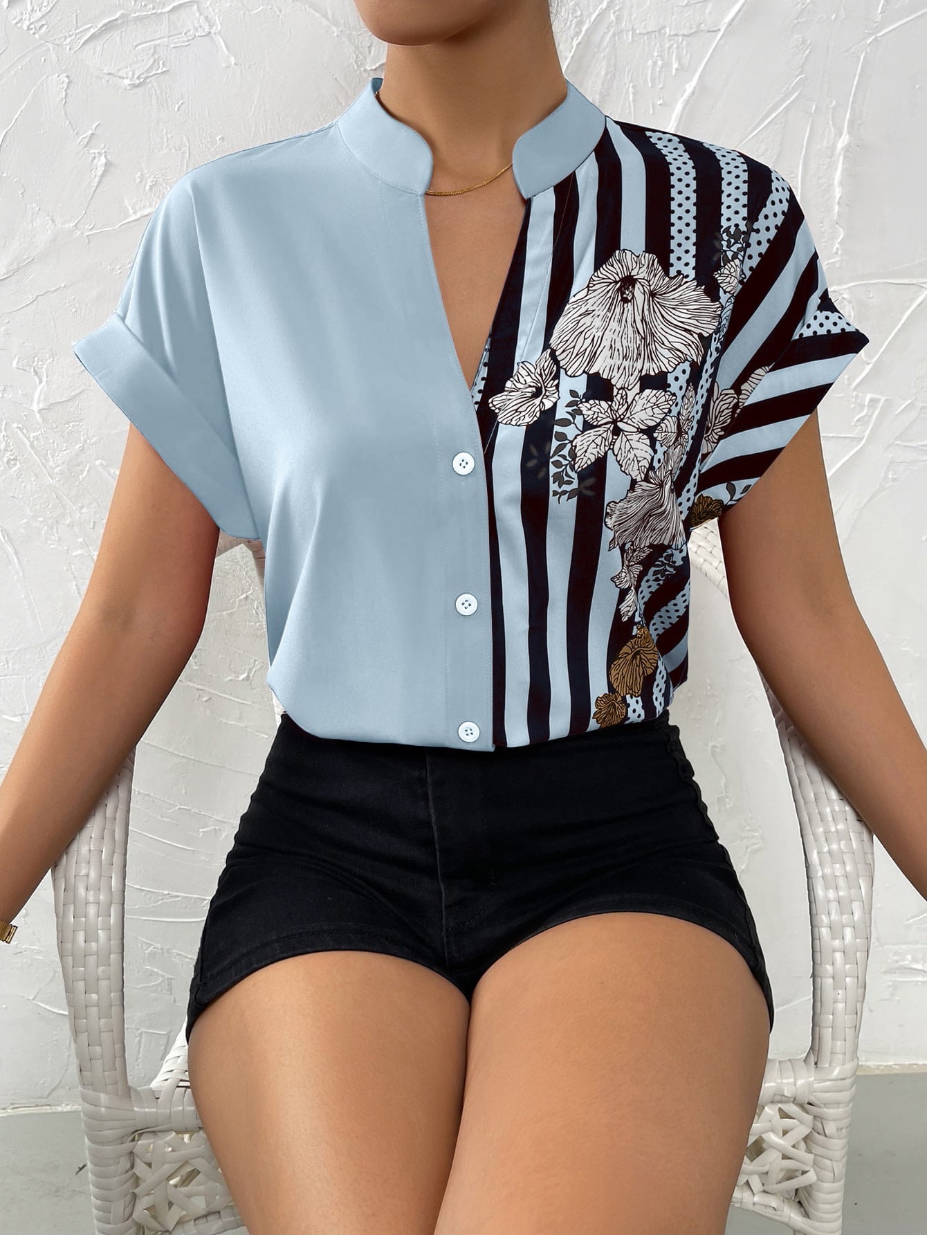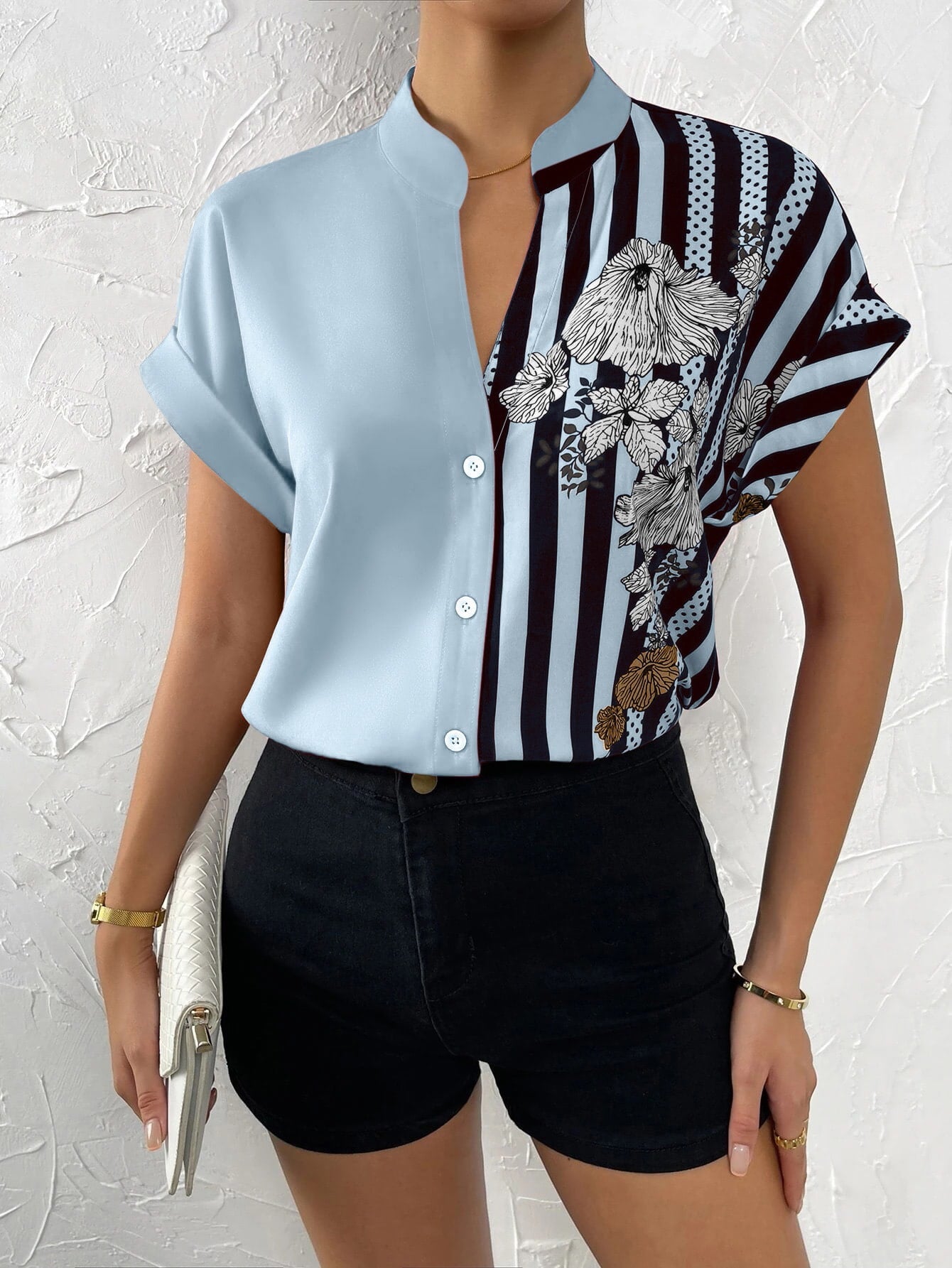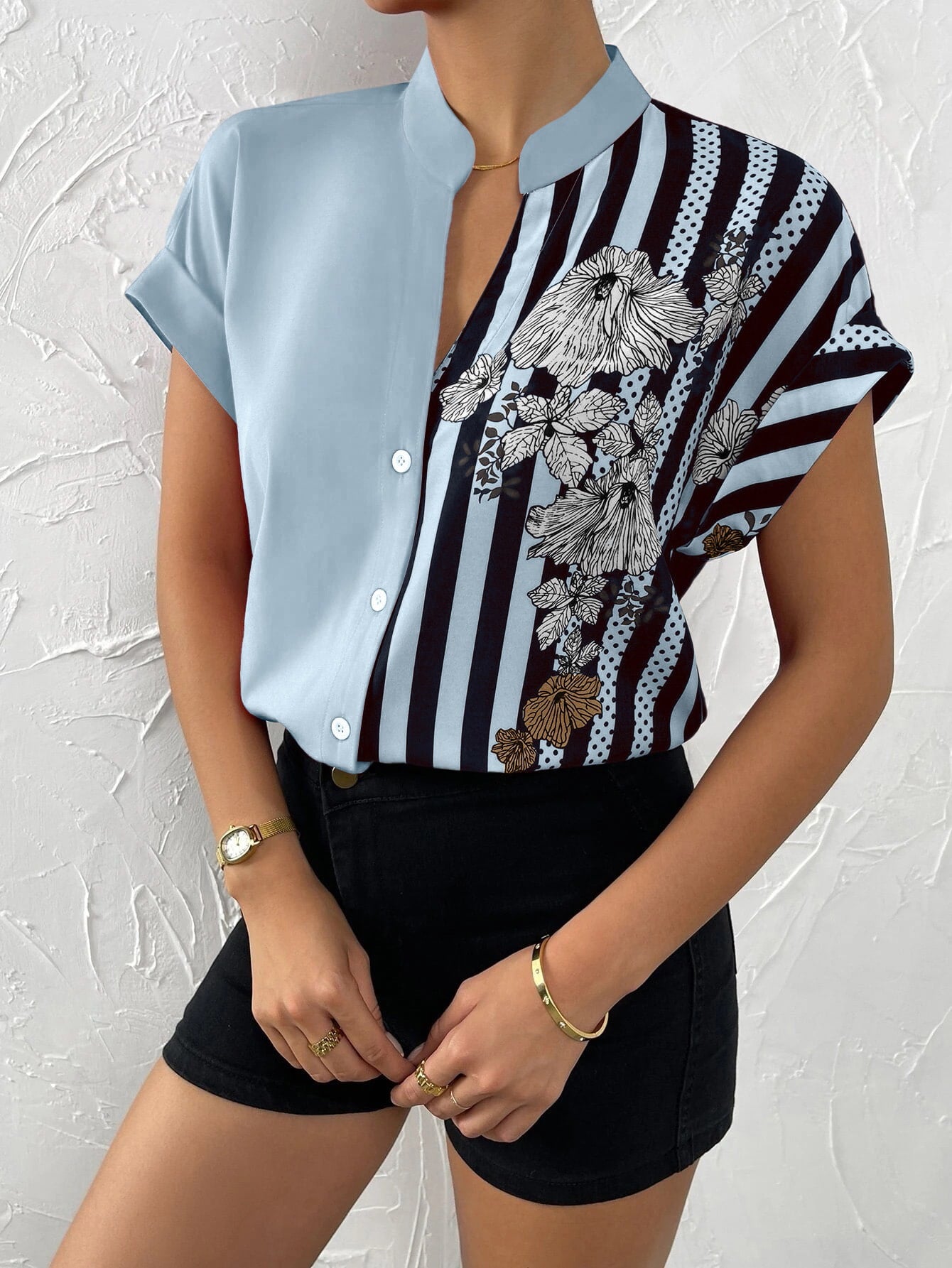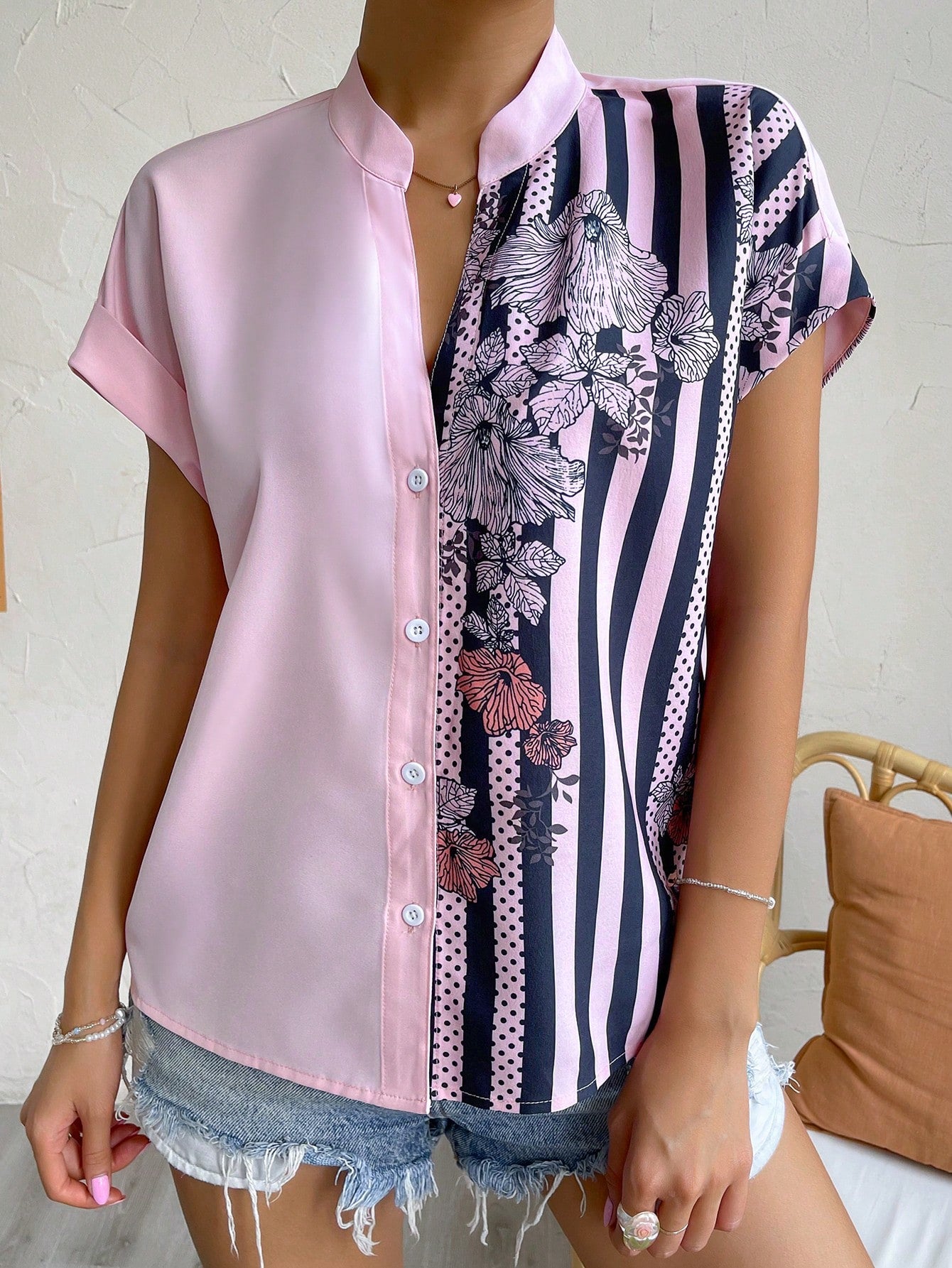 Raffinéa Floral And Striped Print Button Up Shirt,Short Sleeve Tops
