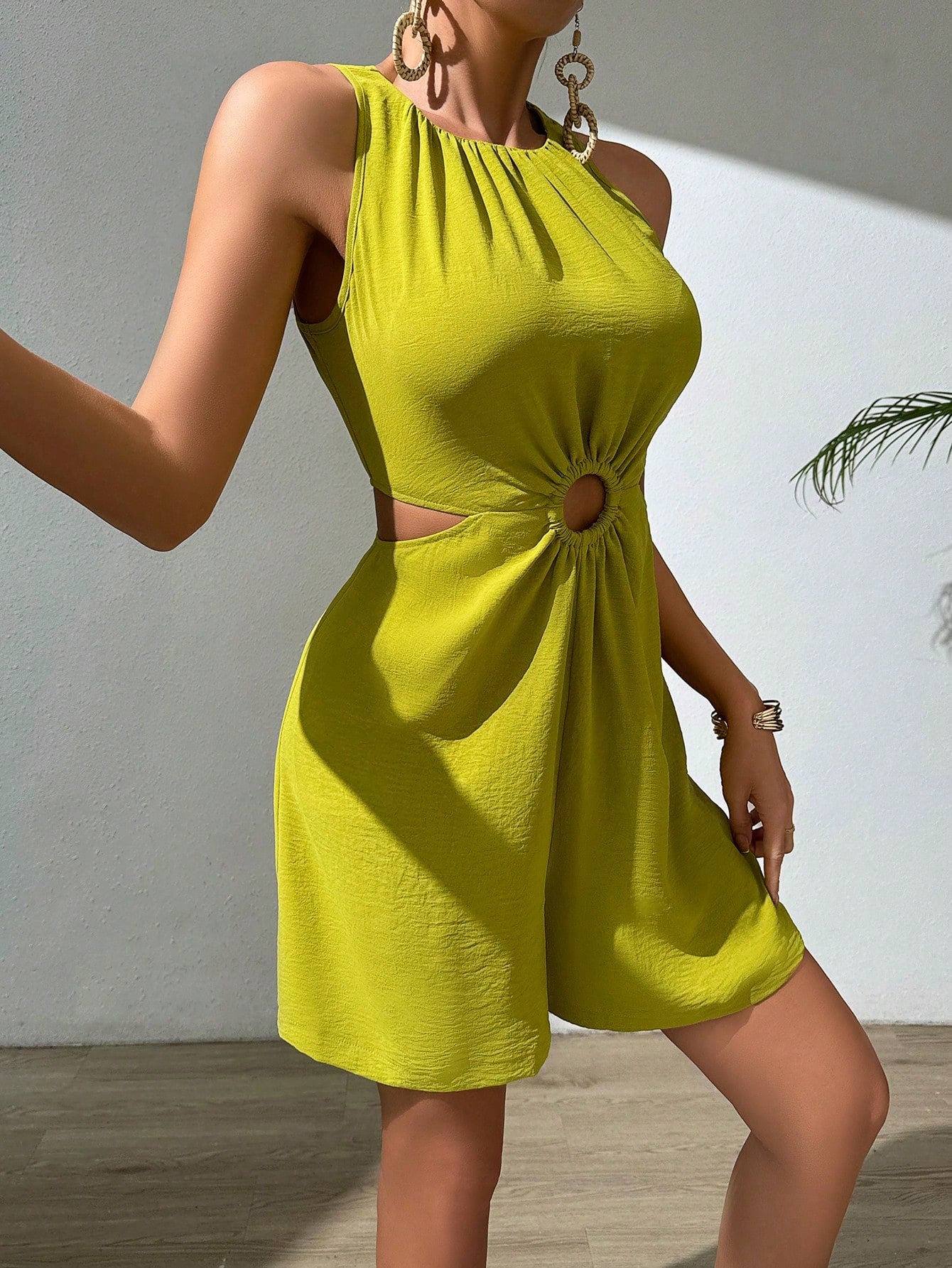 Raffinéa Green Halter Neck Hollow Out Pleated Texture Romper For Women
