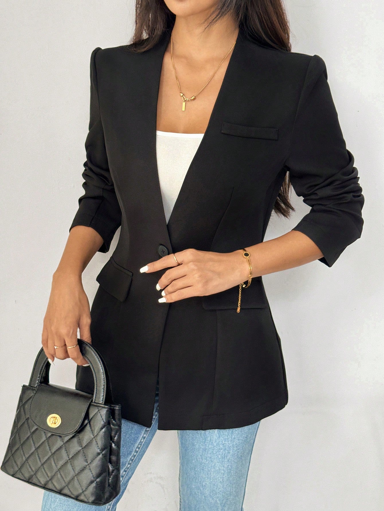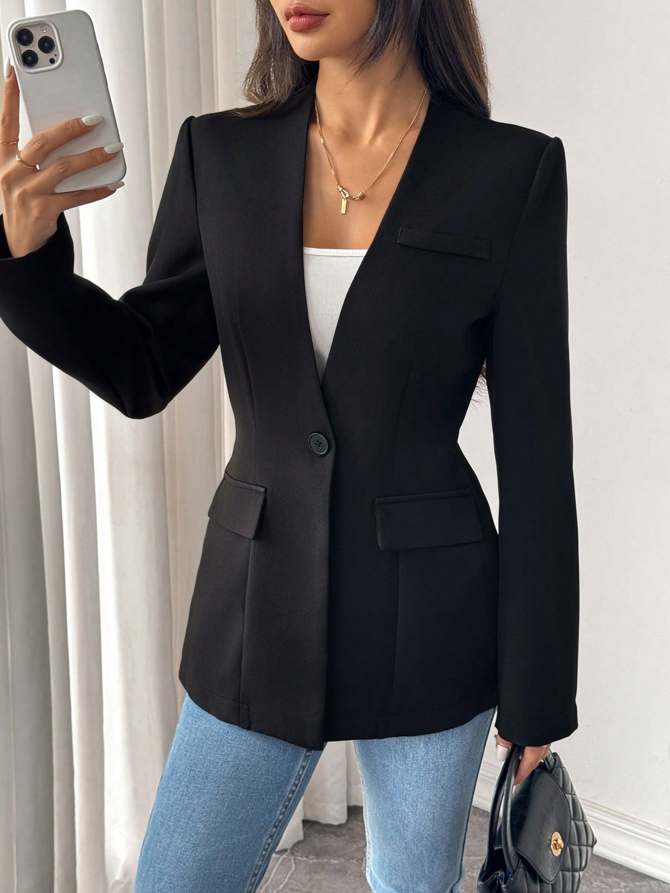 Raffinéa Ladies' Spring And Autumn Solid Color Collarless Single-Breasted Elegant Suit Jacket , Black Blazer