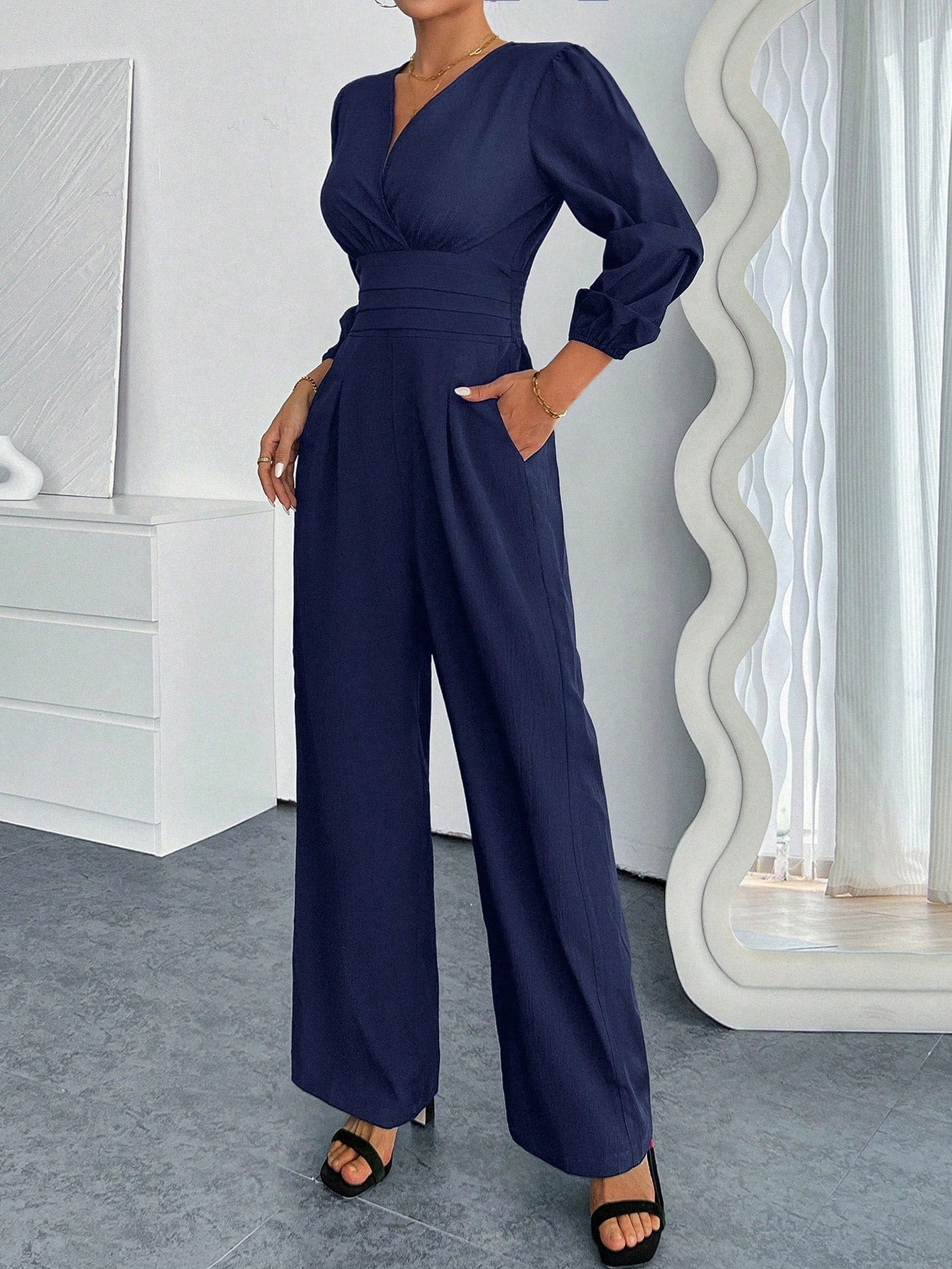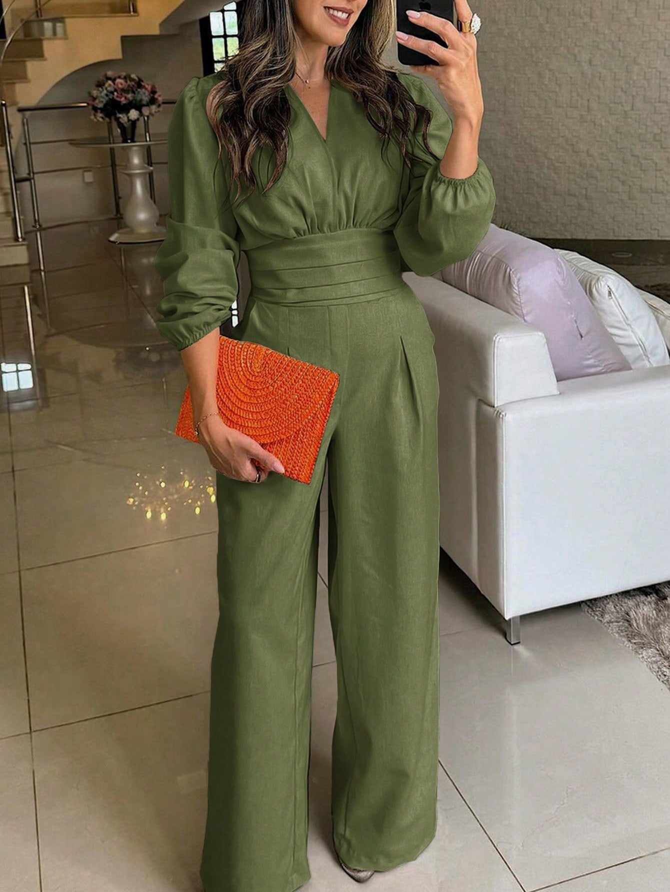 Raffinéa Women's Solid Color Lantern Sleeve Jumpsuit, Spring Autumn