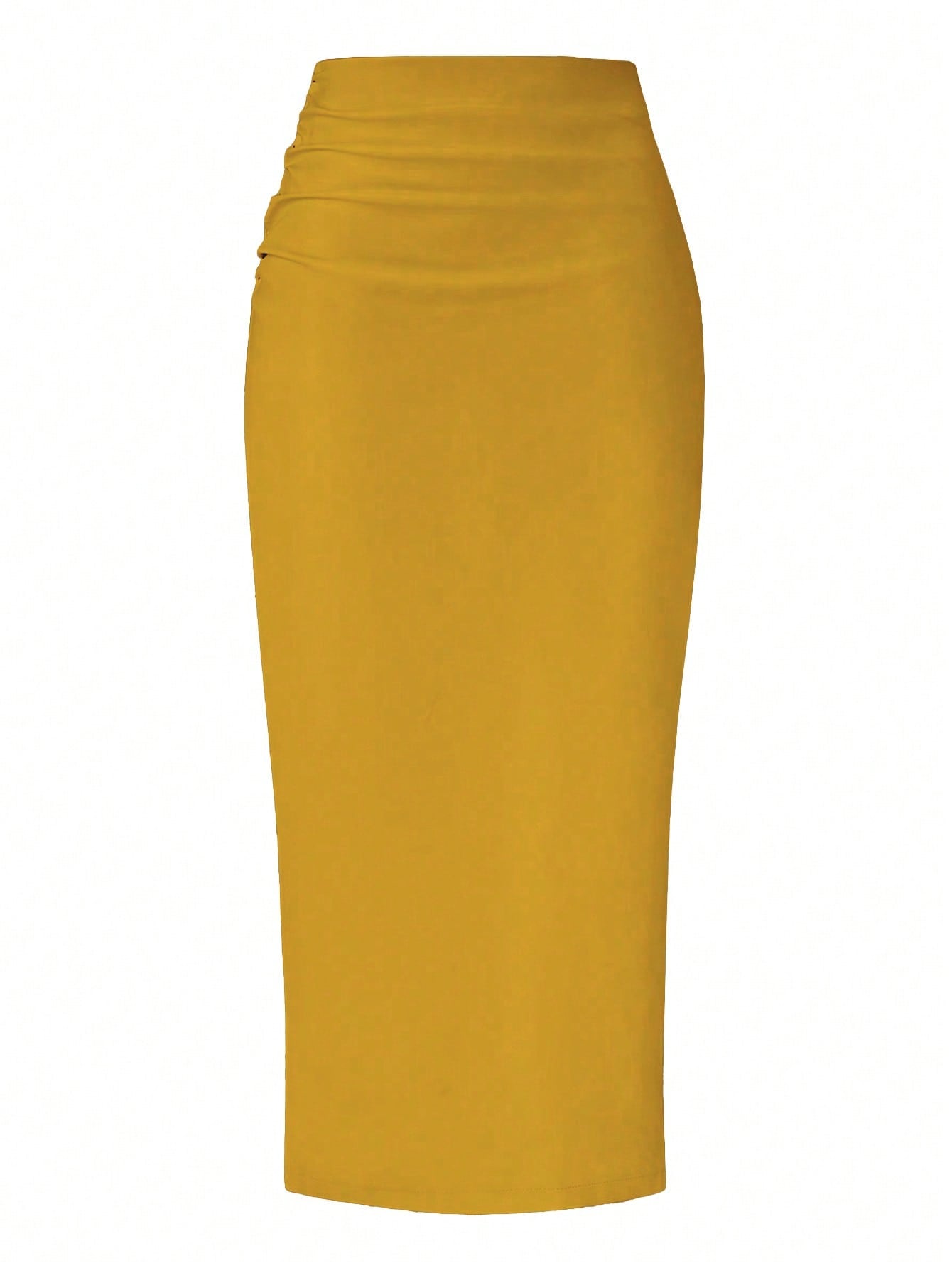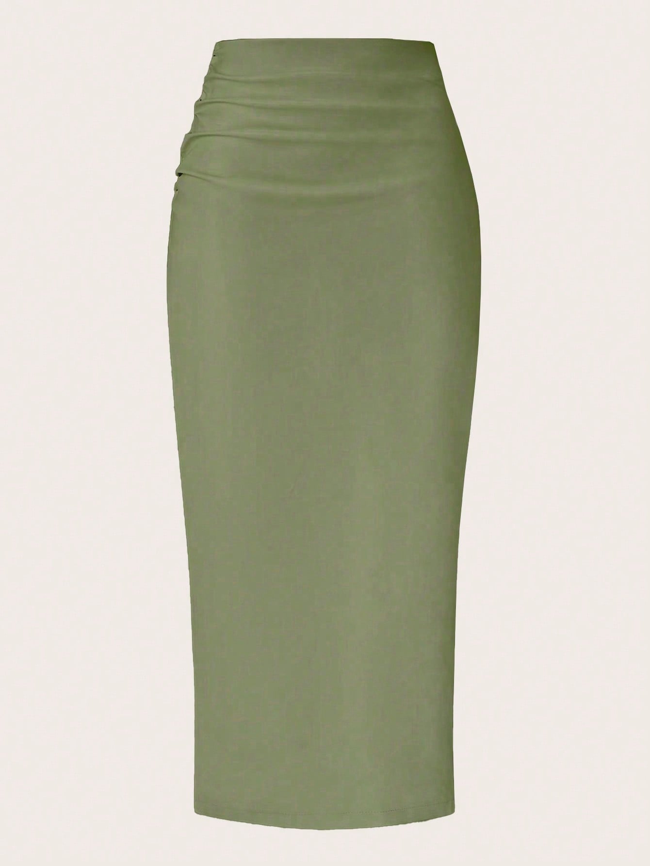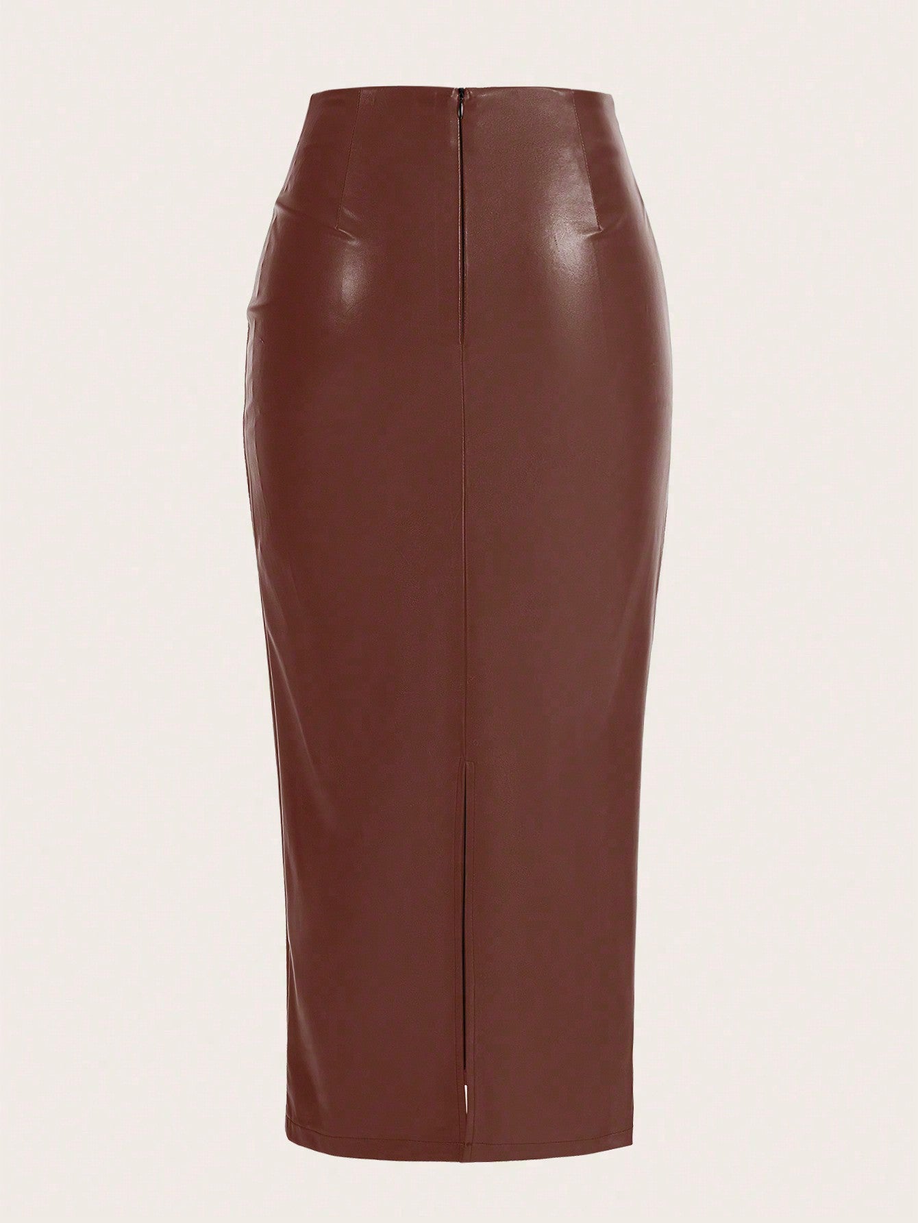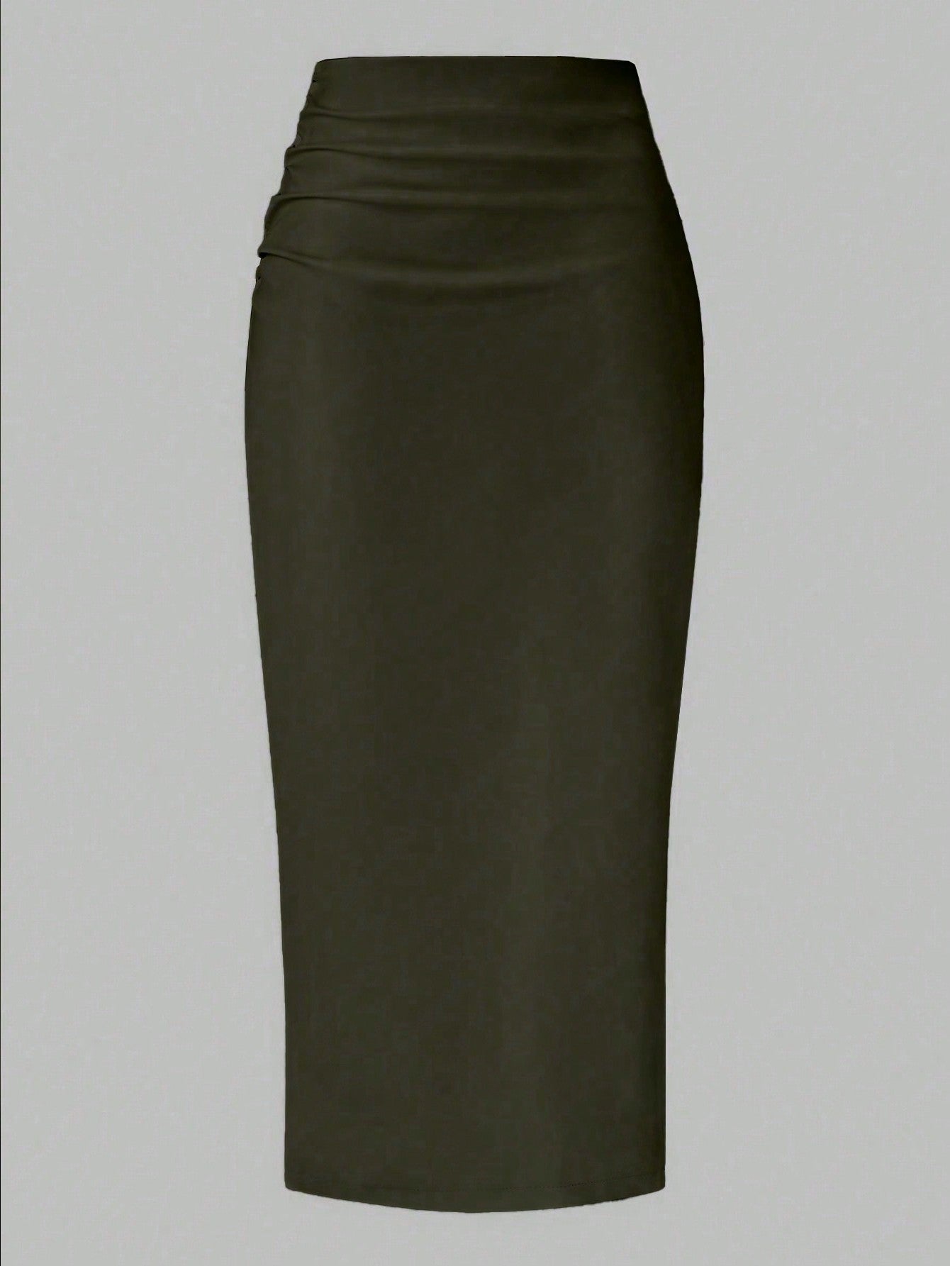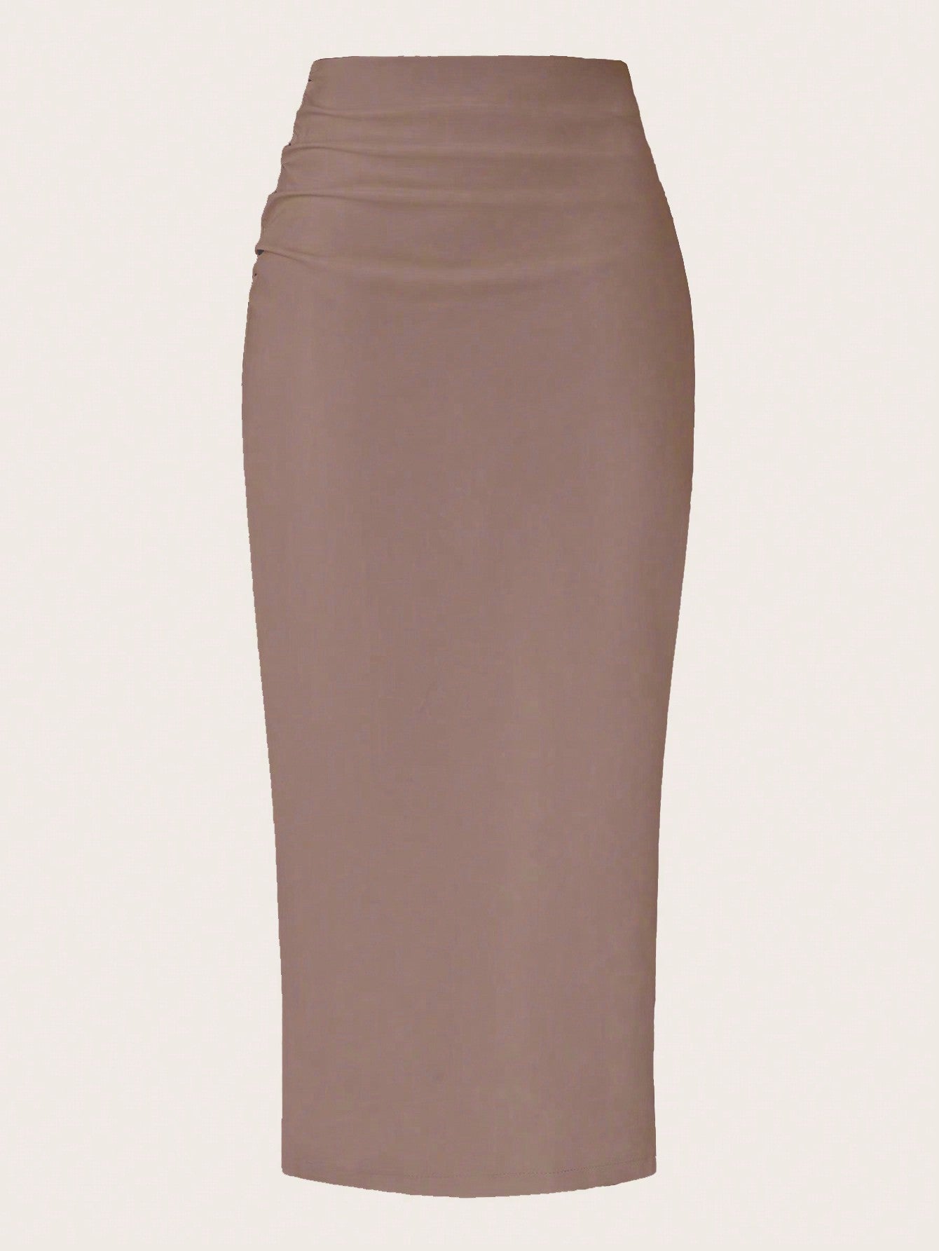 Raffinéa Women's Solid Color Zipper Skirt,Ladies Late Fall Elegant,Party Ruched,Split Thigh,Zipper Long Regular Fit High Waist Brown Plain Women Skirts , Casual Daily Wear Maxi Women Outfit