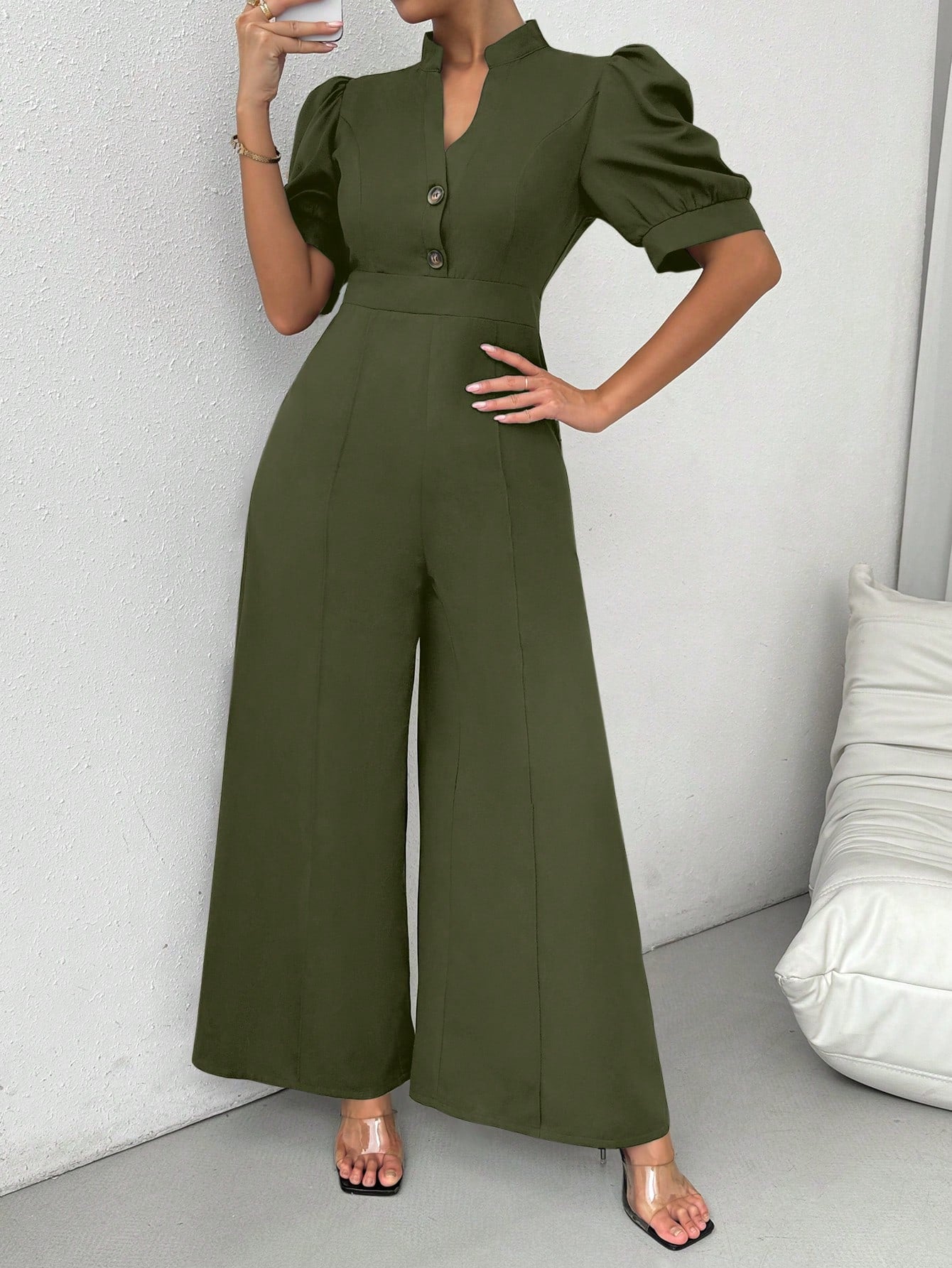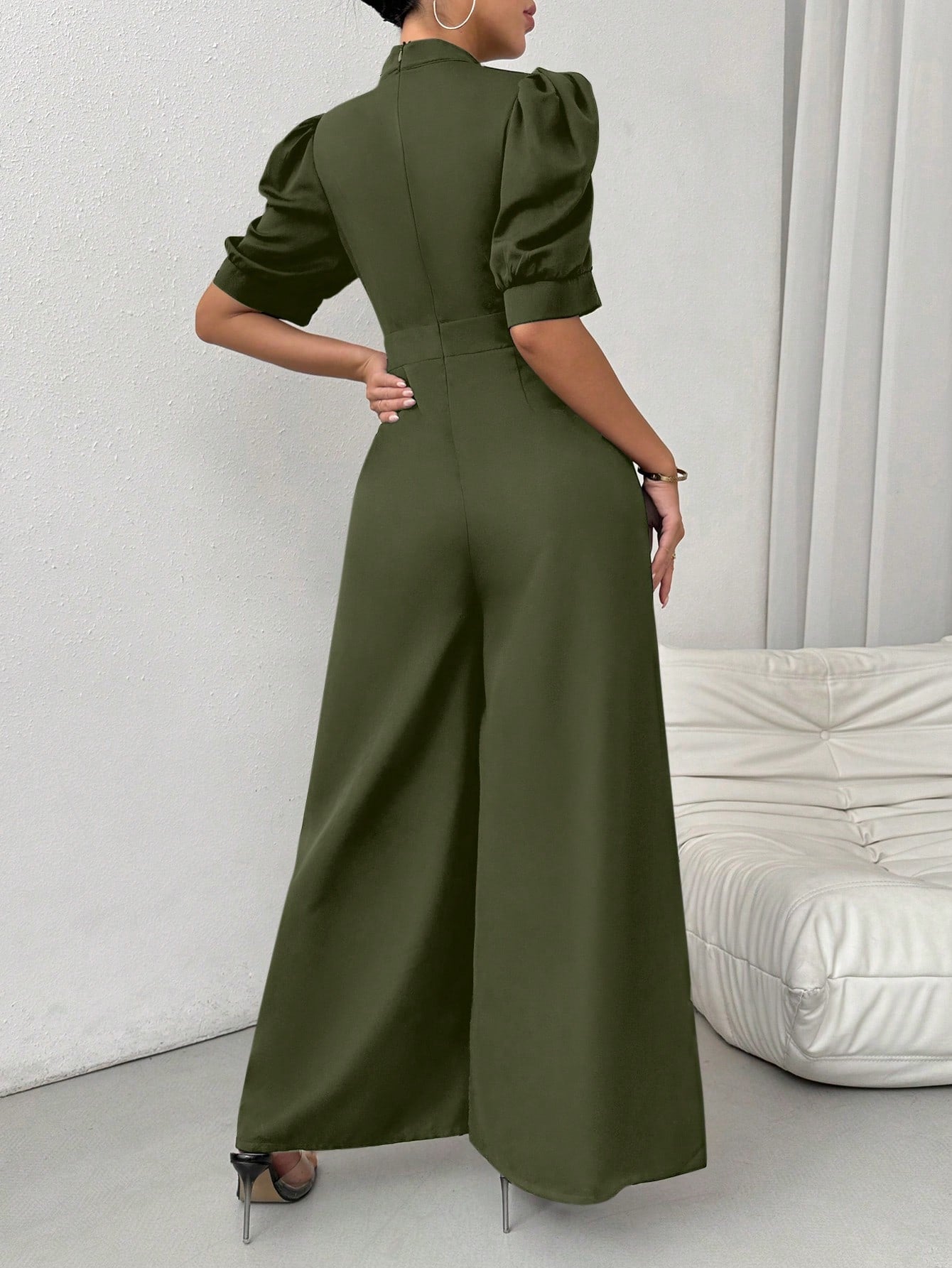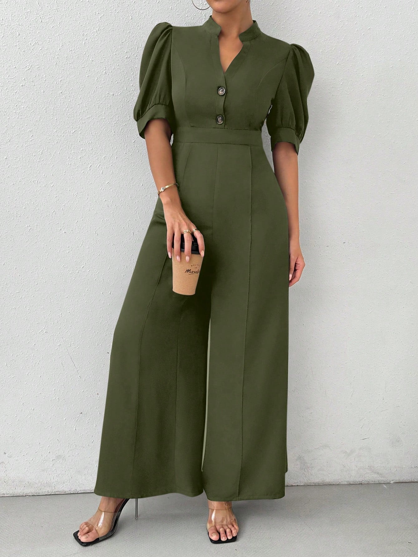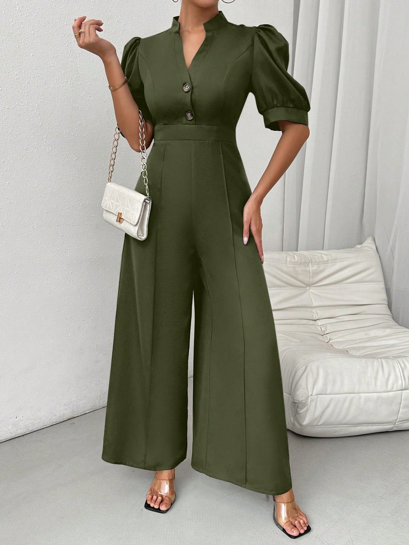 Raffinéa Women's Summer V-Neck Puff Sleeve Cinched Waist Wide Leg Jumpsuit