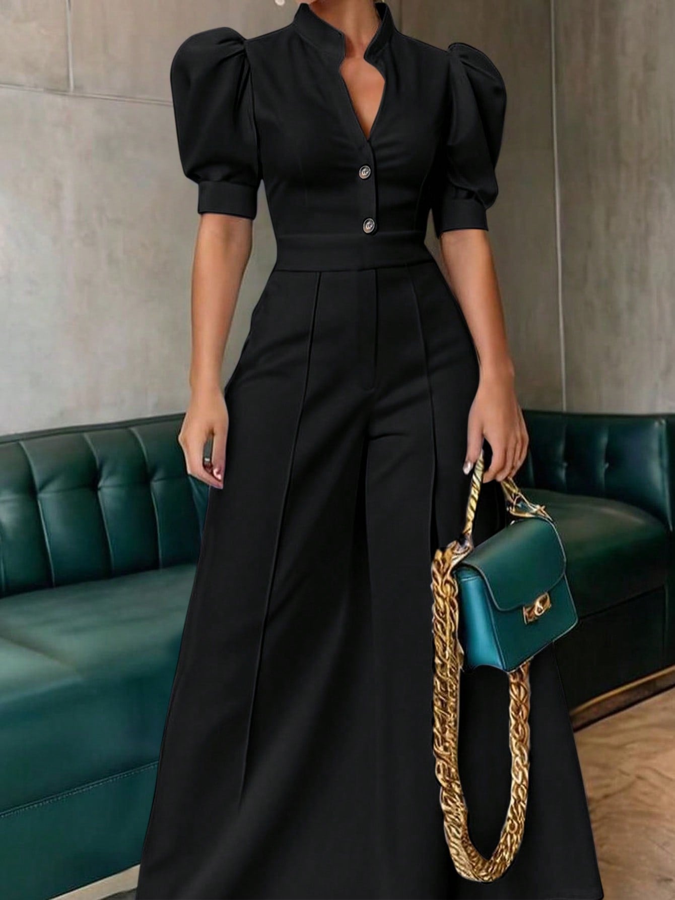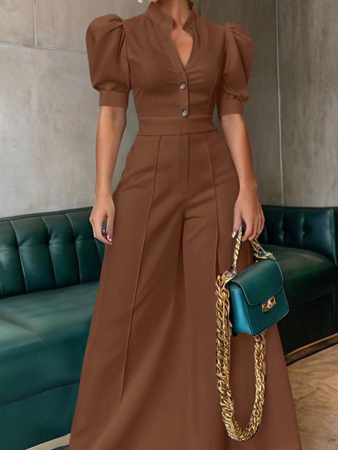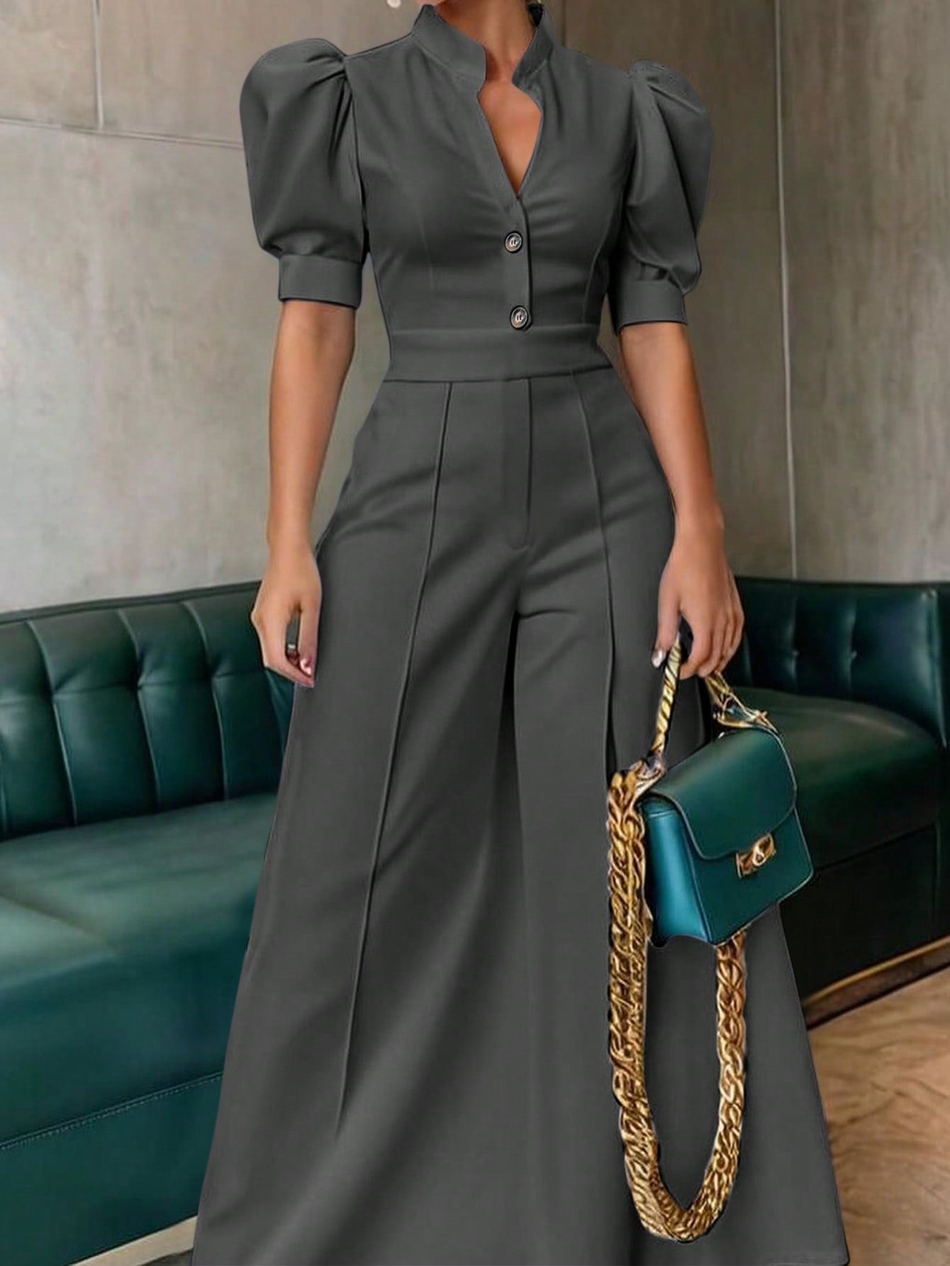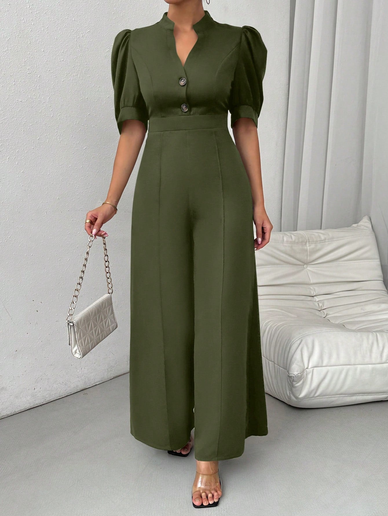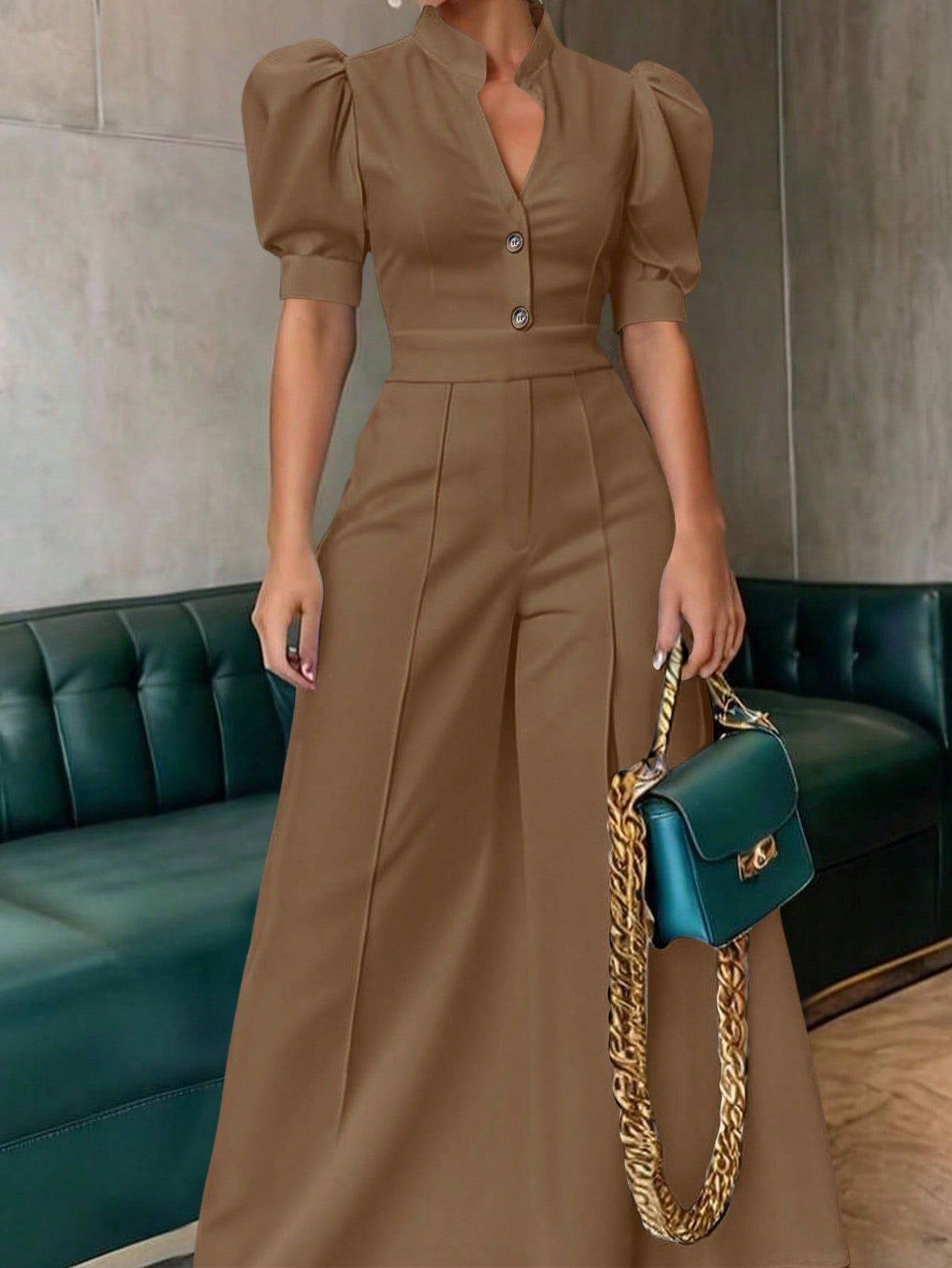 Raffinéa Women's Summer V-Neck Puff Sleeve Cinched Waist Wide Leg Jumpsuit