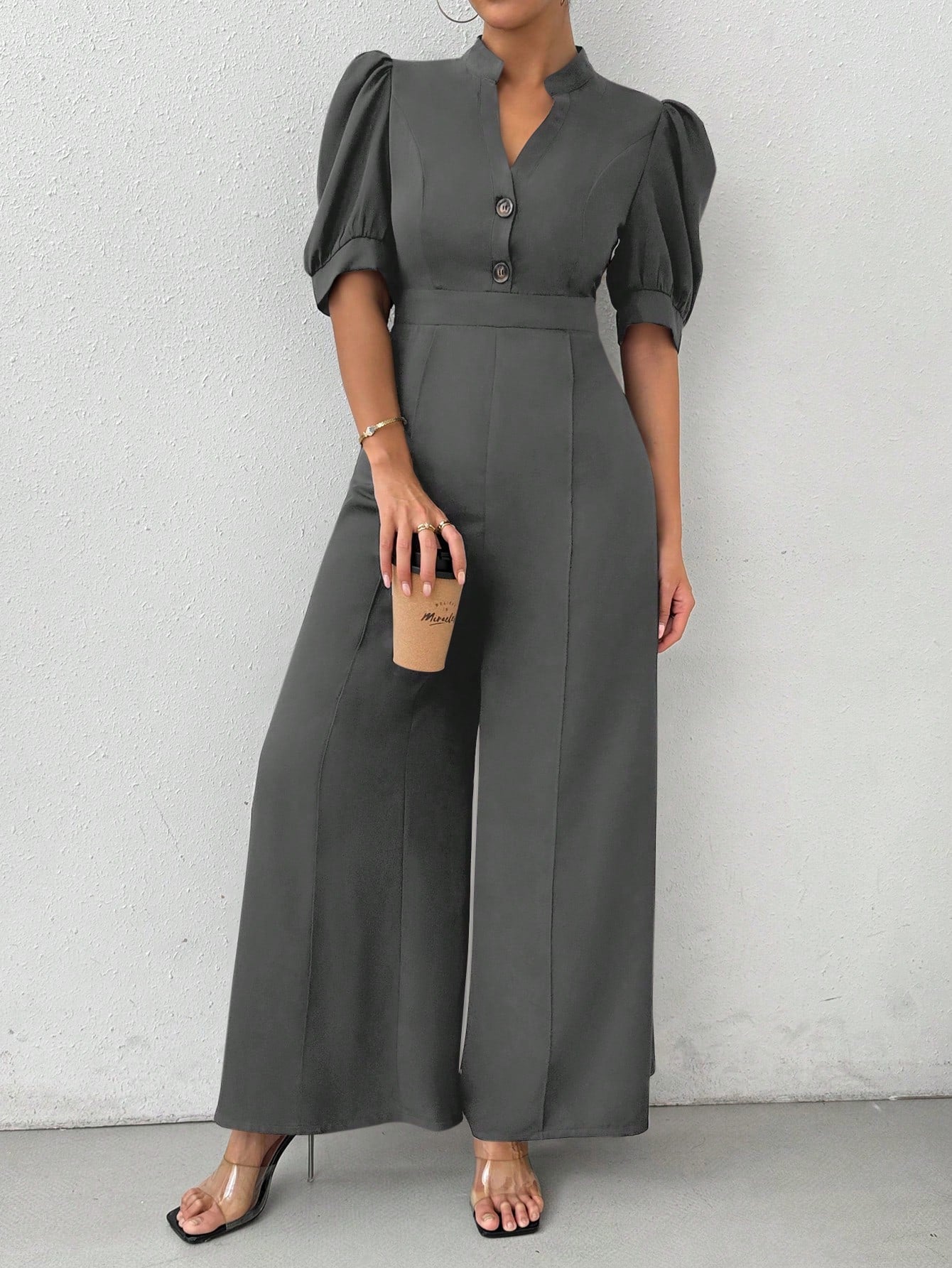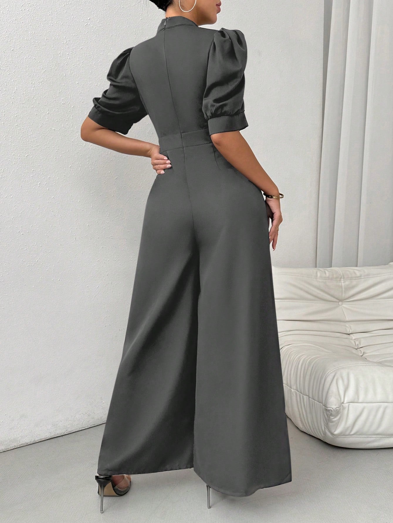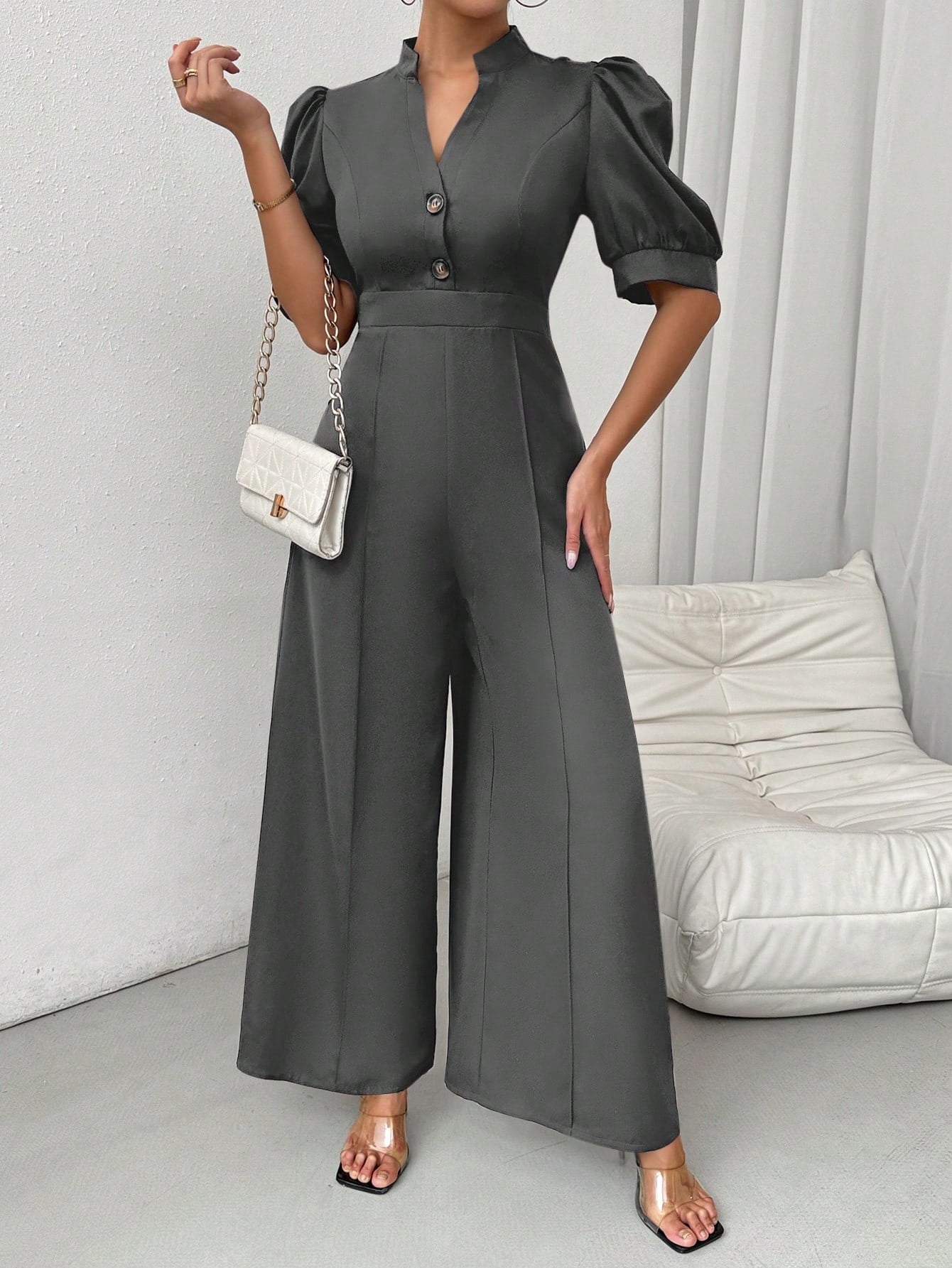 Raffinéa Women's Summer V-Neck Puff Sleeve Waisted Wide Leg Jumpsuit