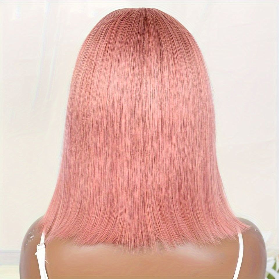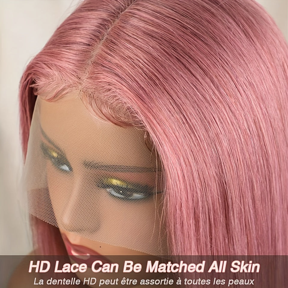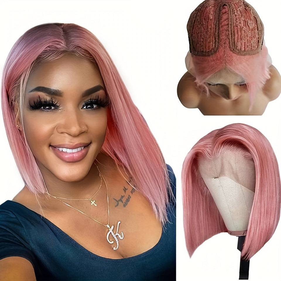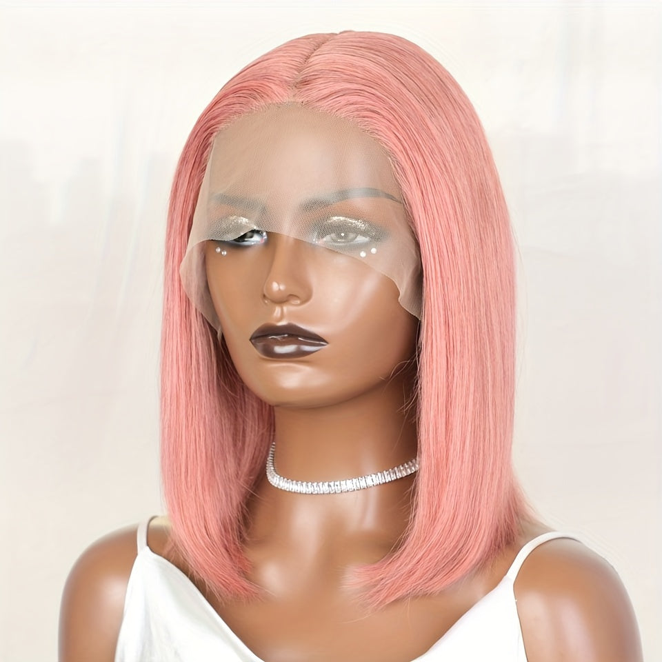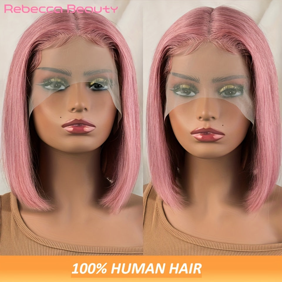 Rebecca Beauty Unisex-Adult Pink Bob Lace Front Wig 13*5*1 Transparent HD Lace - 150% Density Straight Human Hair Wig Pre-Plucked with Bleached Knots - Suitable for All People