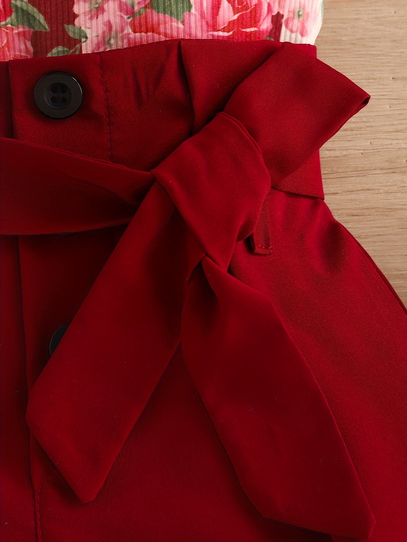 Red Rose Print Girls Outfit, Halter Neck Stripe Top & Belt Shorts Set Holiday Going Out 2PCS Summer Outdoor Clothes