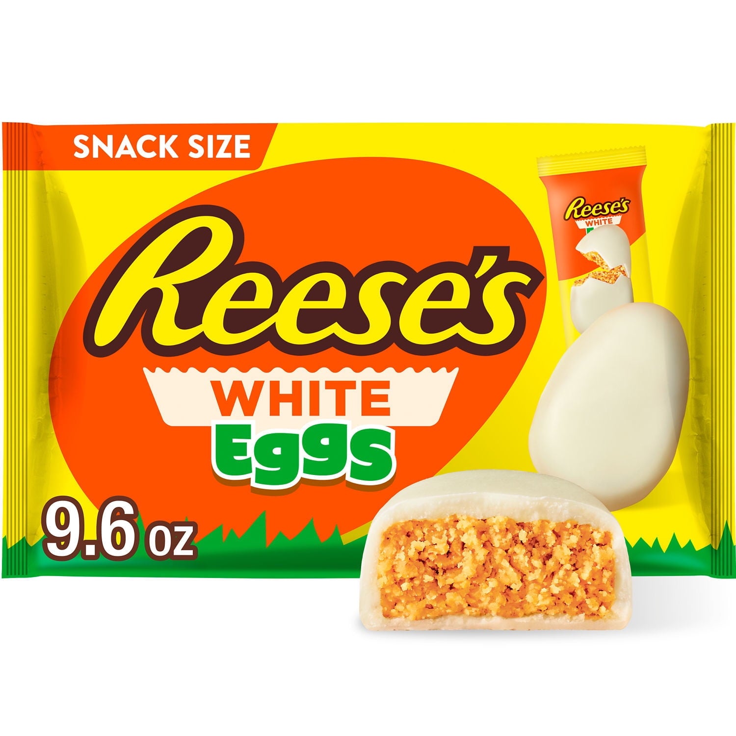 - Contains one (1) 9.6-ounce bag of REESE'S White Creme Snack Size Peanut Butter Eggs Candy