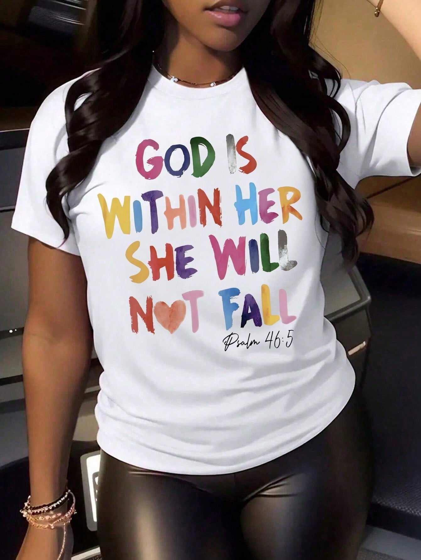 Relaxiva Slogan Printed Round Neck Short Sleeve Casual T-Shirt GOD IS WITHIN HER SHE WILL NOT FALL Psalm 465 Graphic Tees Women Tops