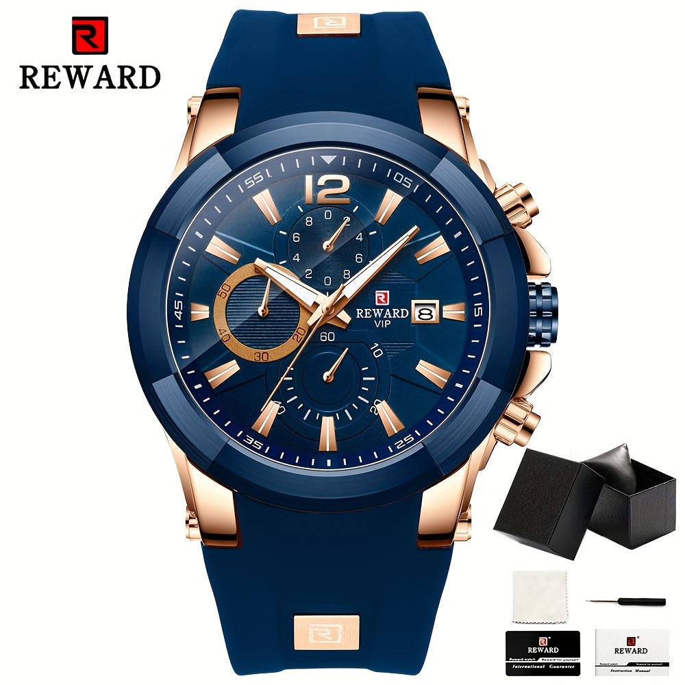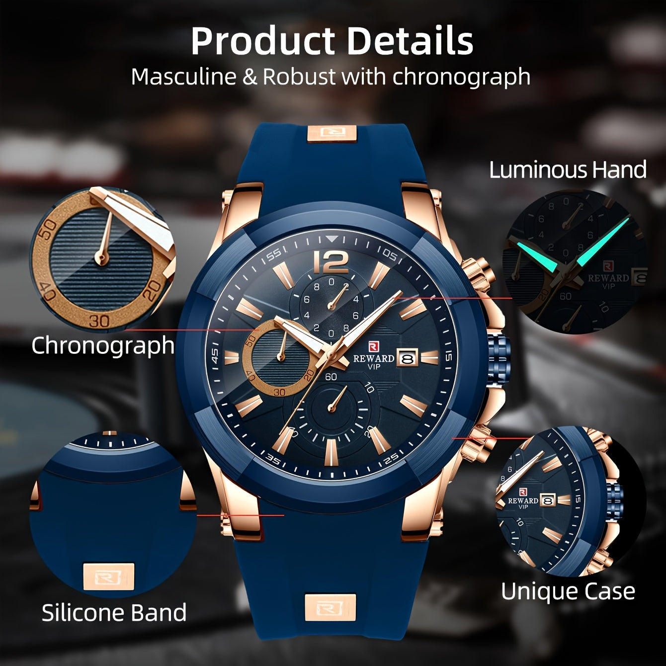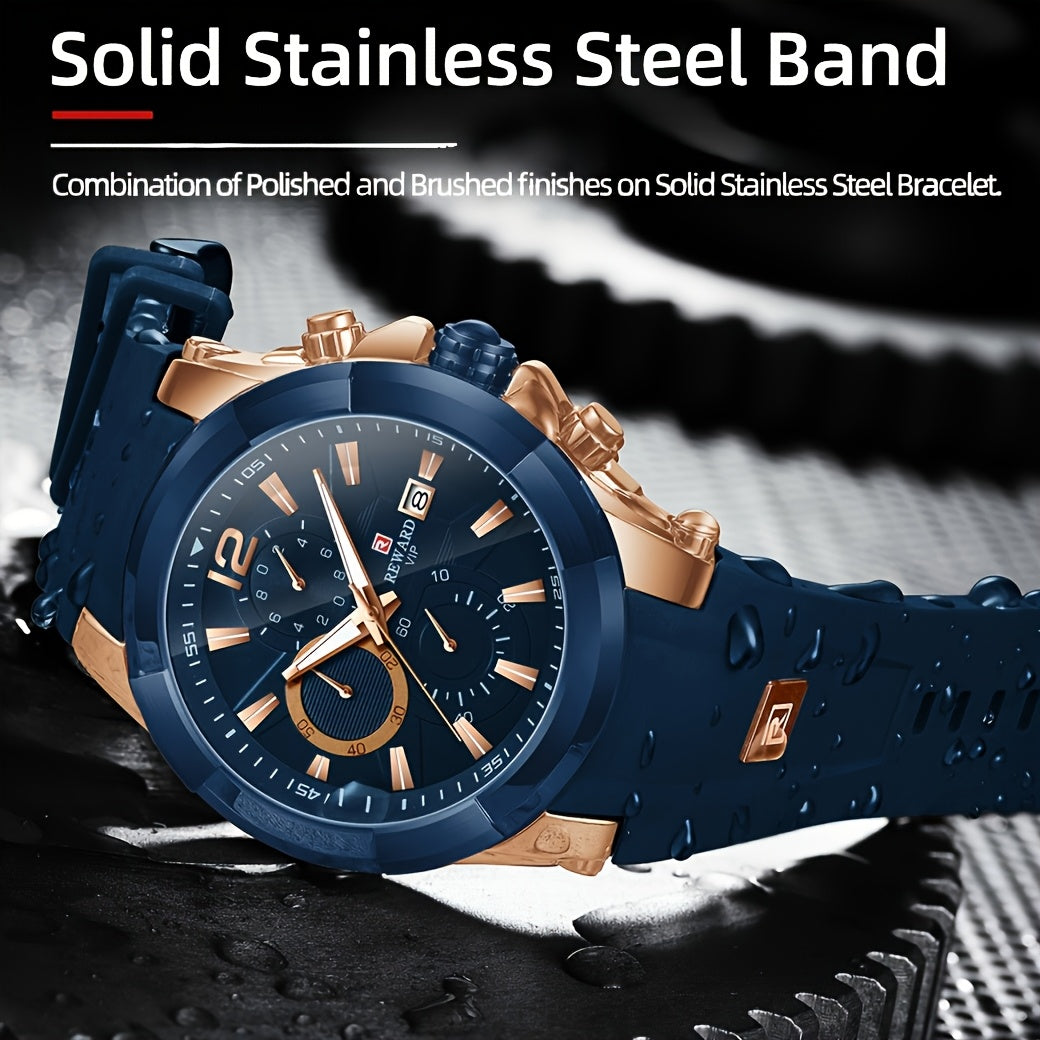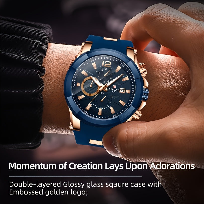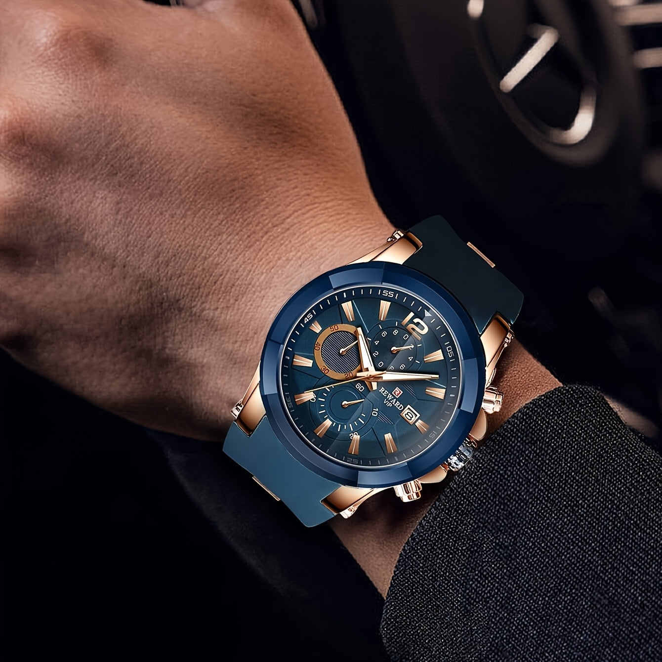 REWARD Men's Luxury Chronograph Sport Watch - Blue & Golden Accents, Quartz Movement with Date/Stopwatch/Second Timer, Casual Elegant Design for Casual Attire, Bling Watch, Versatile Wristwatch, Bold Accent Details, Durable Finish