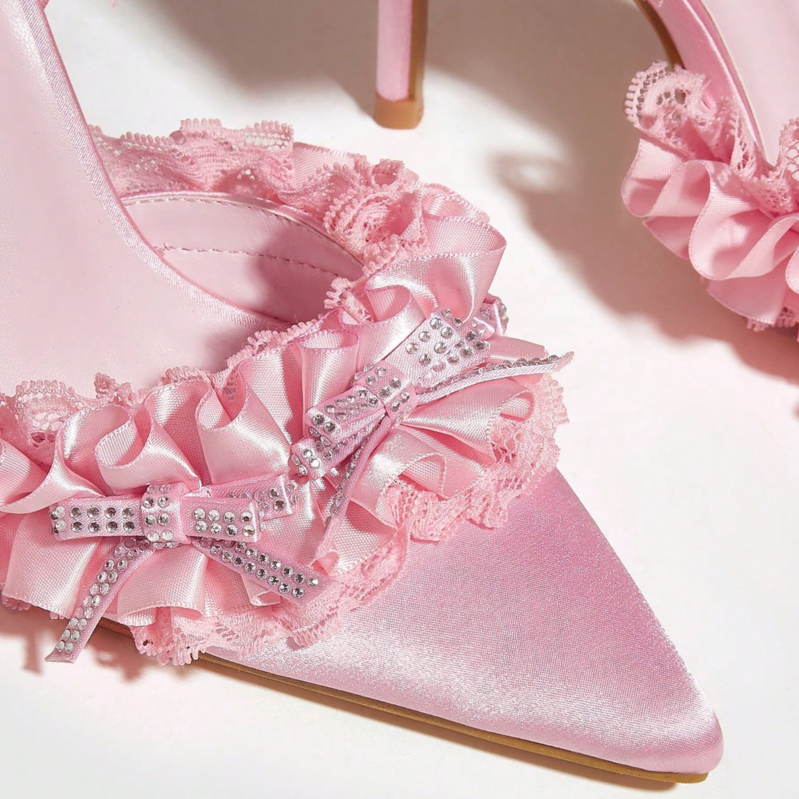 Rhinestone Bow High Heel Sandals Stiletto Heel Pointed Heels Women Black Pink Satin Surface 11cm