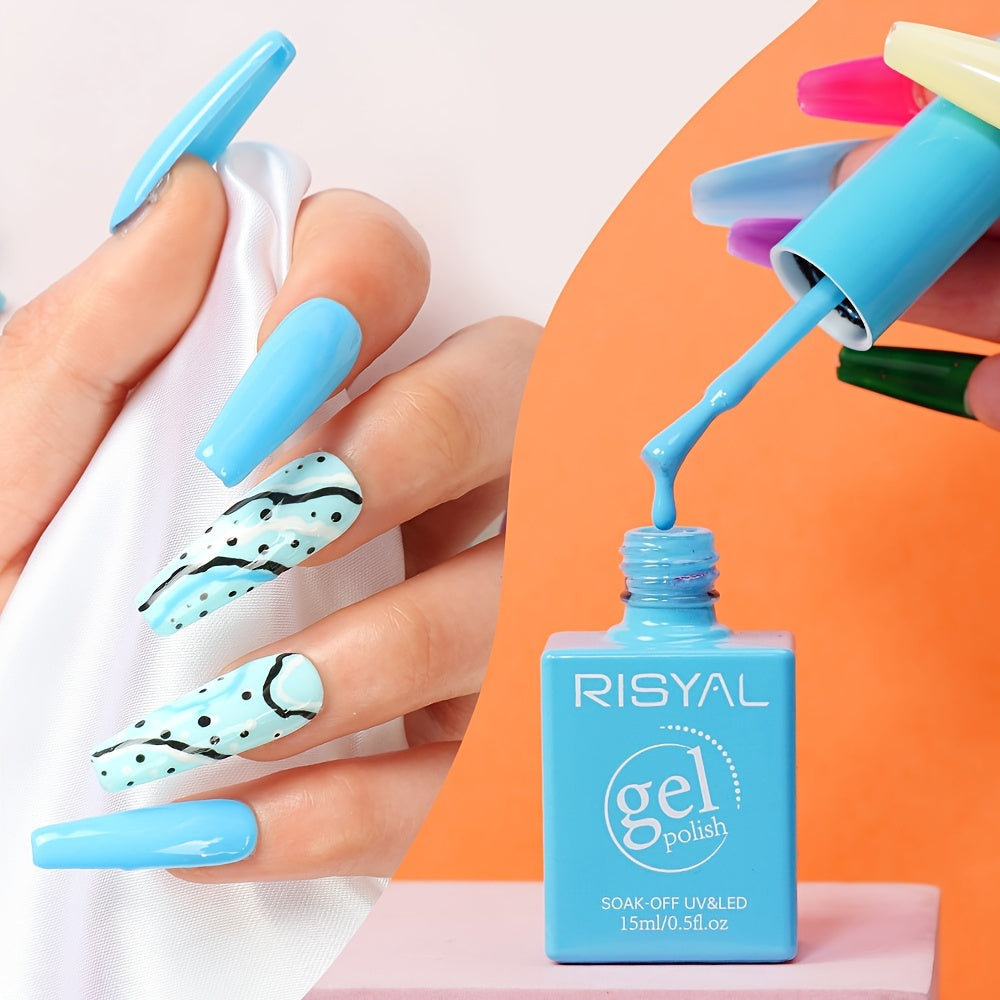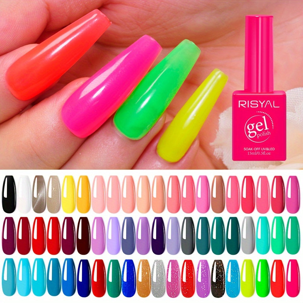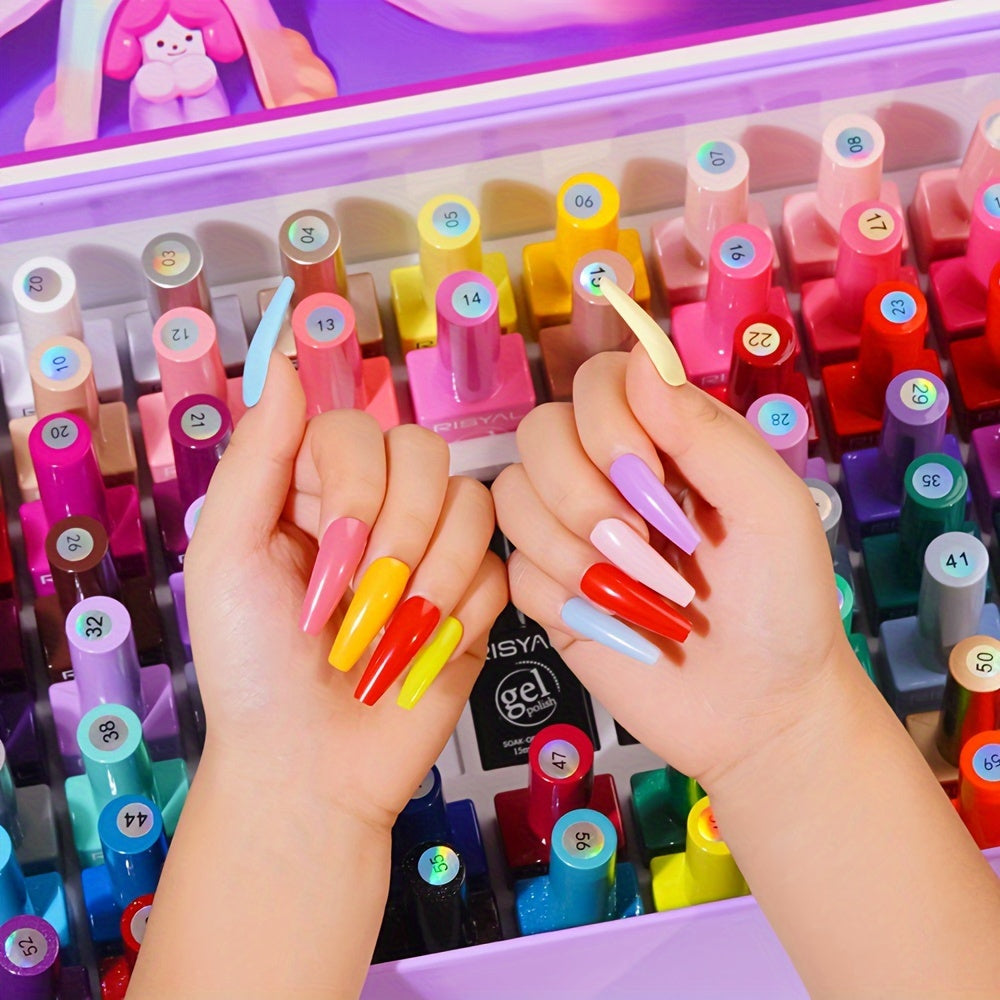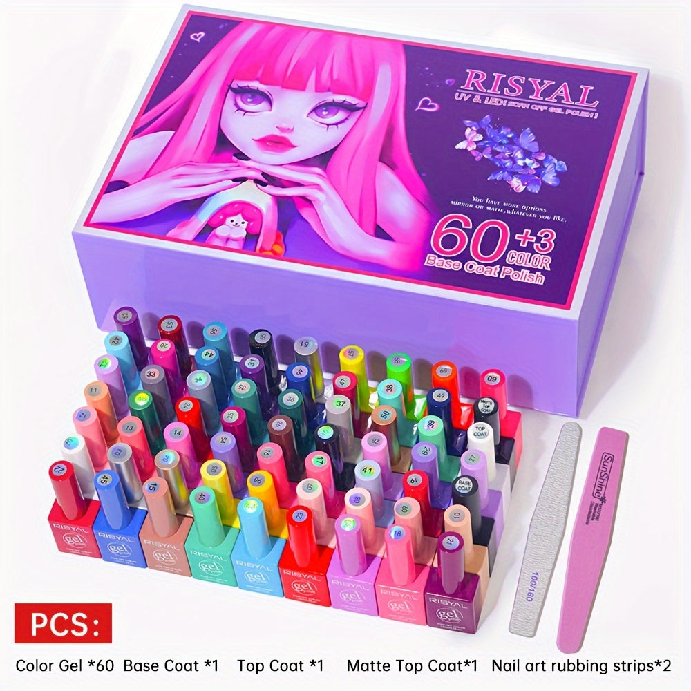 RISYAL 65pcs Nail Art Set (60 Color Gels + 1 Base Gel + 1 Top Coat + 1 Matte Top Coat + 2 Nail Files) 15Ml*63 Bottles, Low Odor, Long-Lasting Manicure Gift Set for Home Salon.