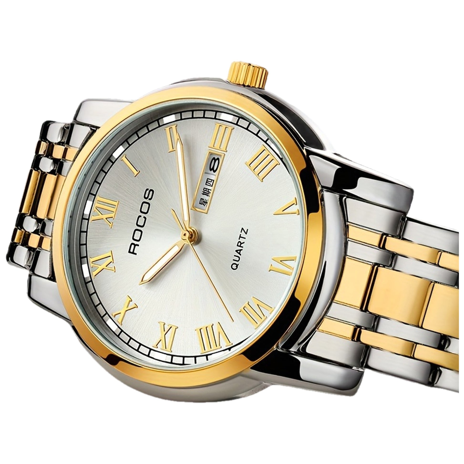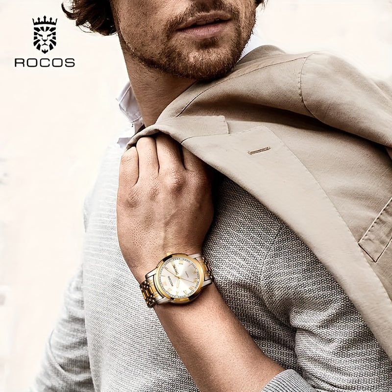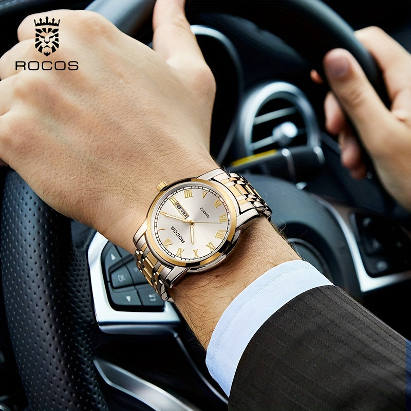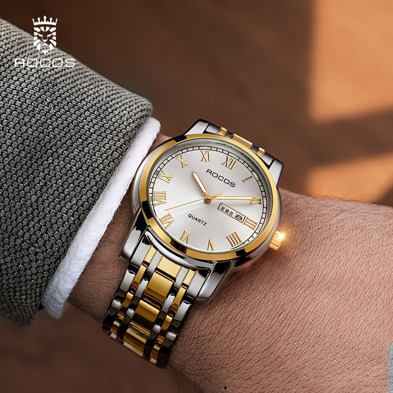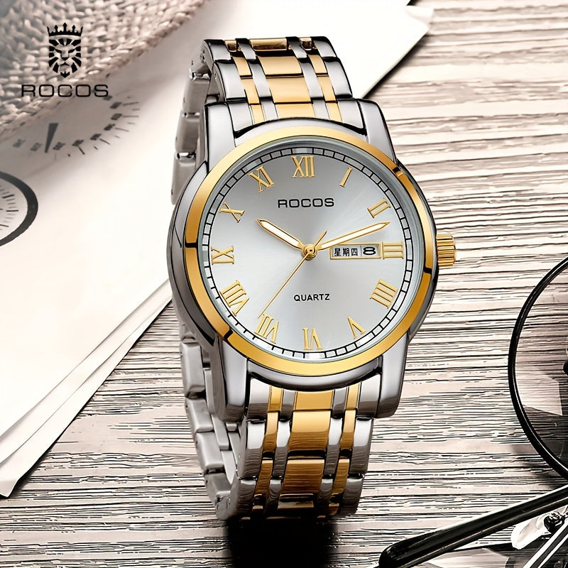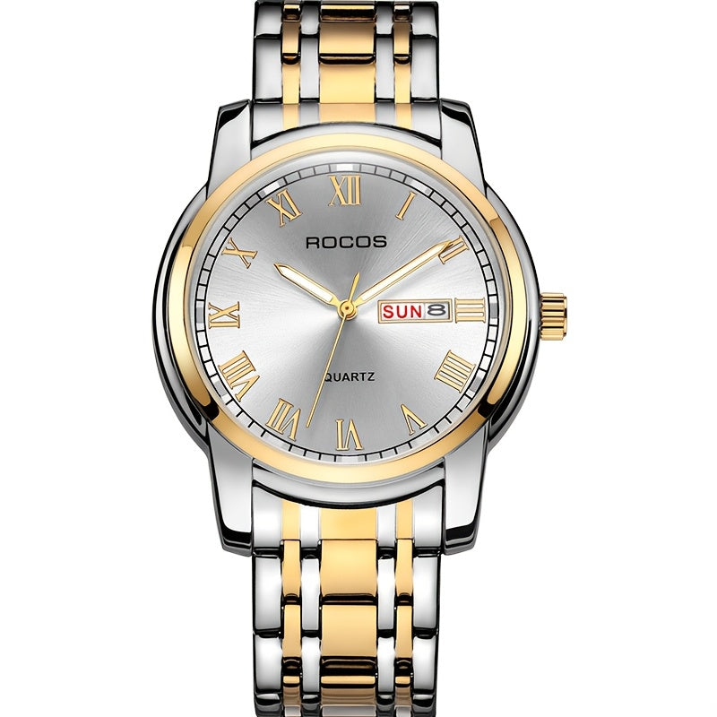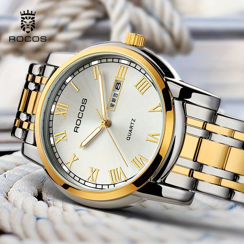 ROCOS Brand Simple Business Men'S Watch Retro Roman Scale Quartz Watch Steel Strap Men'S Watch Golden Case Calendar Week Display Gift For Men