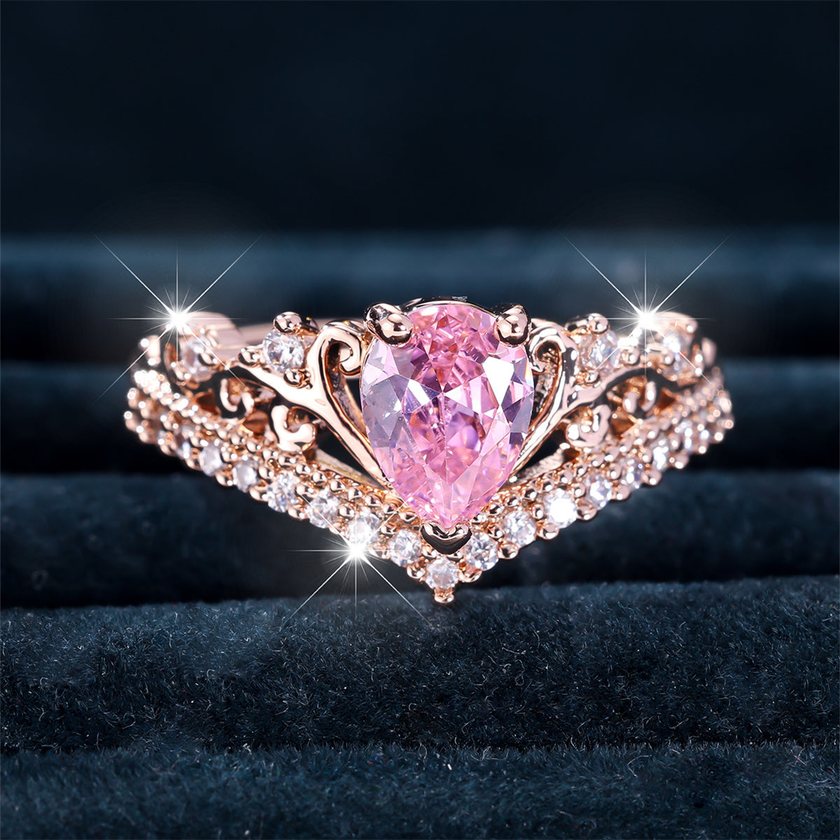 Rose Golden Princess Cut Water Droplet Pink Zirconia V-Shaped Ring Proposal Engagement Party Matching Ring