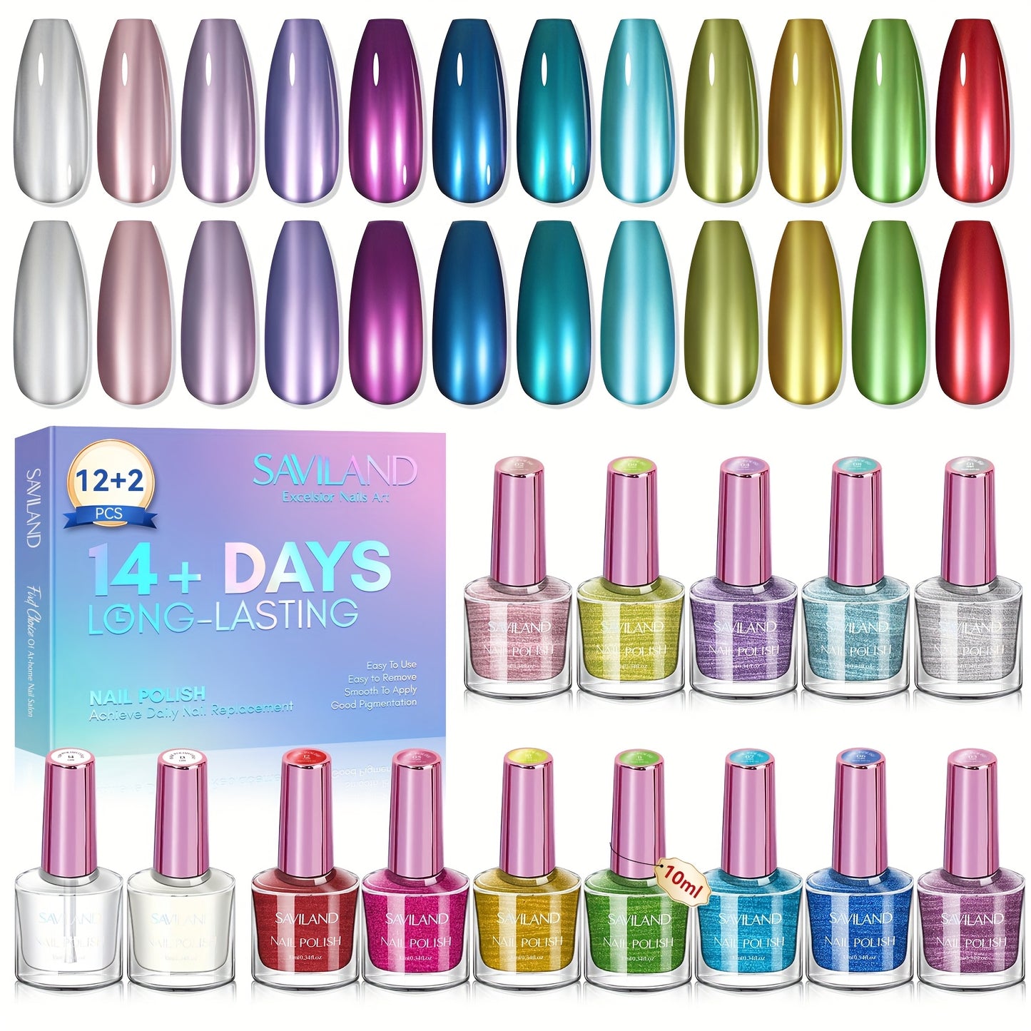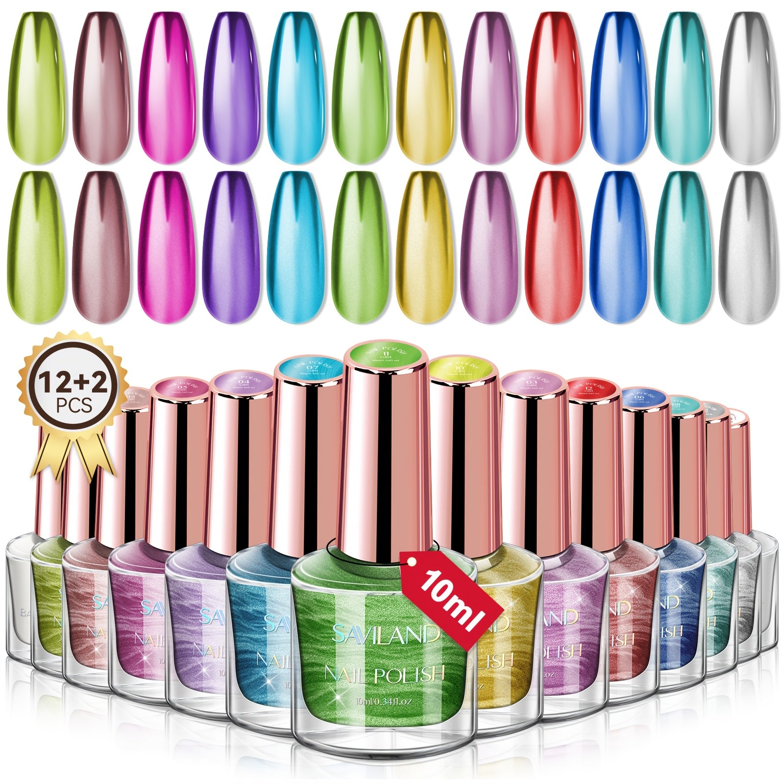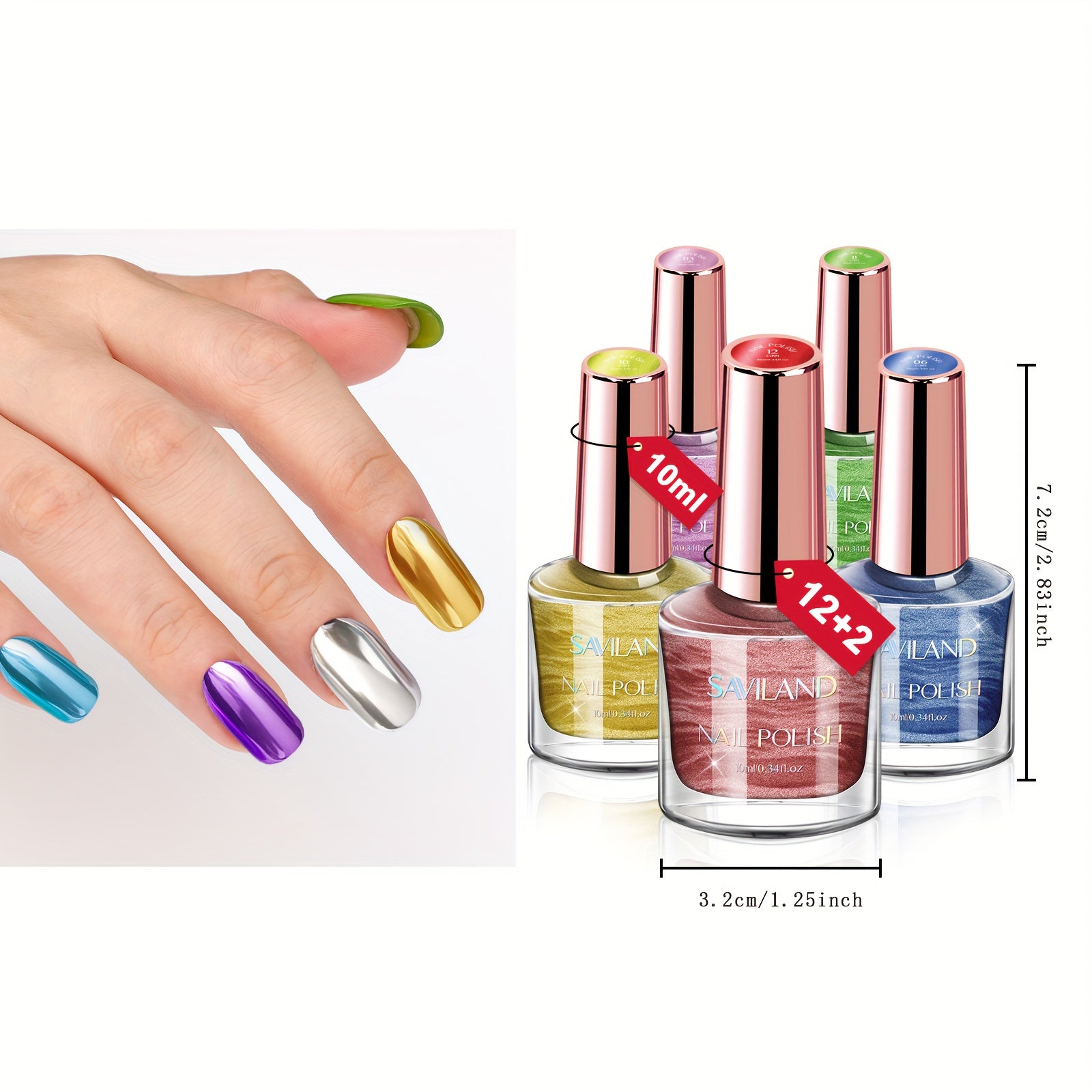 SAVILAND Chrome Nail Polish Collection: 12 Shades of Reflective Metallic Glitter Nail Polish 0.34Oz Holographic Red, Silver, Pink Nail Polish Fast-Drying Base And Top Coat for Fingernails, Toenails, And French Manicure Designs
