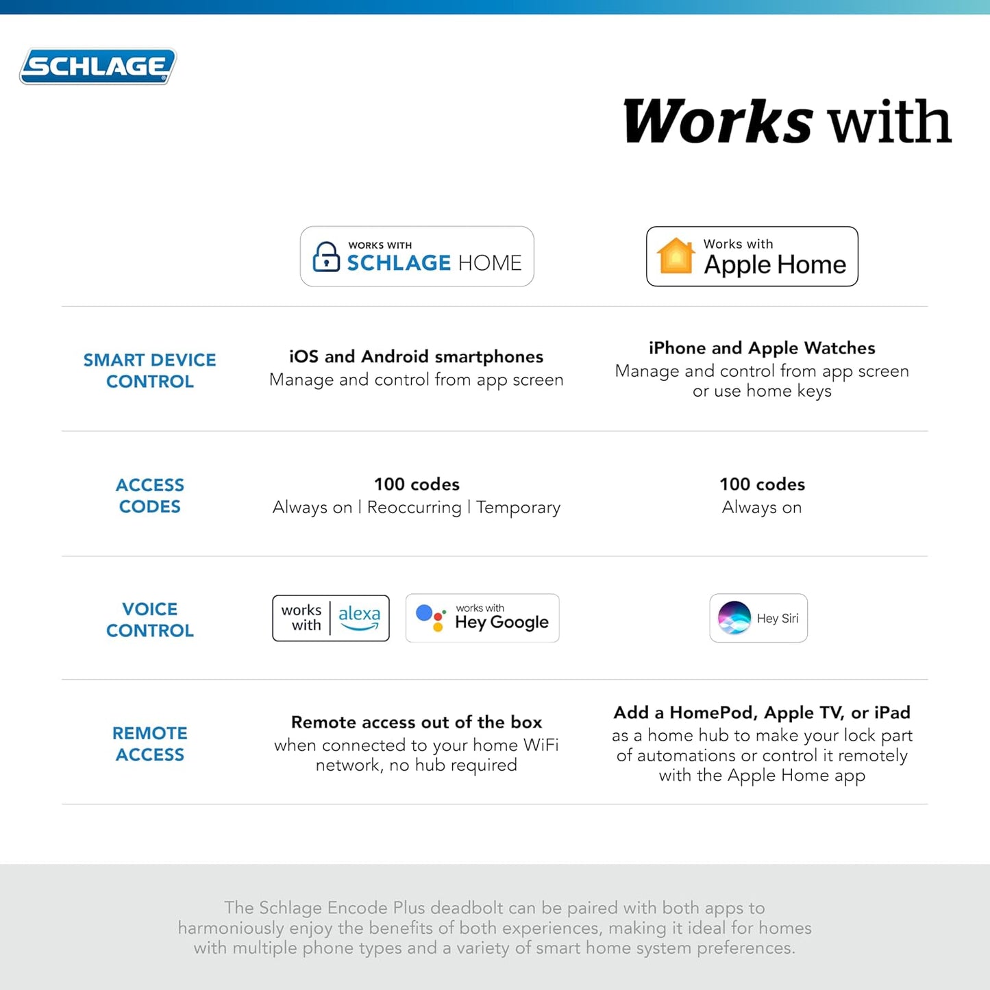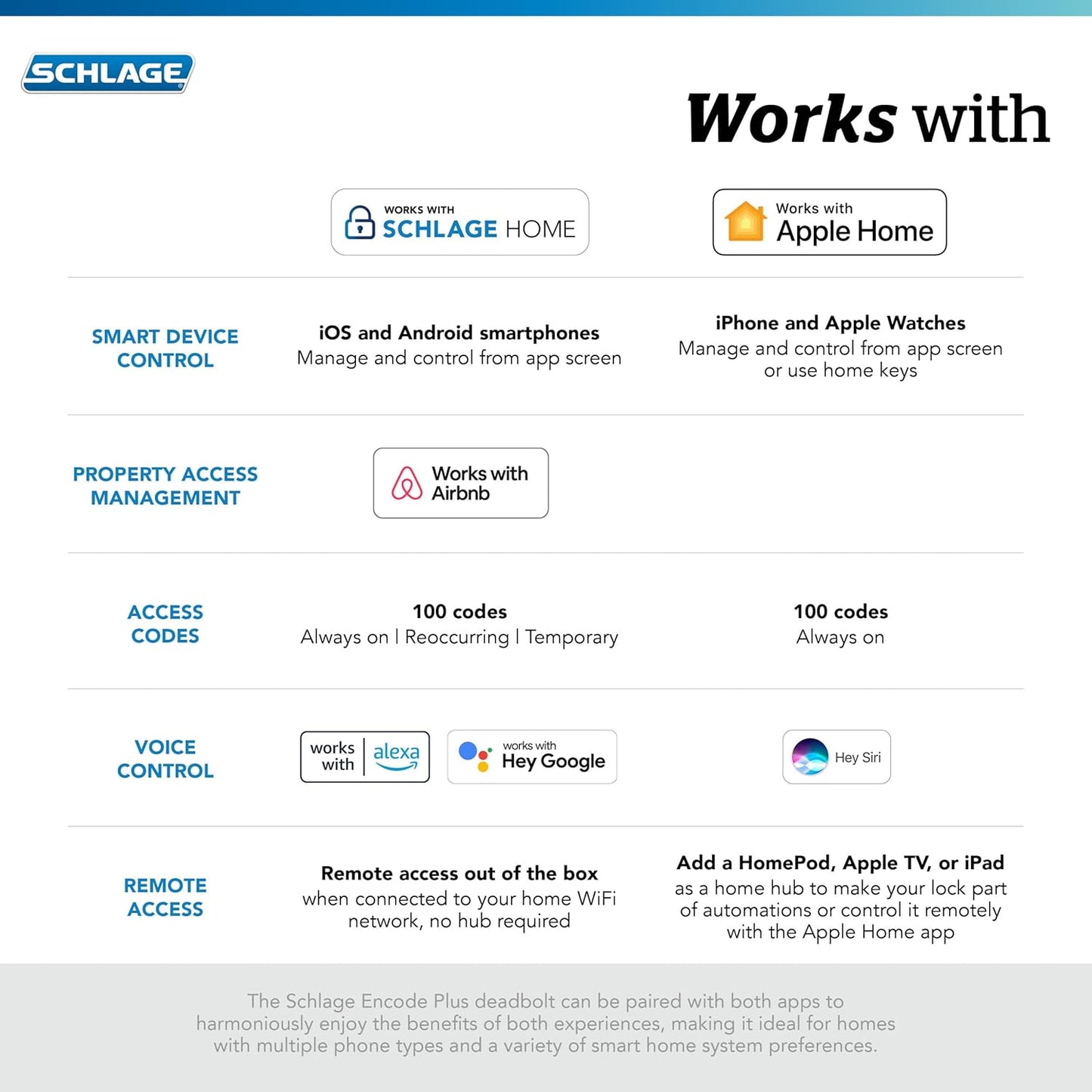 PEACE OF MIND: Lock and unlock from anywhere, manage up to 100 access codes, view lock history, receive customizable notifications and easily manage multiple locks at once - all when paired to the Schlage Home app and connected to a secure WiFi network