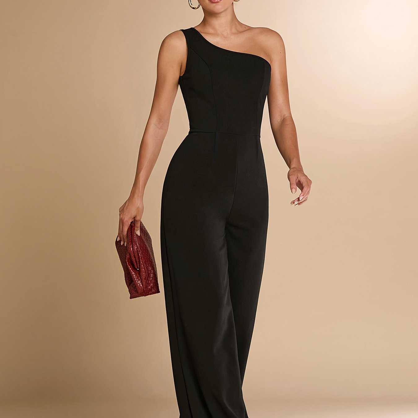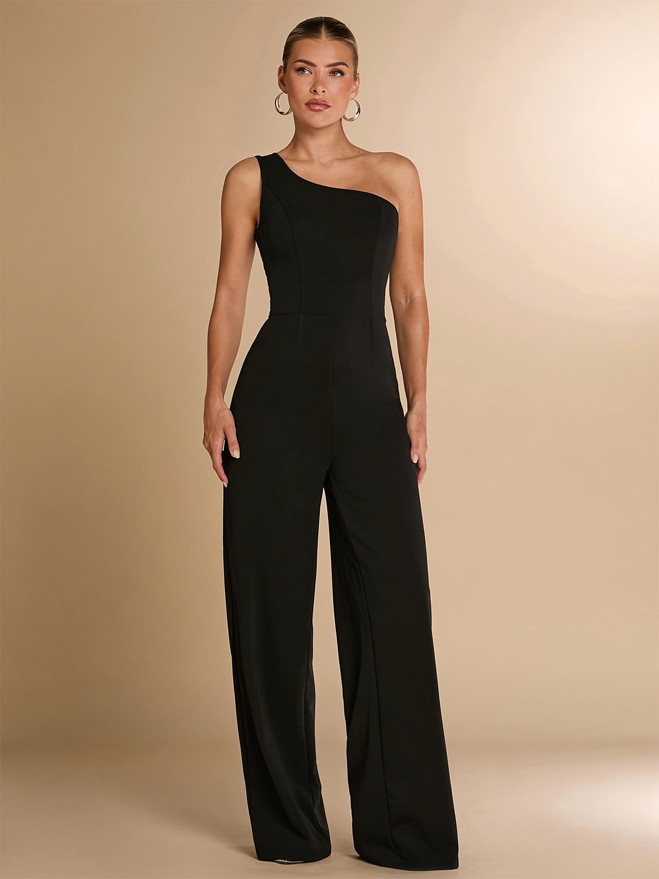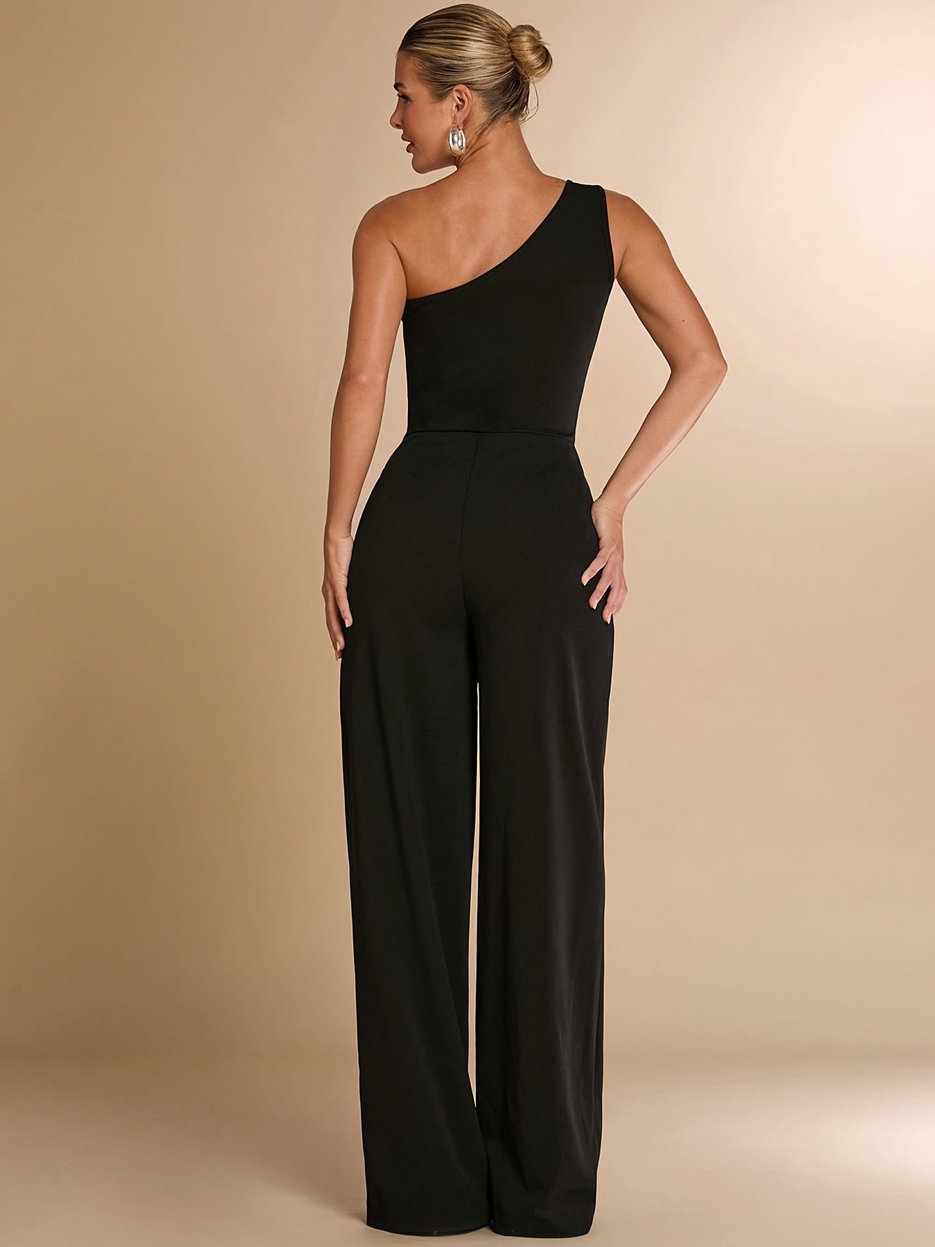 [Seasonal Versatility] Elegant Black One-Shoulder Jumpsuit for Women - High Elasticity Polyester Blend, Wide-Leg Design, Perfect for Cocktail Parties, Romantic Dates, and Fall/Winter Layering, Machine Washable, Asymmetric Style, Chic and Versatile for All